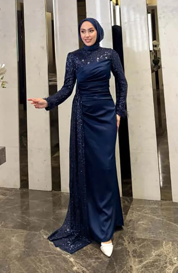 فستان سهرة ساتان لامع 4667-02 أزرق داكن 4667-02