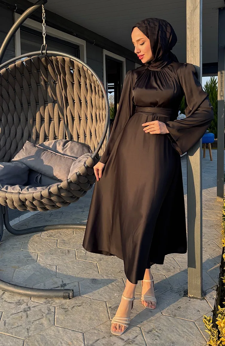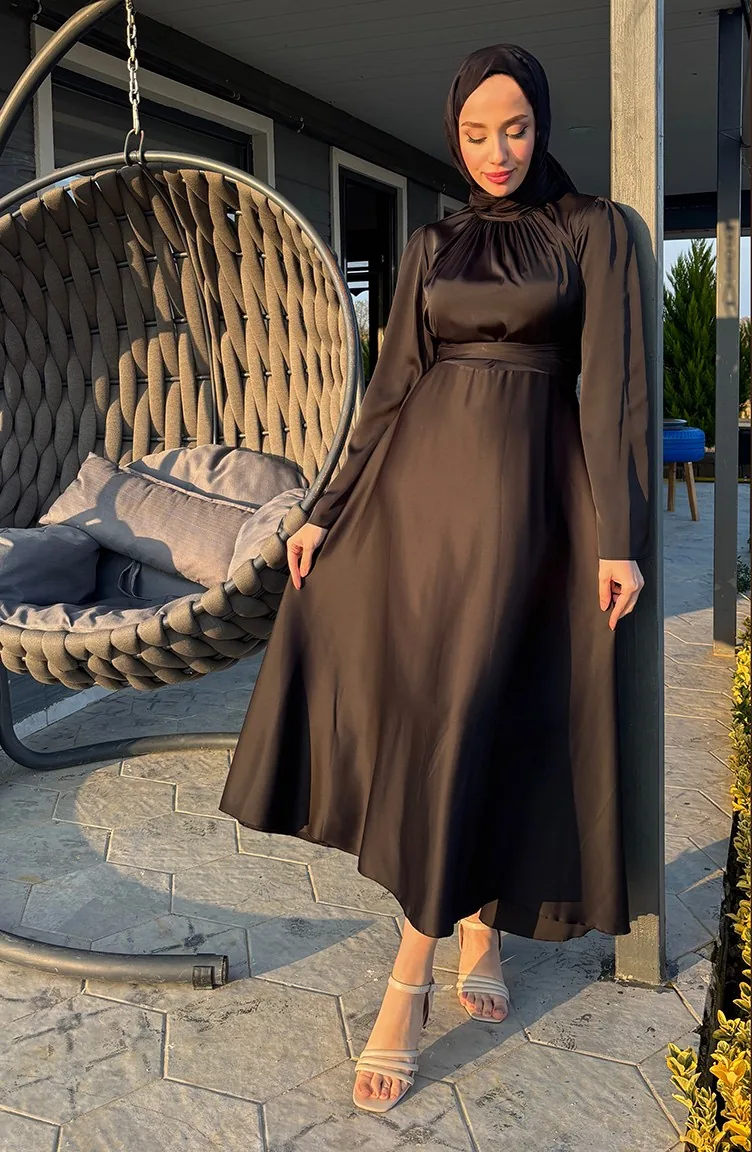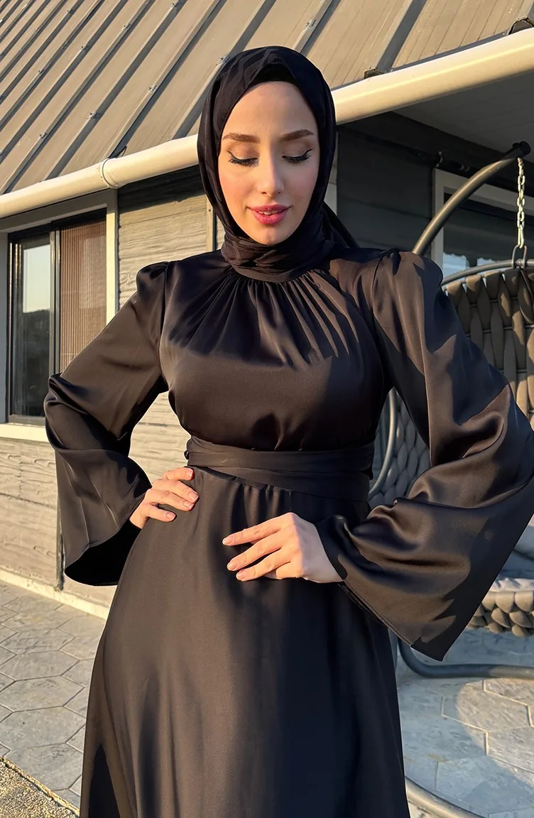 فستان سهرة ستان بتفاصيل من الامام 5514-06 لون اسود 5514-06