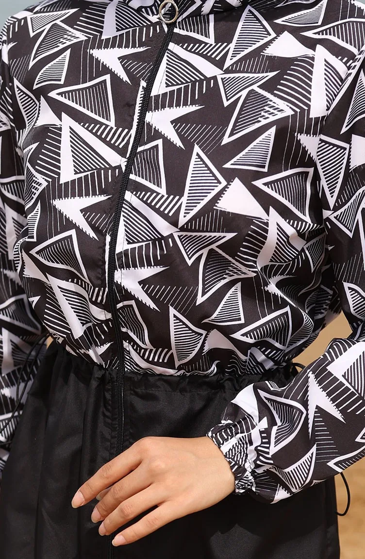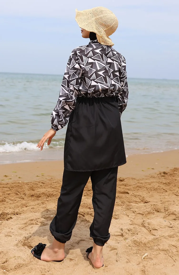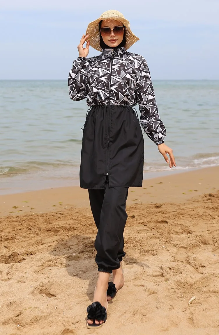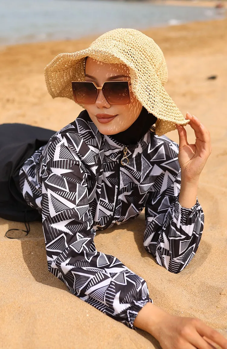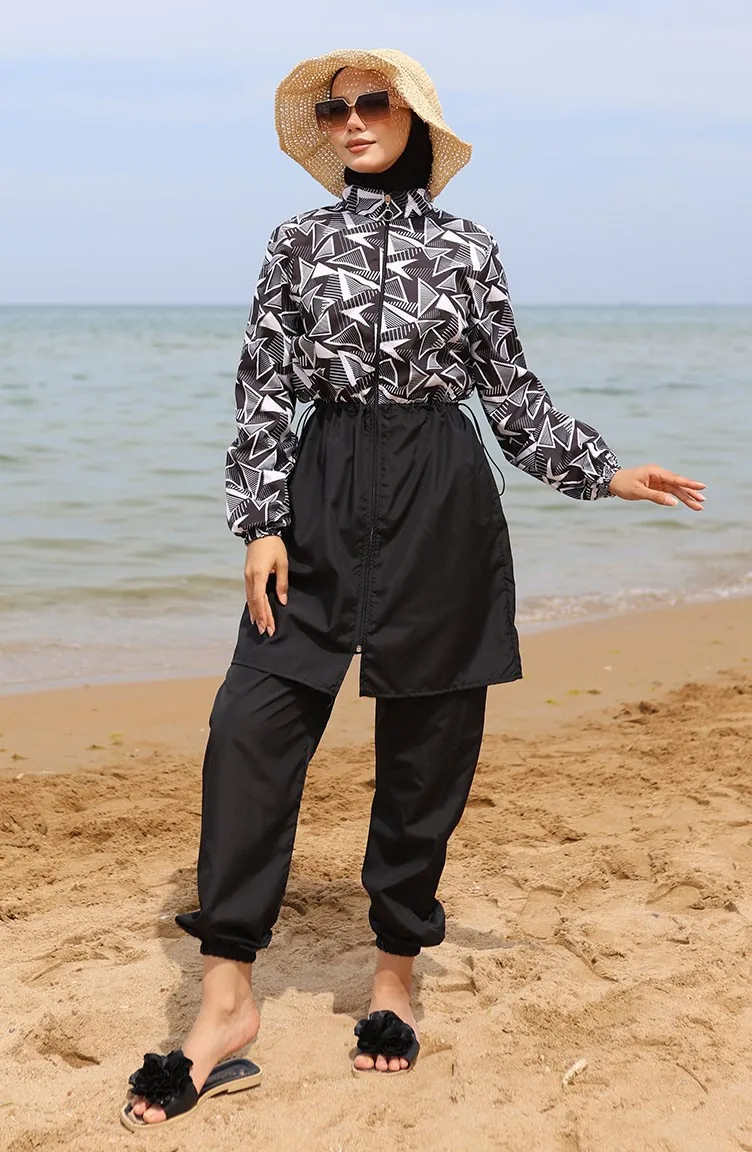ميليس ملابس سباحة للحجاب بتصميم مطاط عند الخصر 5042-01 لون أسود وأبيض 5042-01
