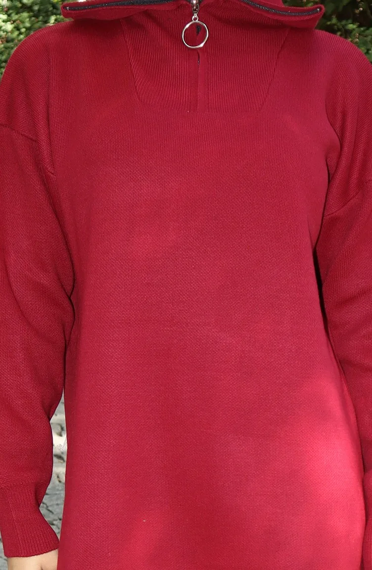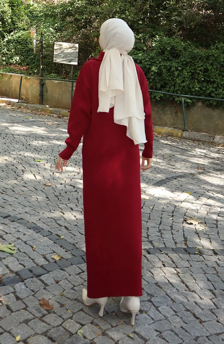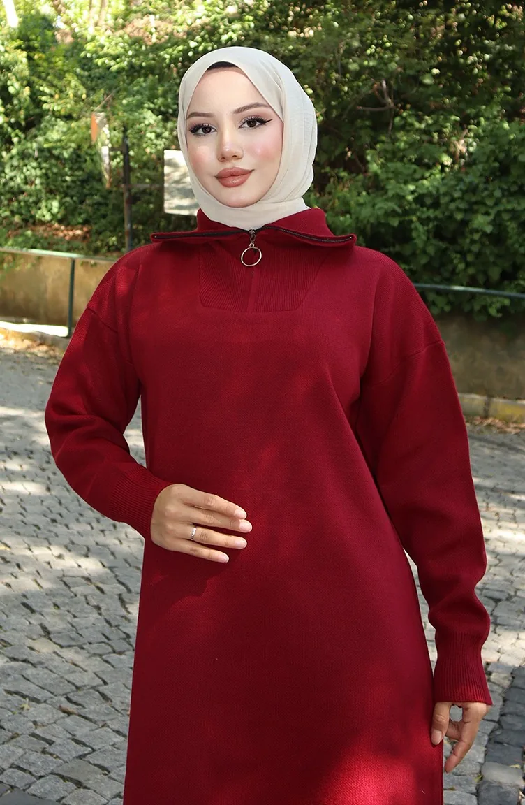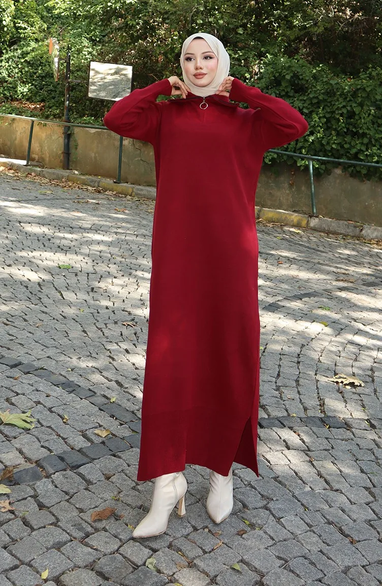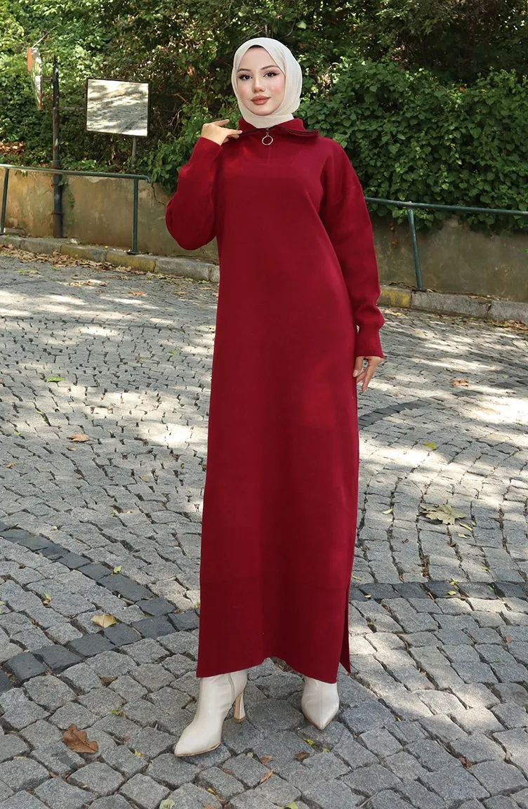 فستان محبوك بياقة مدورة 0511-06 أحمر كلاريت 0511-06