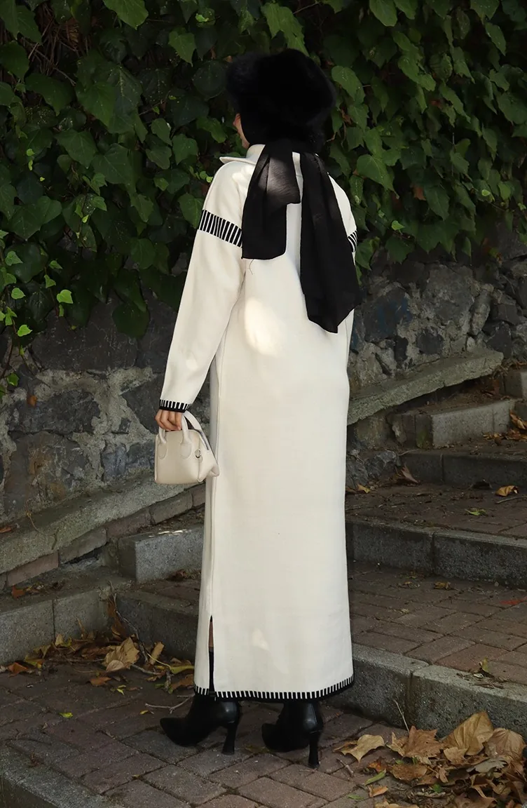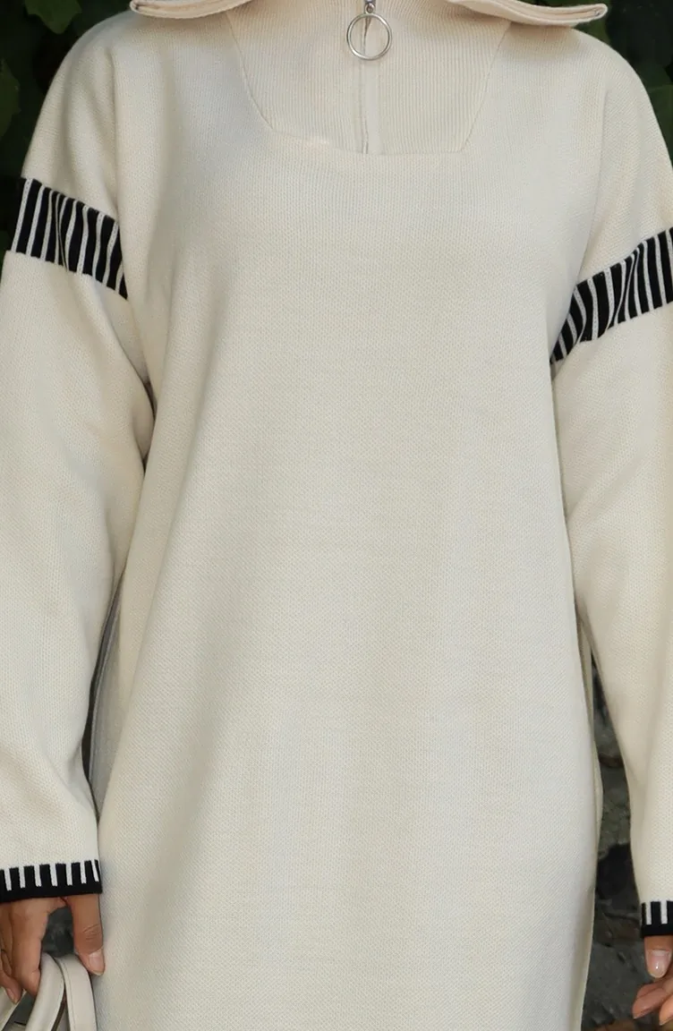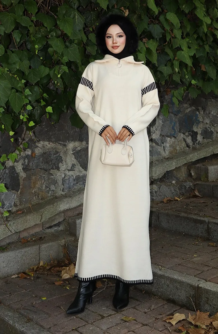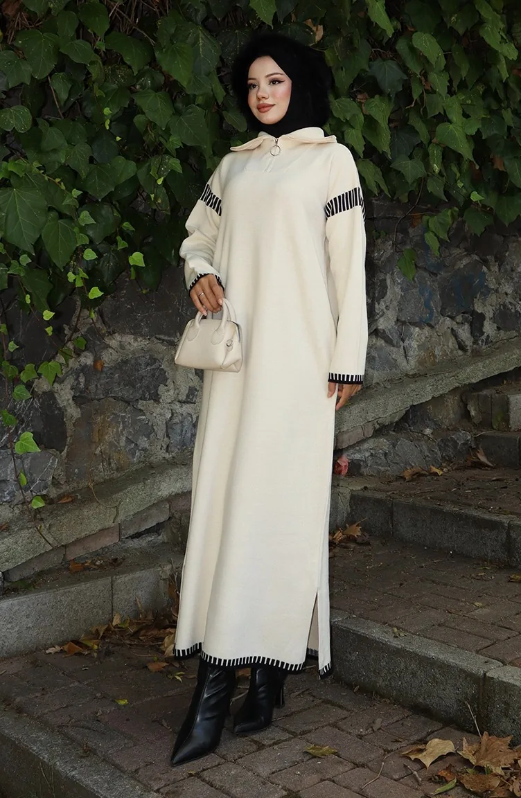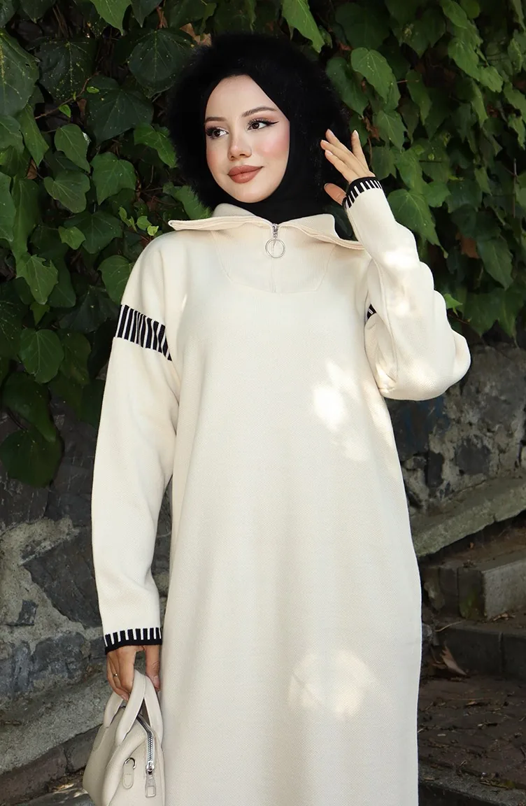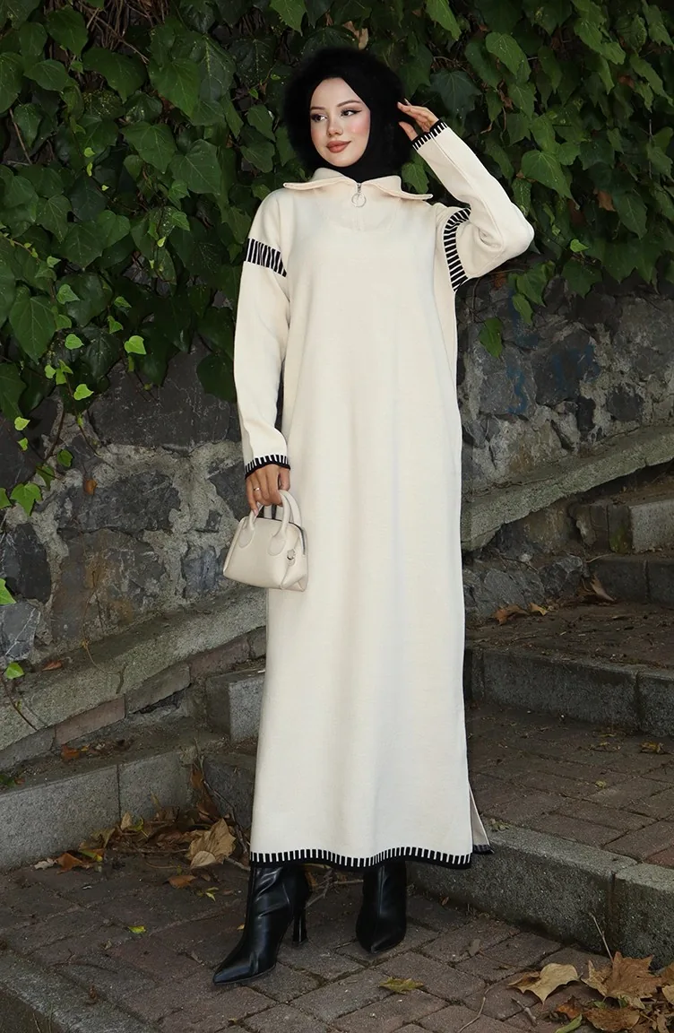فستان محبوك بياقة مدورة مع رباط 0508-01 بيج 0508-01