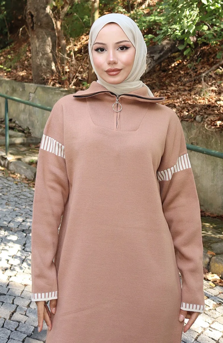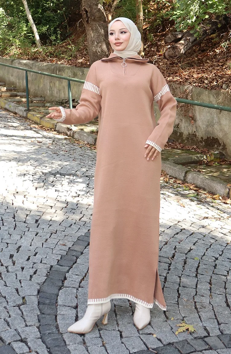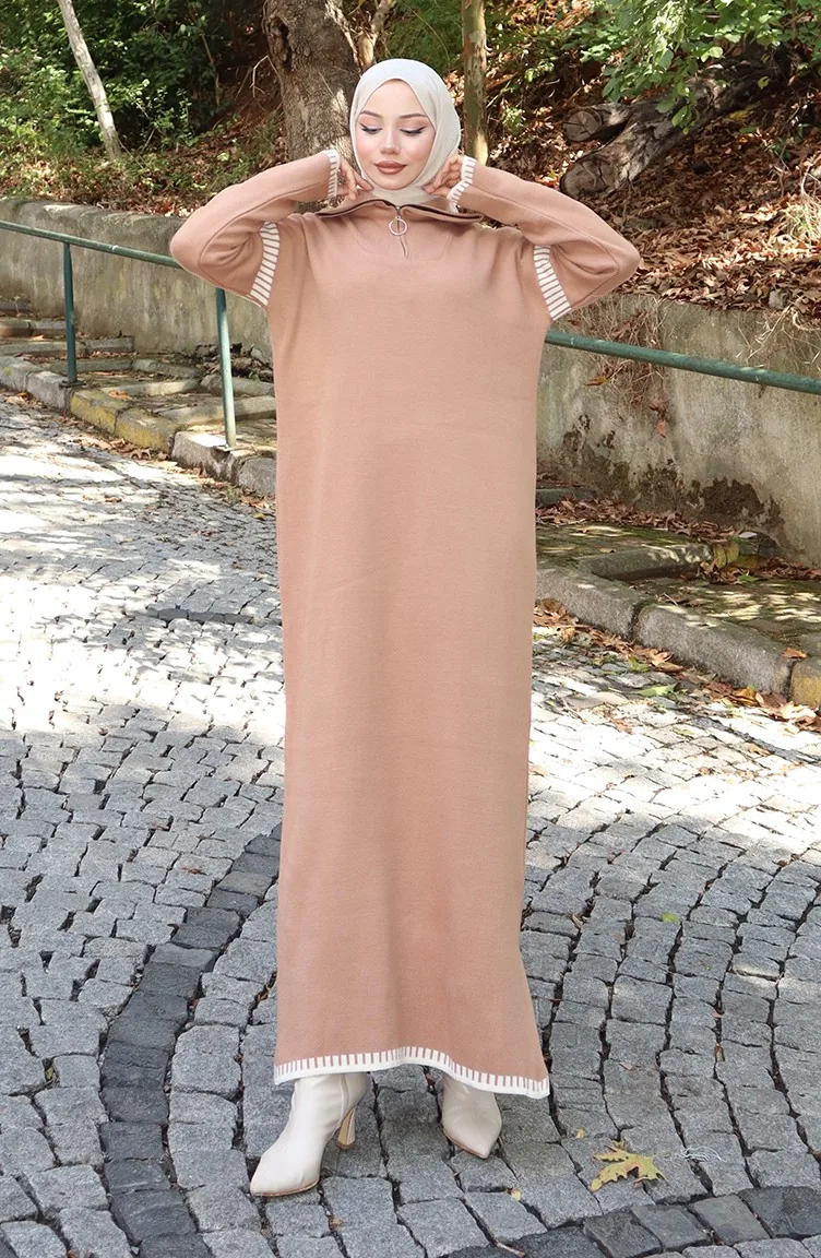 فستان محبوك بياقة مدورة مزين 0508-02 بلون القهوة بالحليب 0508-02