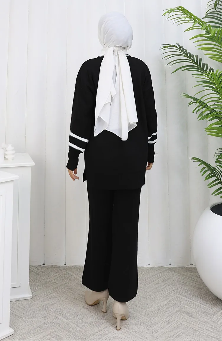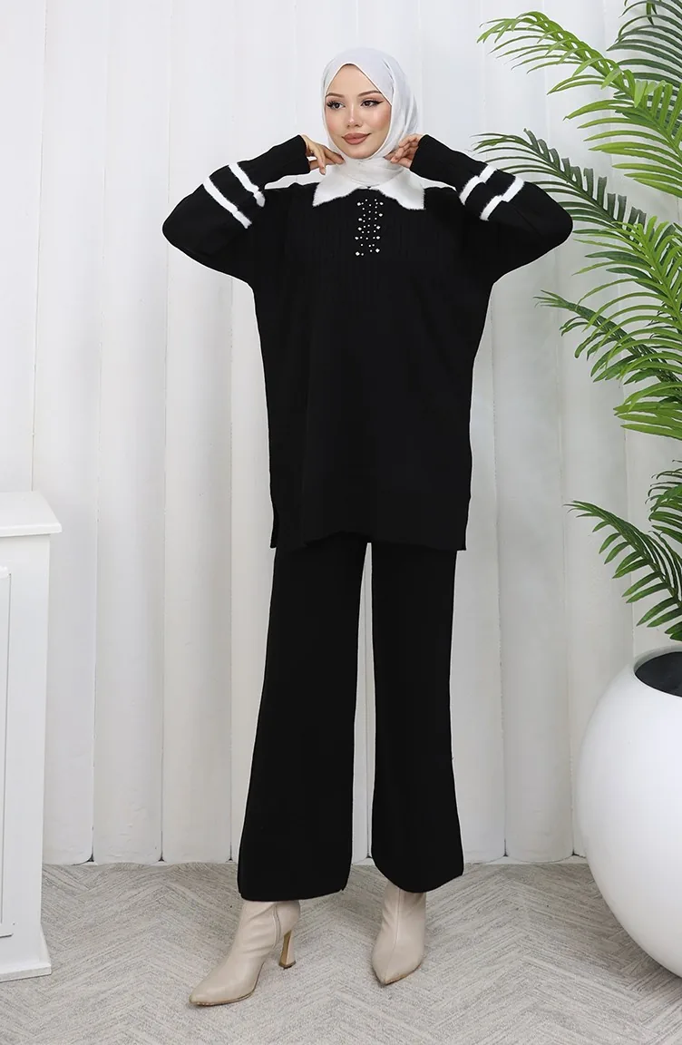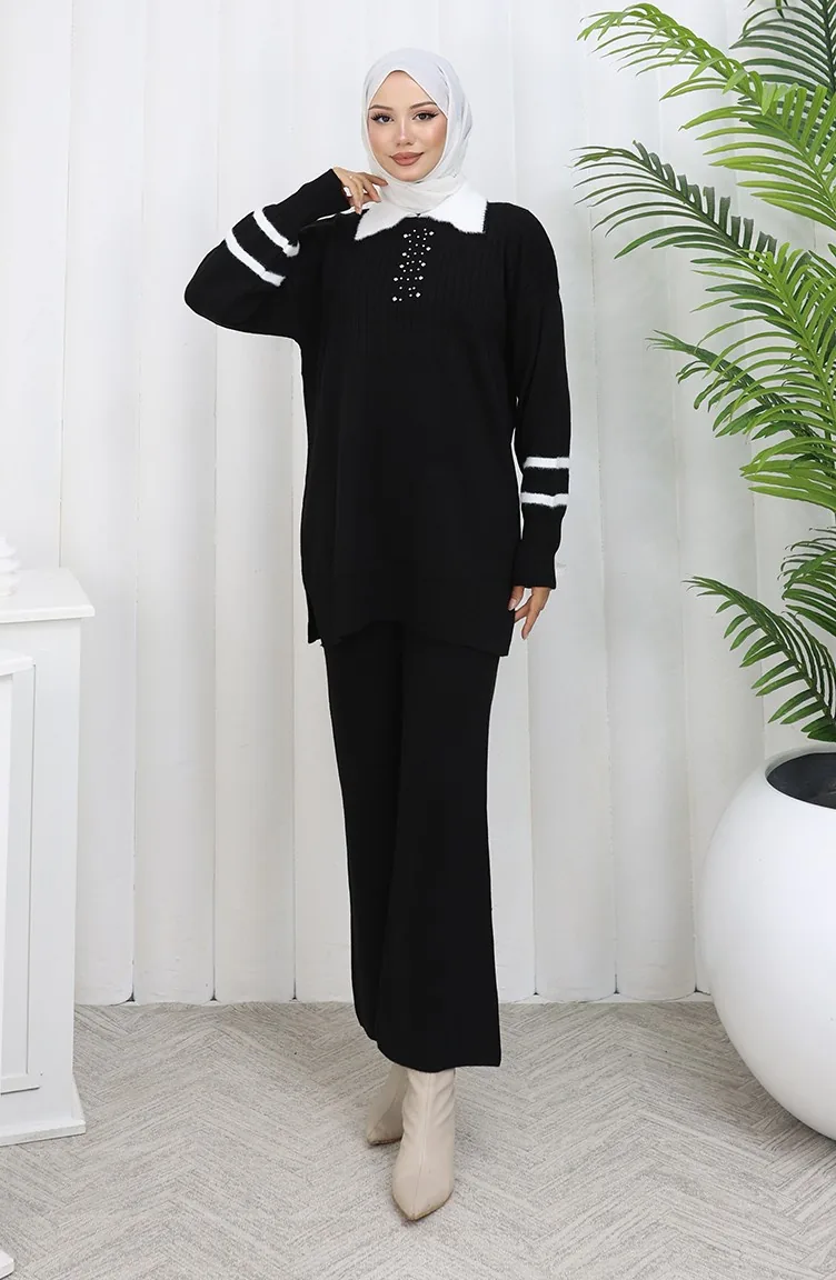 بدلة من قطعتين، بنطال تونك بياقة محبوكة وتفاصيل، لون أسود، رقم 1002-01 1002-01