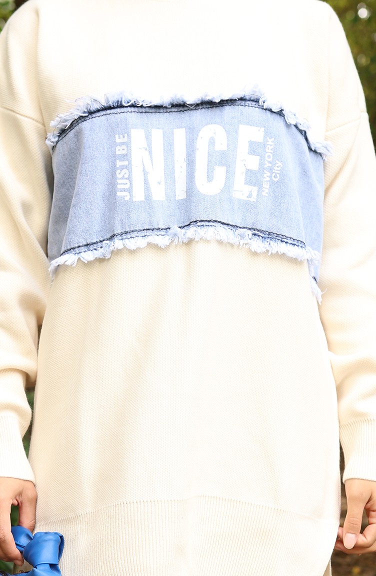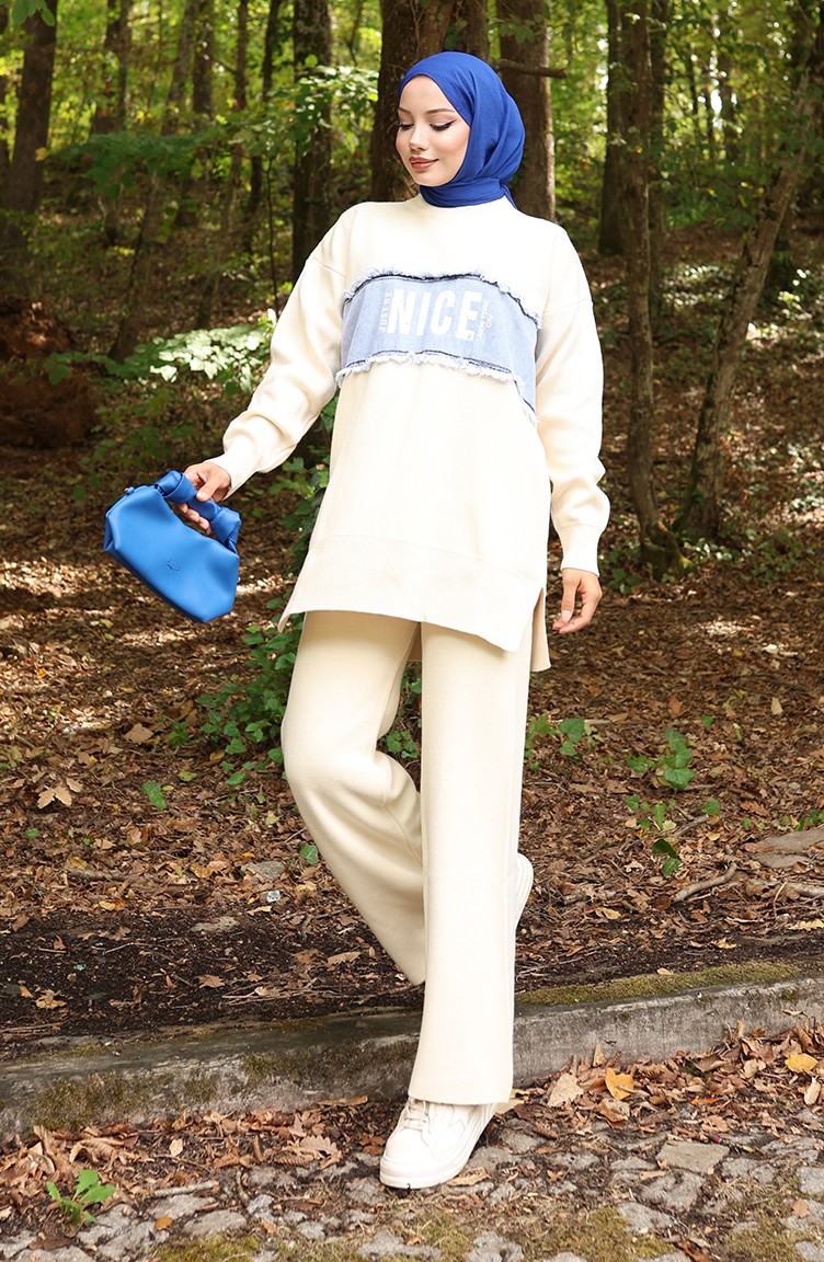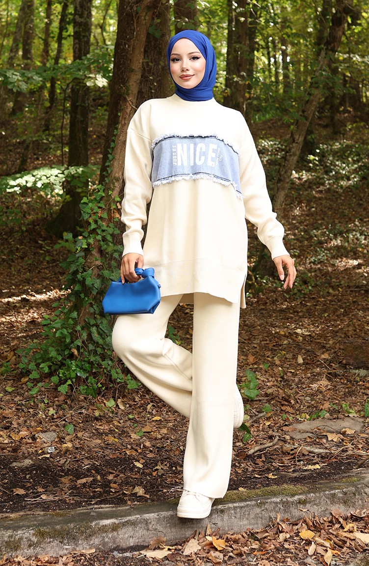 طقم من قطعتين من قماش الدنيم المحبوك مع بنطلون وتونيك، لون بيج، 1094-02 1094-02