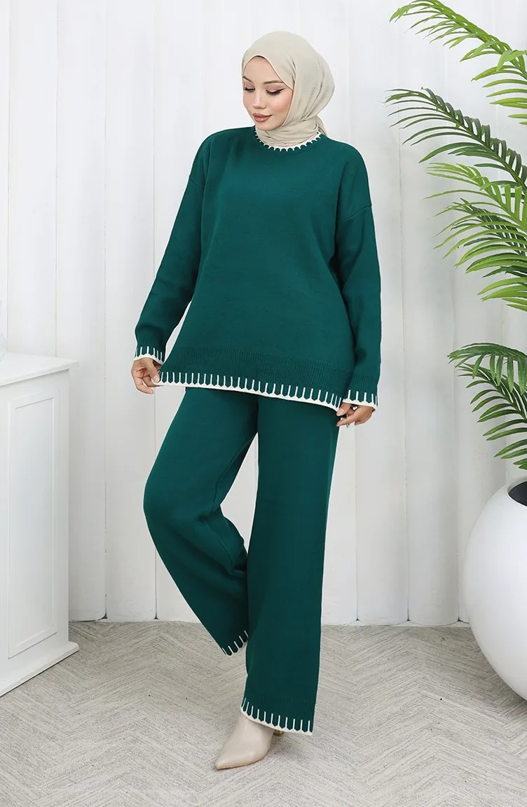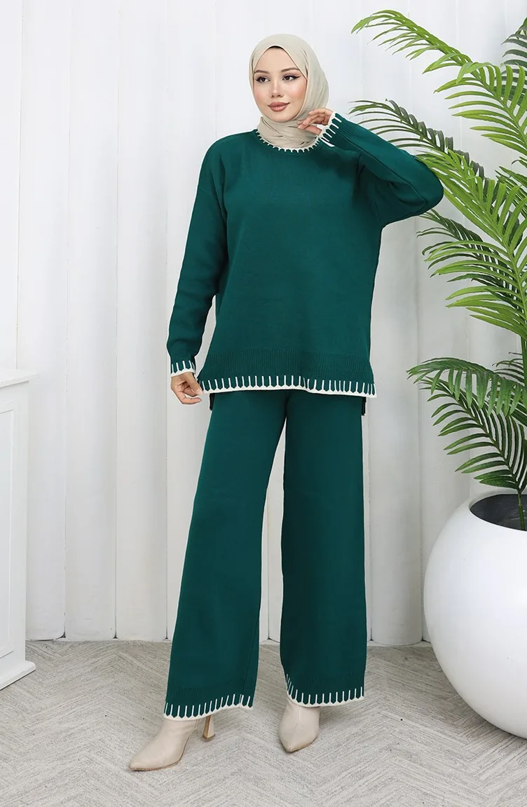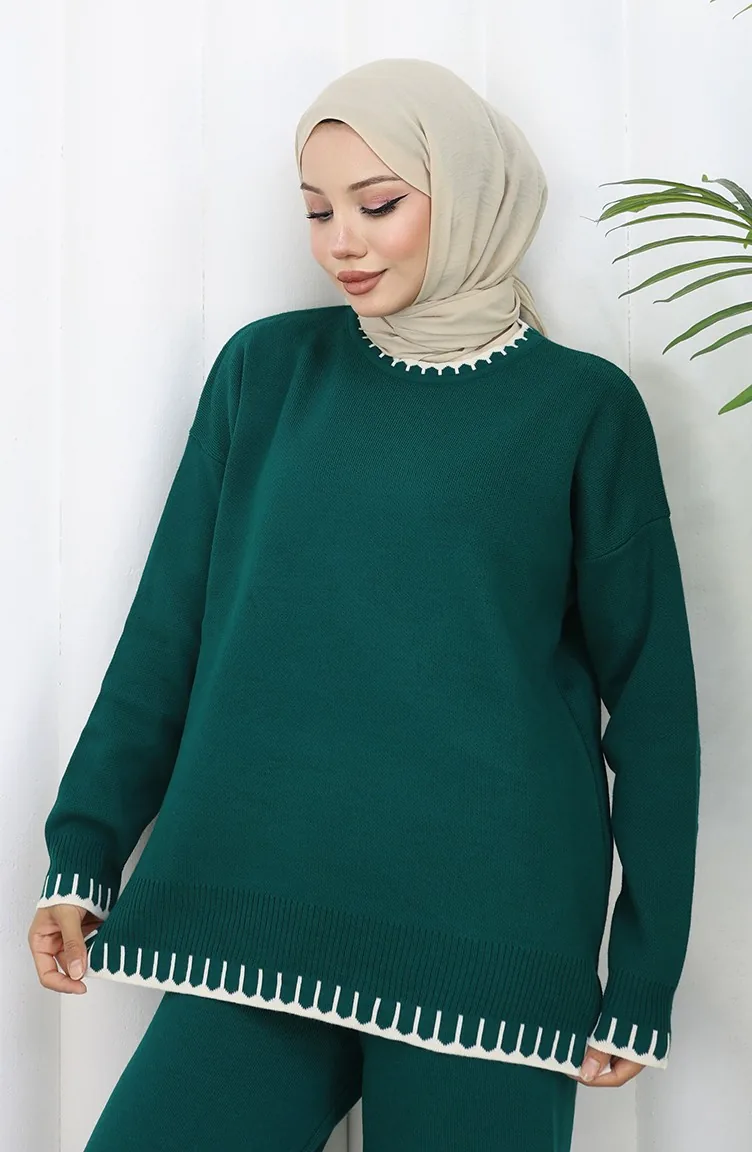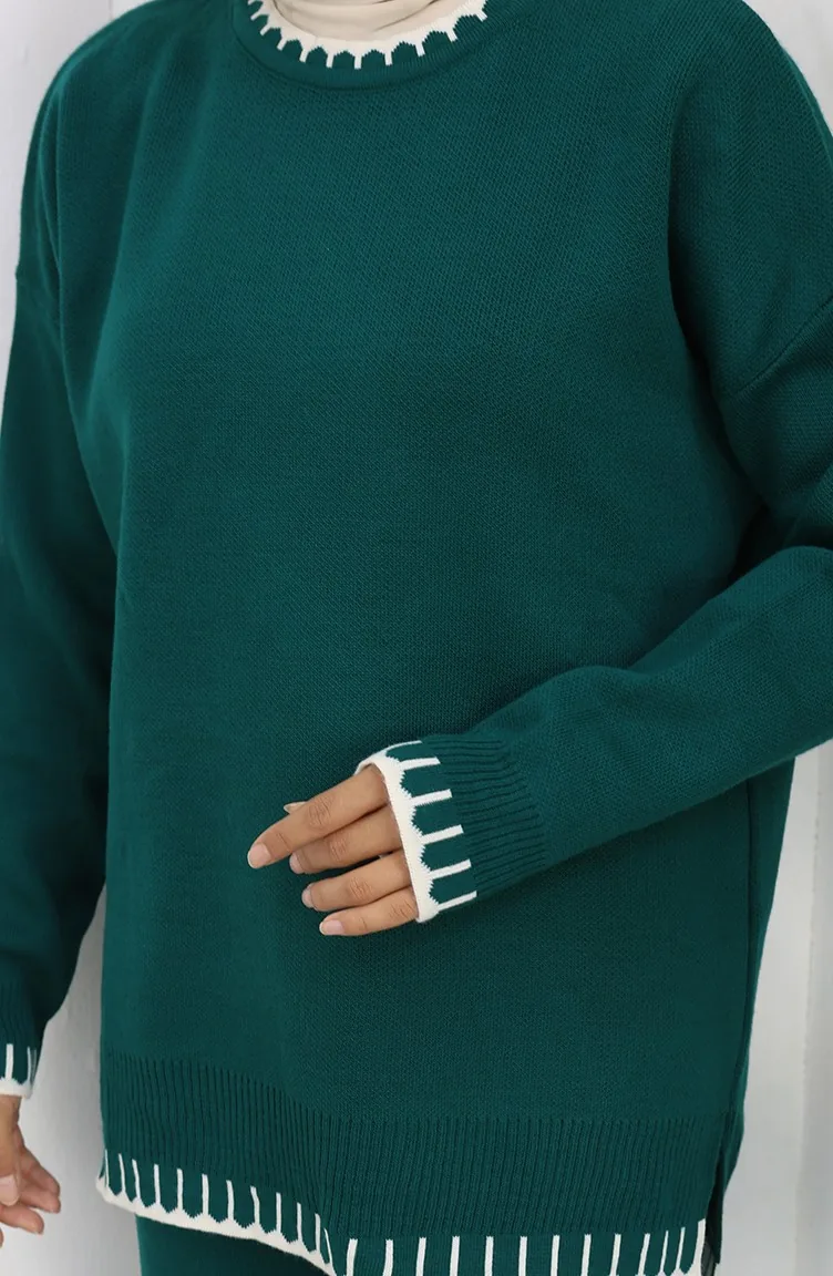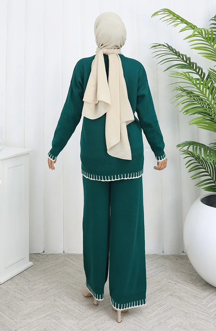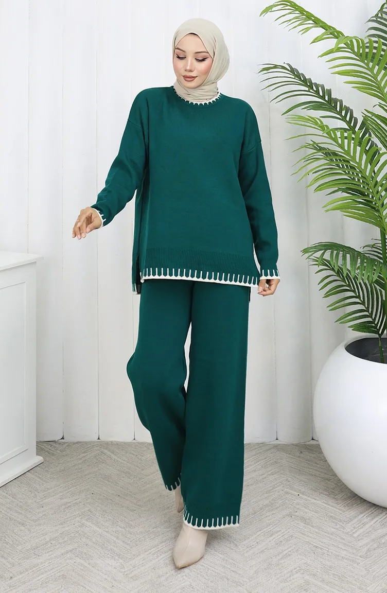 طقم من قطعتين من سترة وبنطلون محبوك بتفاصيل رموش 0015-04 بترولي 0015-04