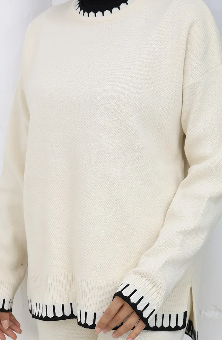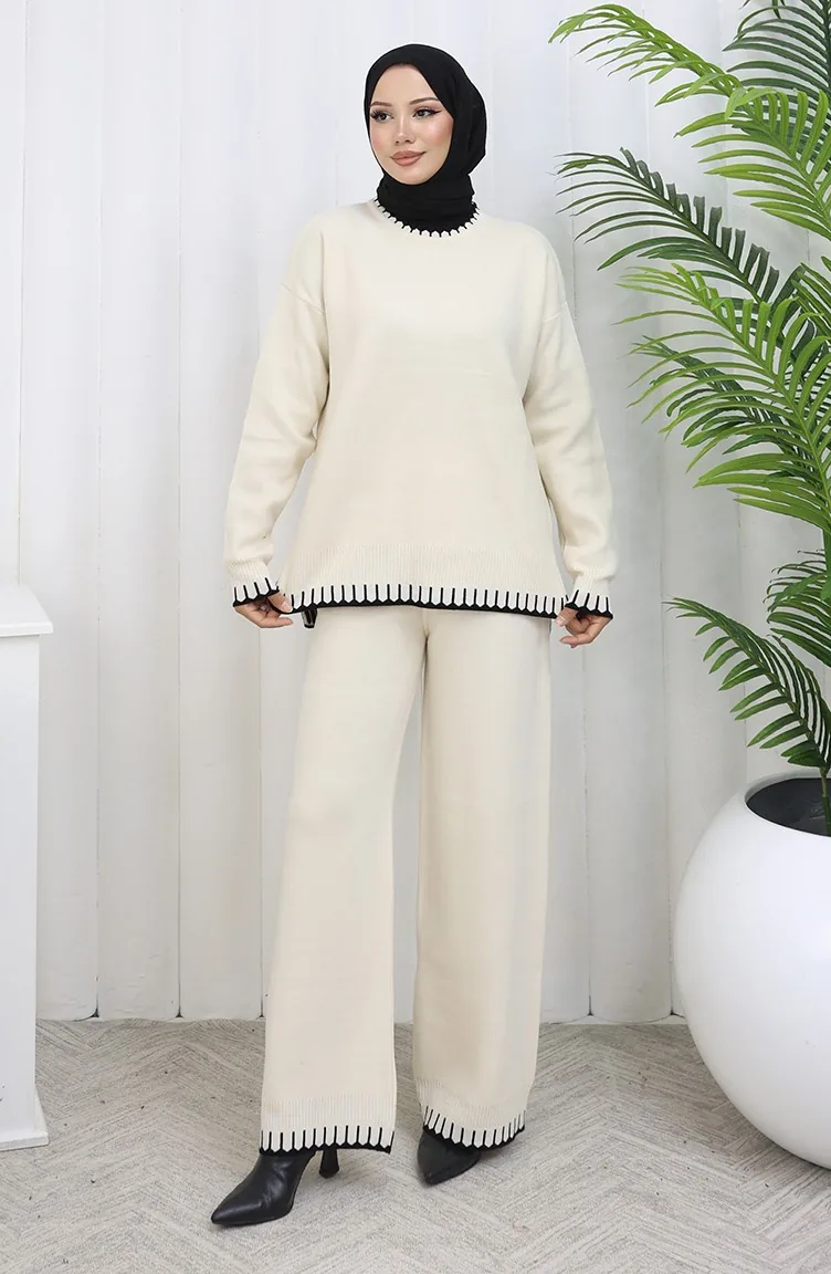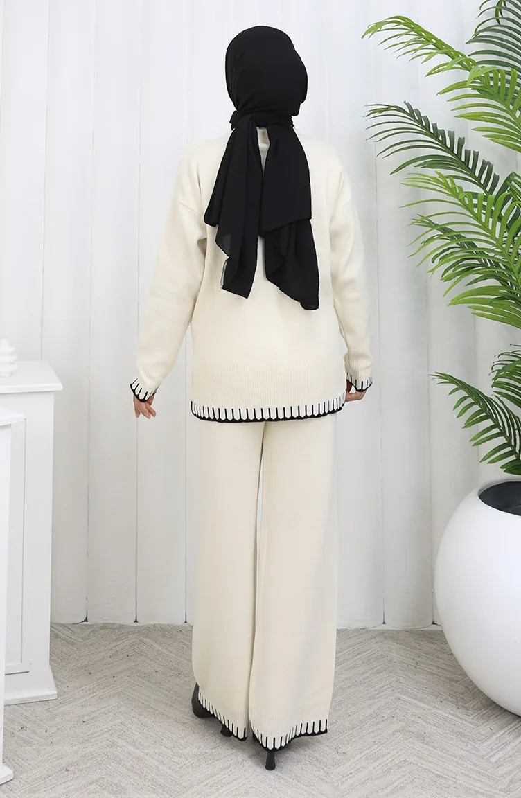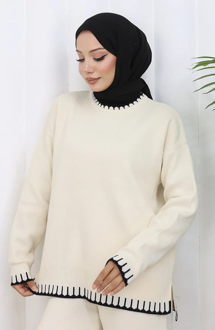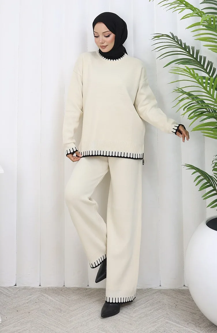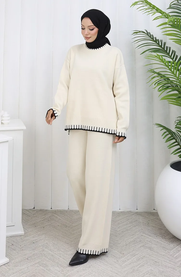 طقم من قطعتين من سترة وبنطلون محبوك بتفاصيل رموش 0015-05 بيج 0015-05