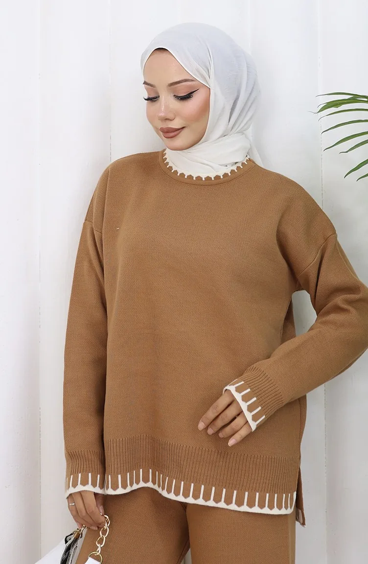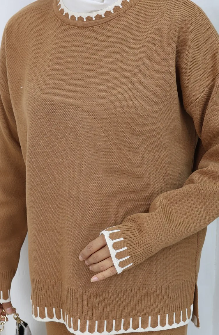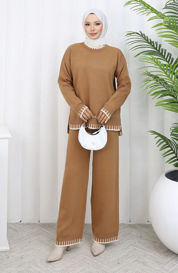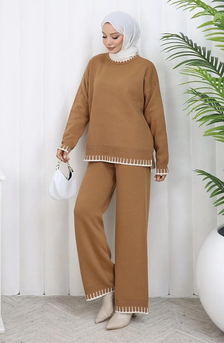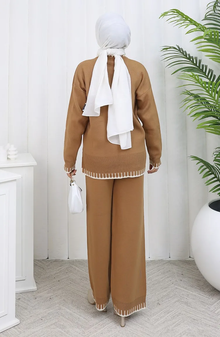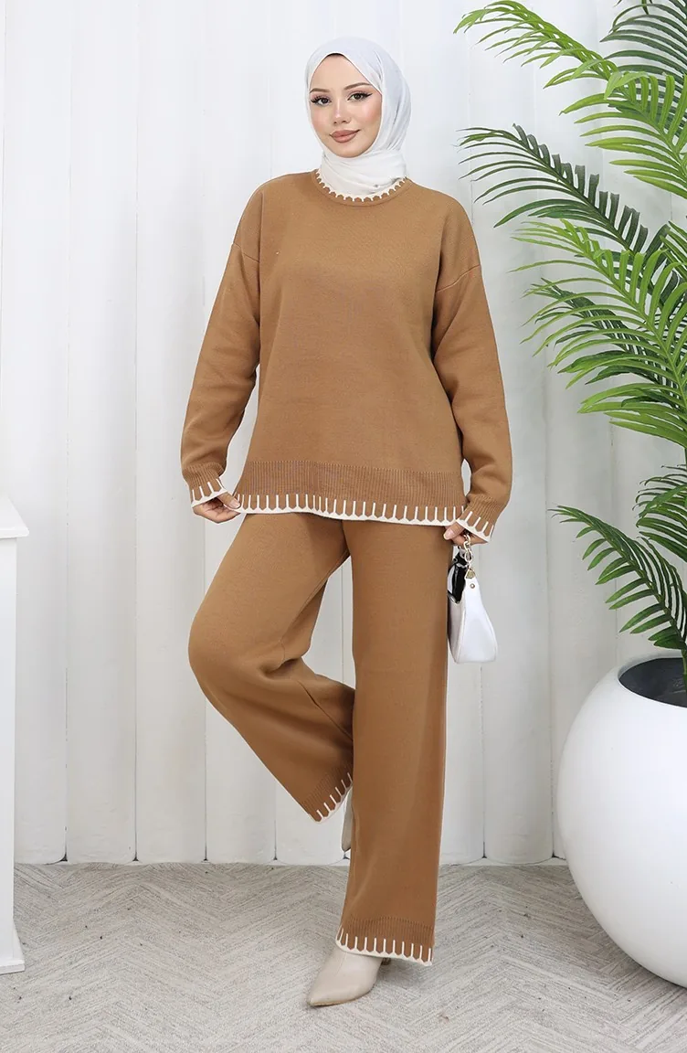 طقم من قطعتين من سترة وبنطلون محبوك بتفاصيل رموش 0015-06 لون قهوة حليبية 0015-06