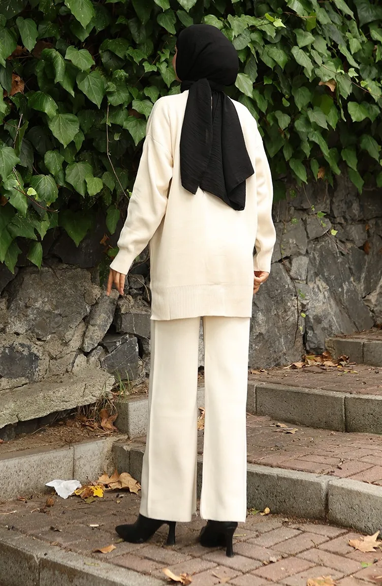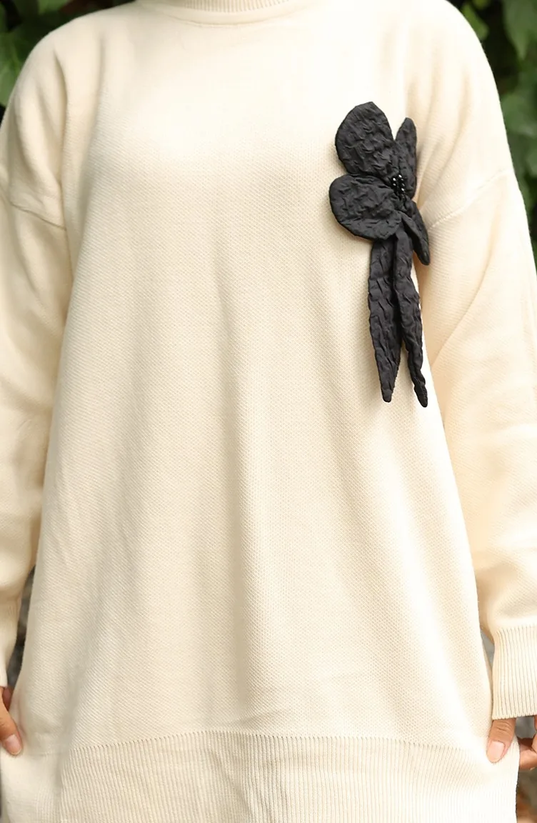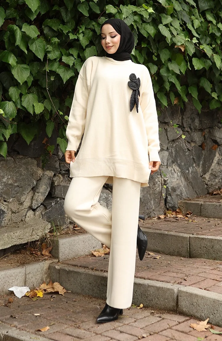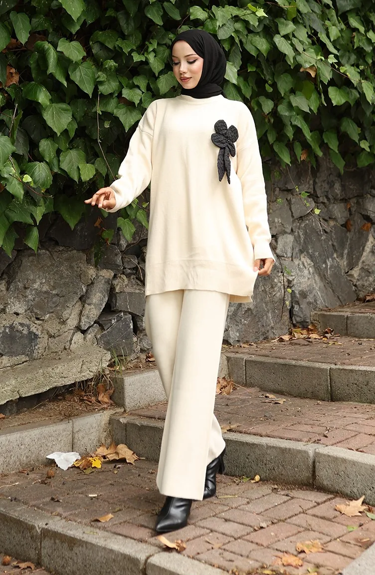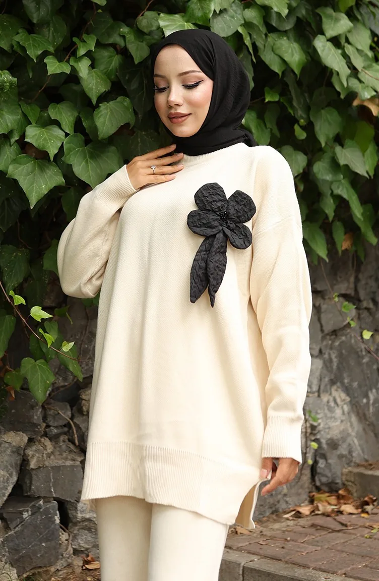 طقم تونيك وبنطلون محبوك بتفاصيل زهور من قطعتين 1028-01 بيج 1028-01