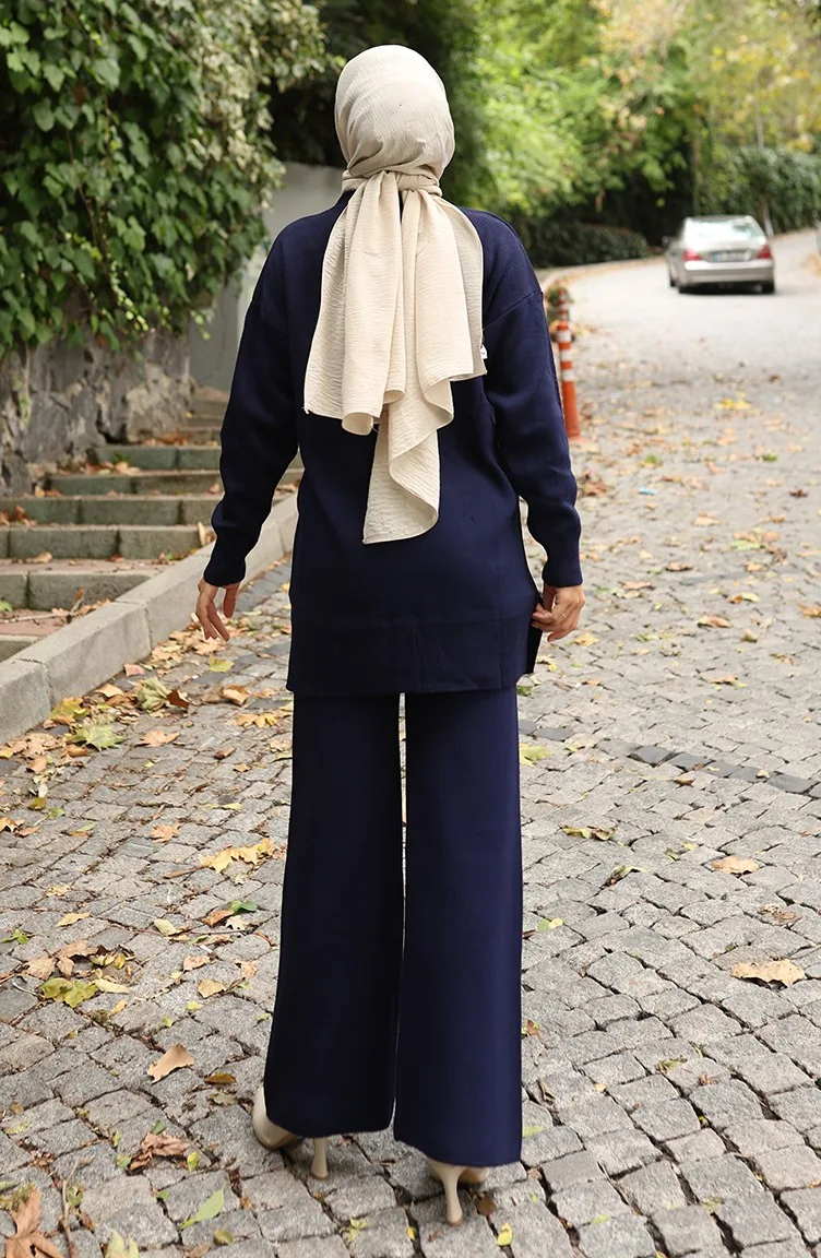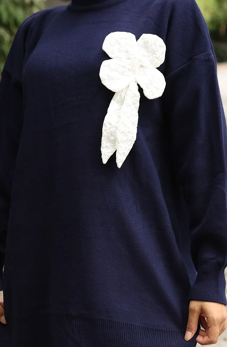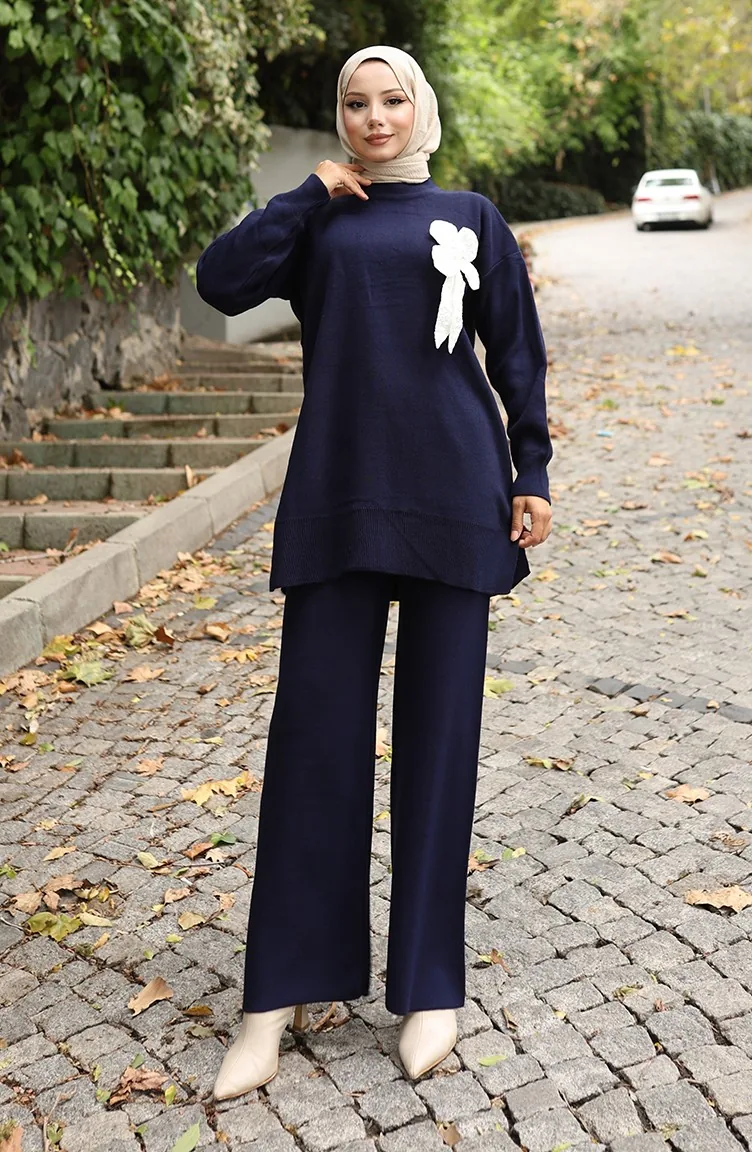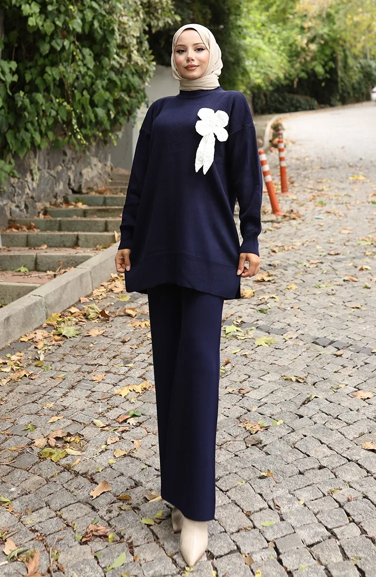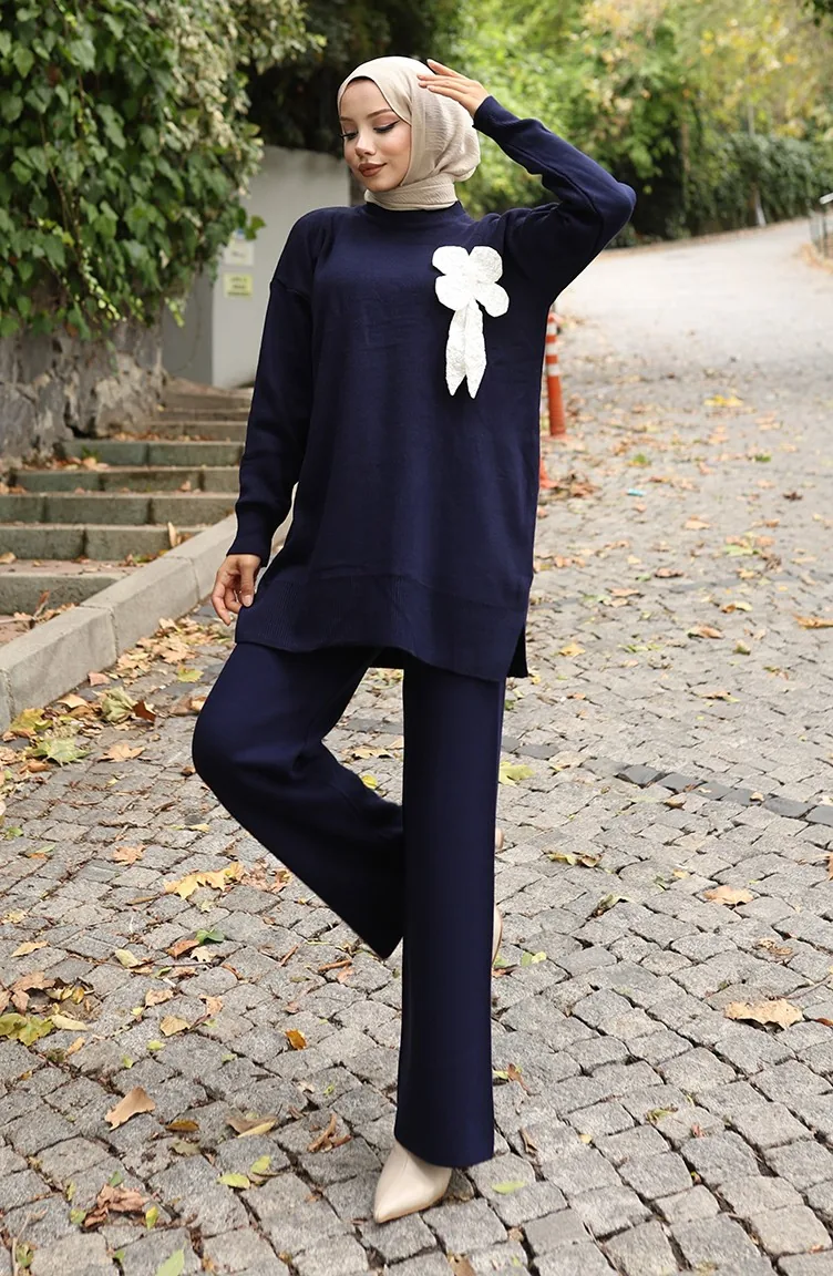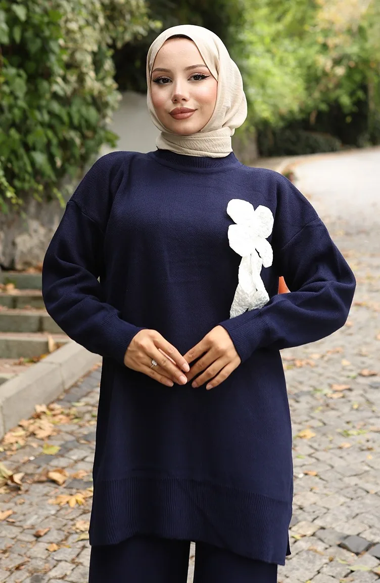 بدلة من قطعتين، بنطال وتونك بتفاصيل زهور، 1028-08 أزرق داكن 1028-08