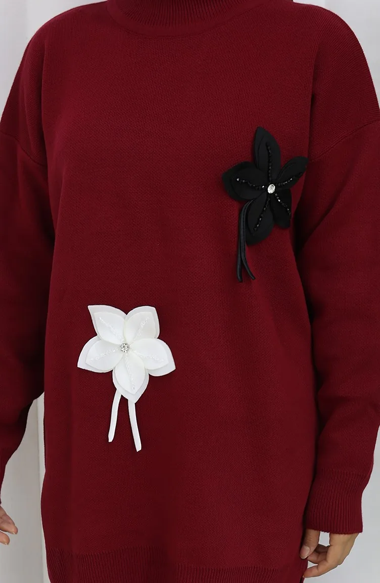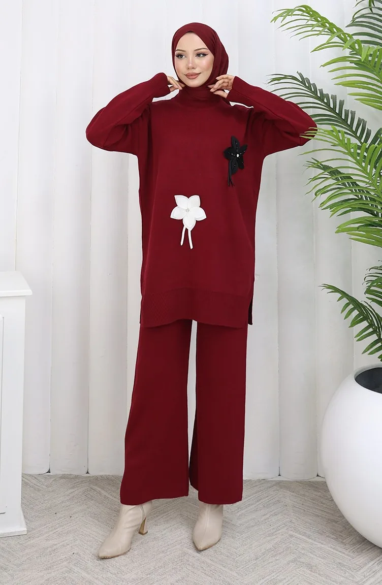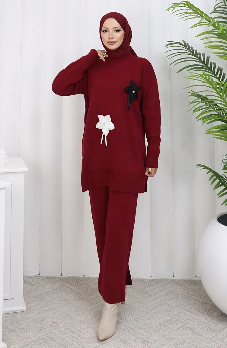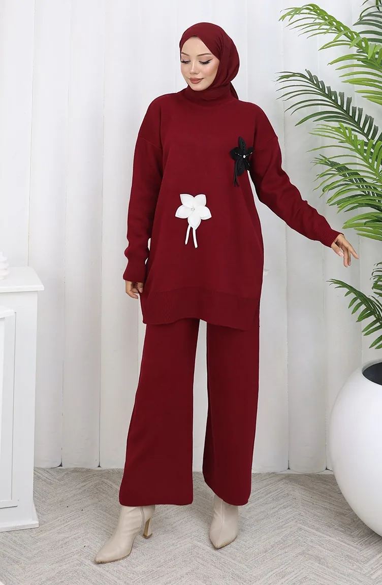 طقم تونيك وبنطلون محبوك مزهر من قطعتين، لون أحمر قرمزي، 1077-06 1077-06