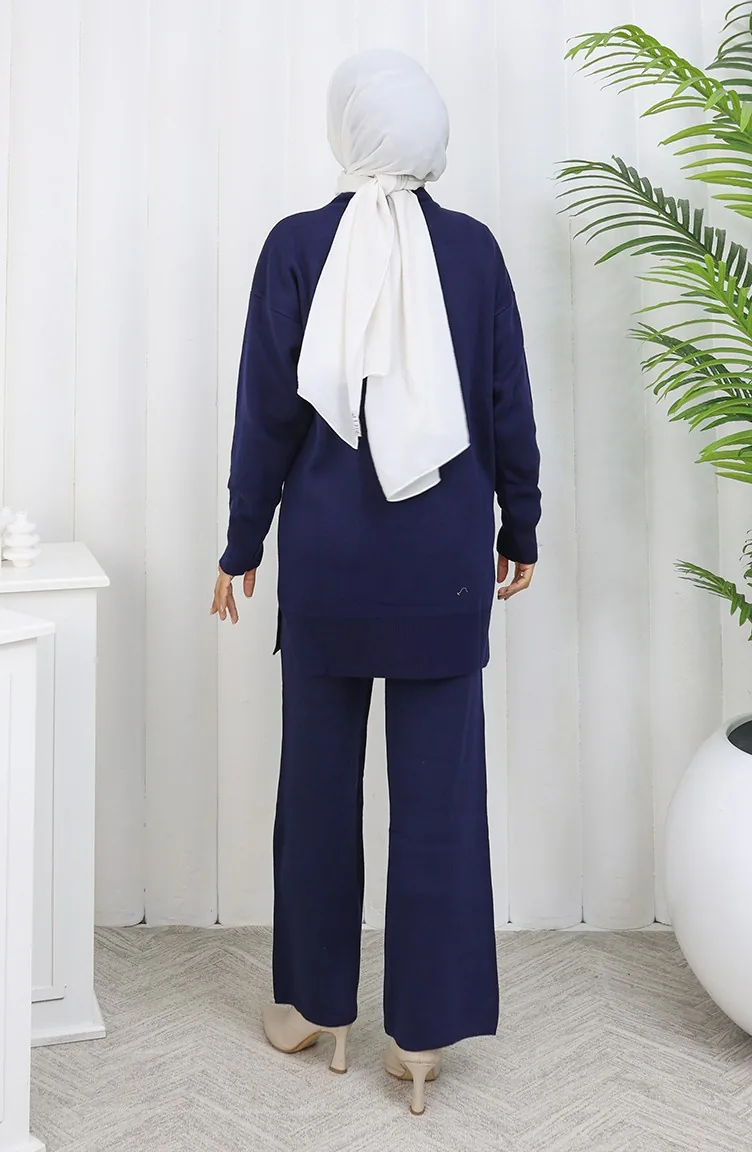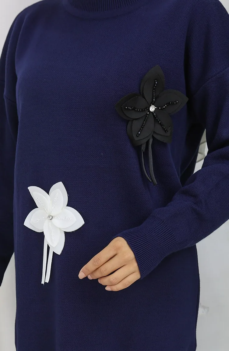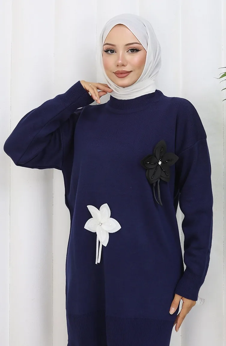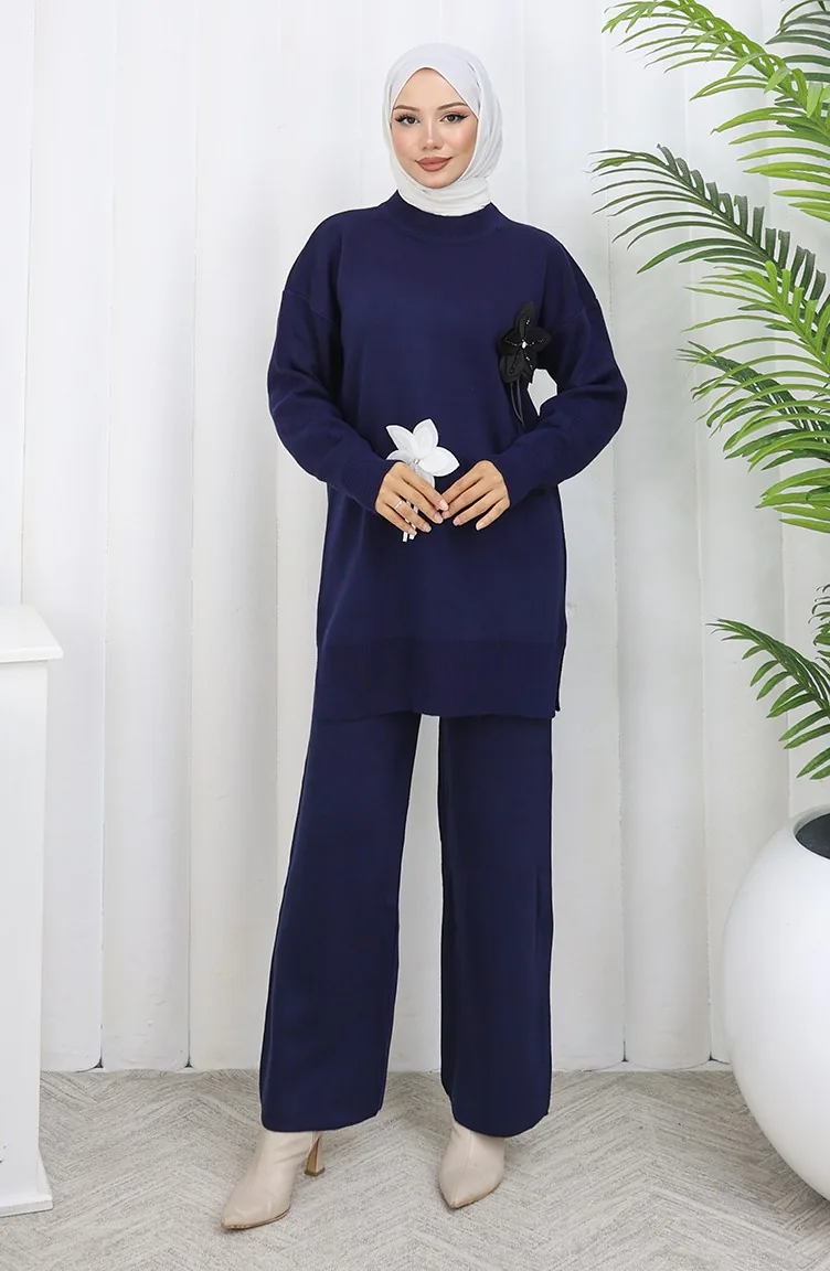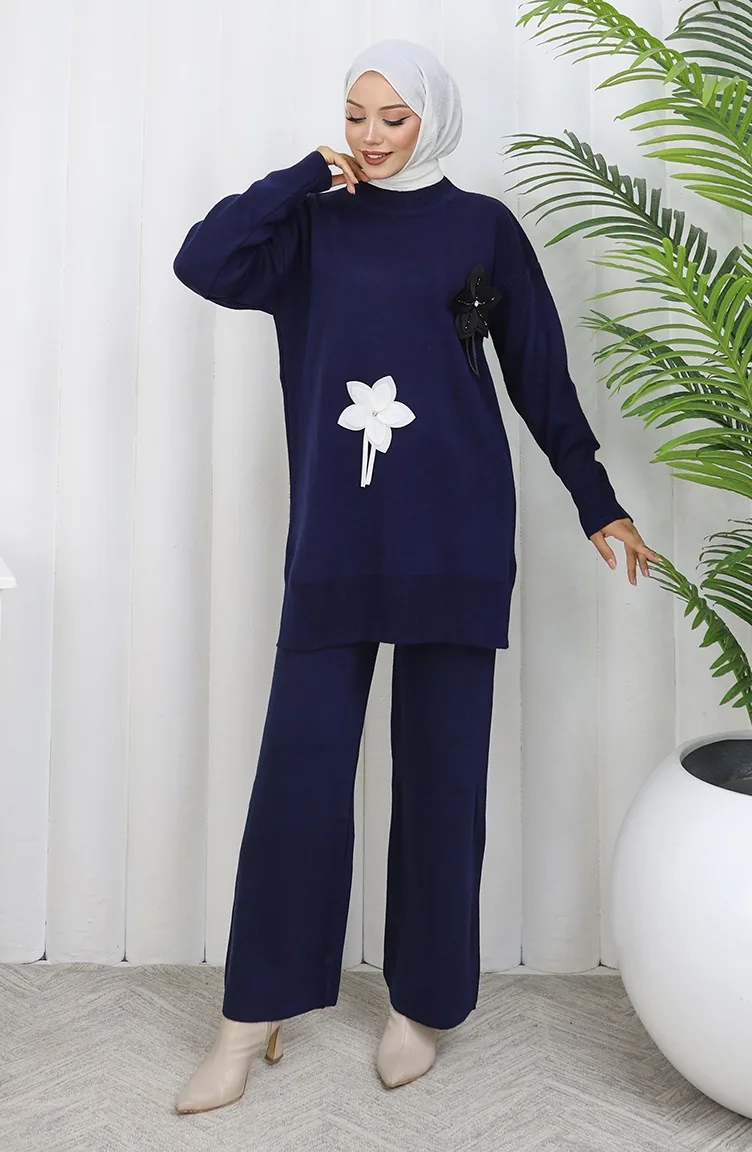 طقم تونيك وبنطلون محبوك مزهر من قطعتين 1077-08 أزرق داكن 1077-08