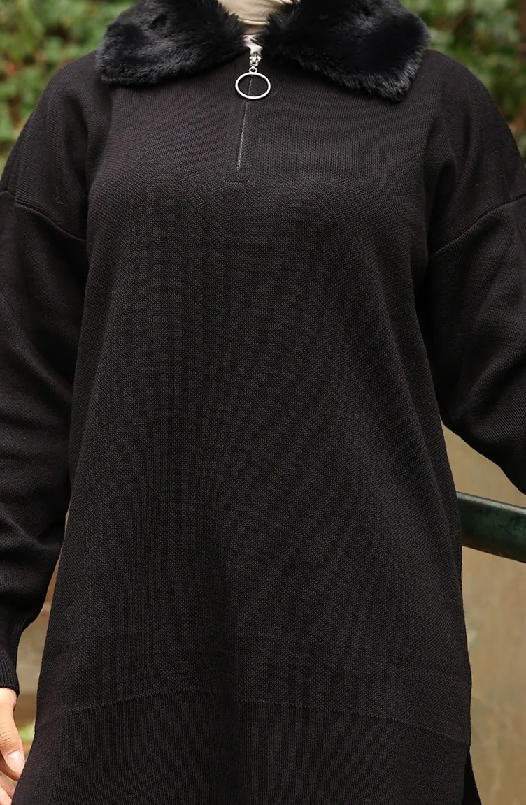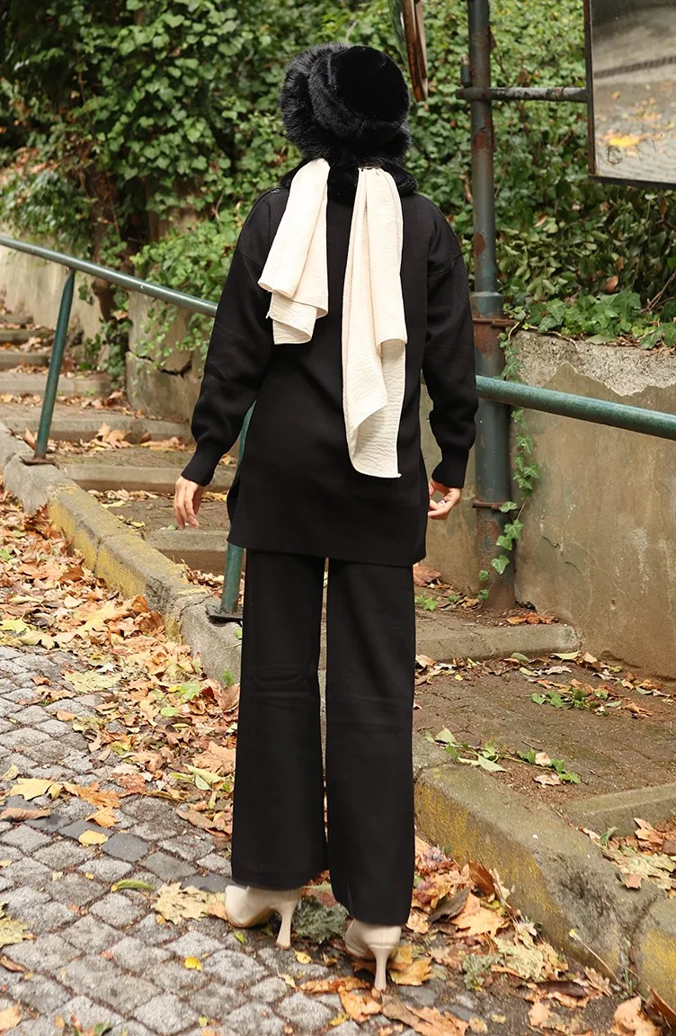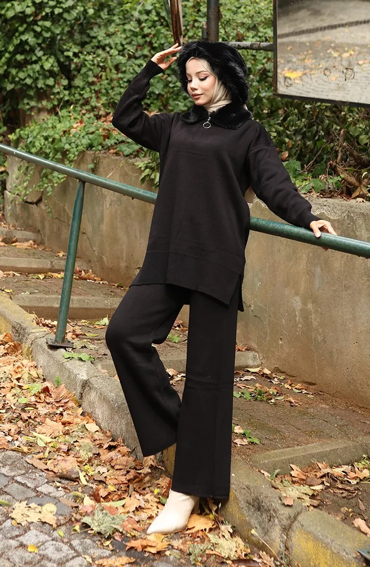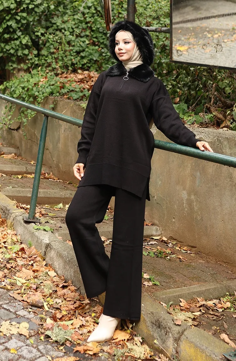 بدلة من قطعتين، سترة وبنطلون وياقة فرو محبوكة، لون أسود، 1059-03 1059-03