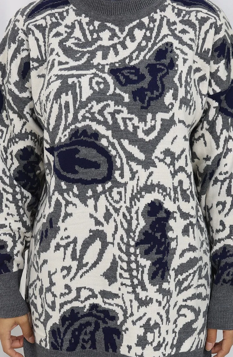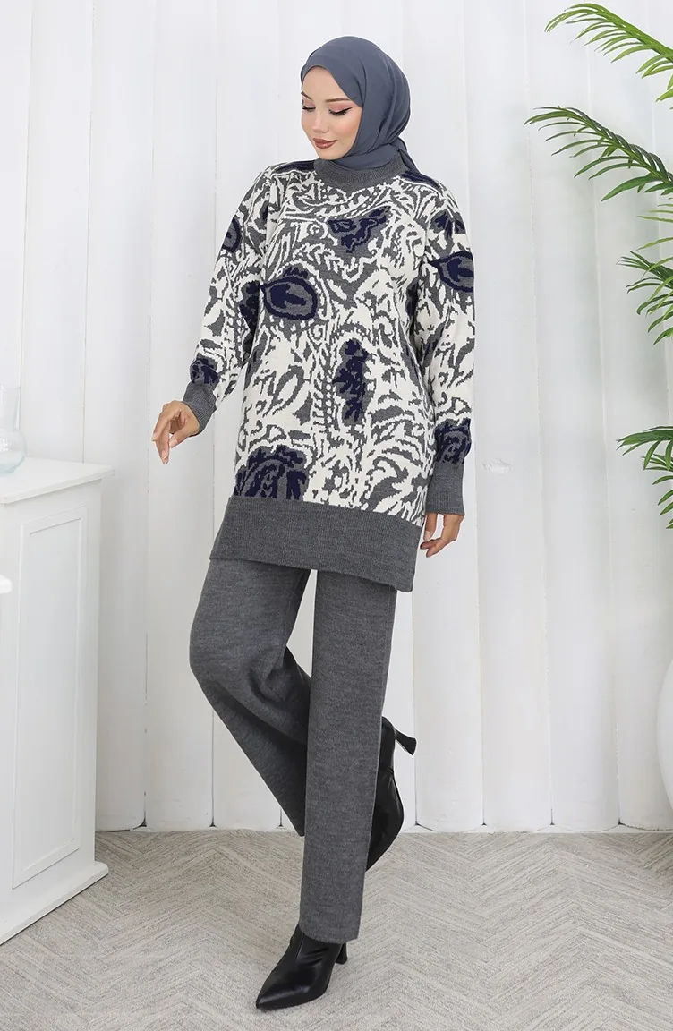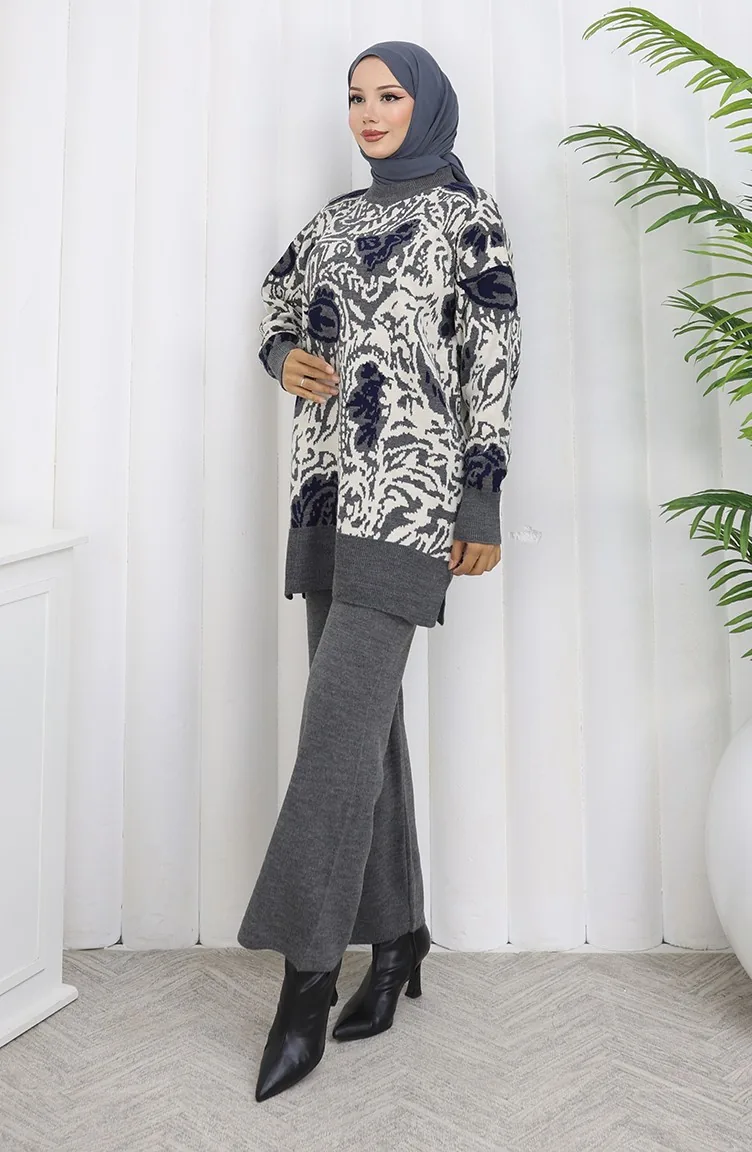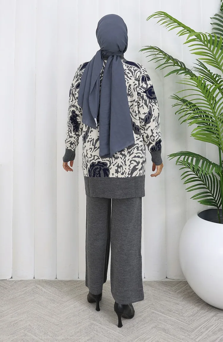 طقم تونيك وبنطلون محبوك مزخرف من قطعتين 1060-01 رمادي 1060-01