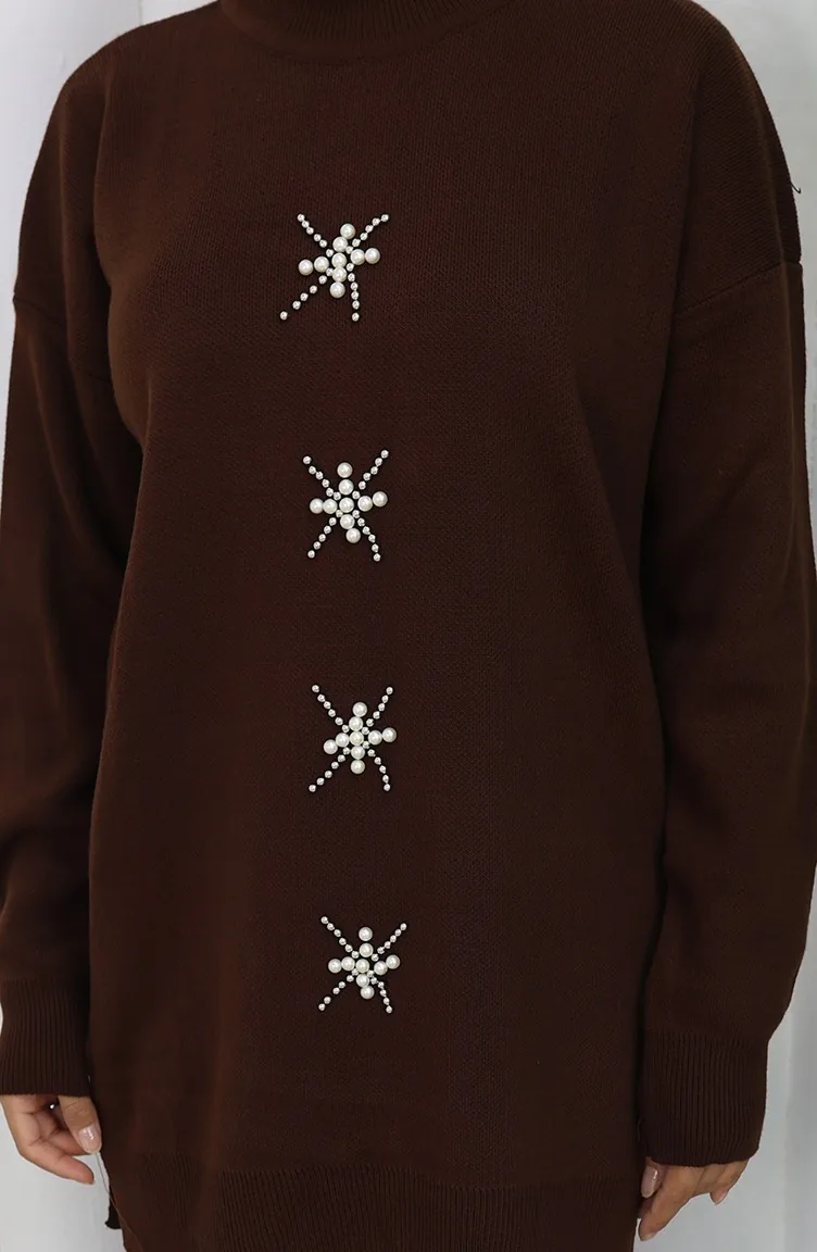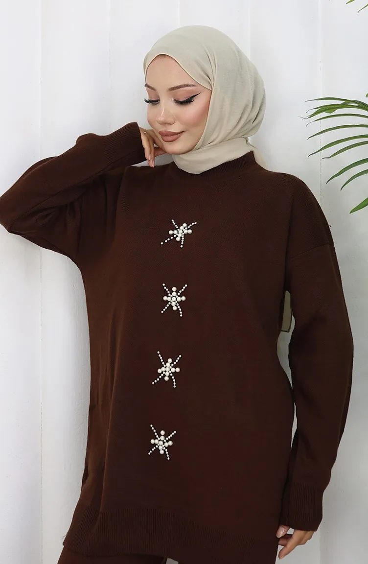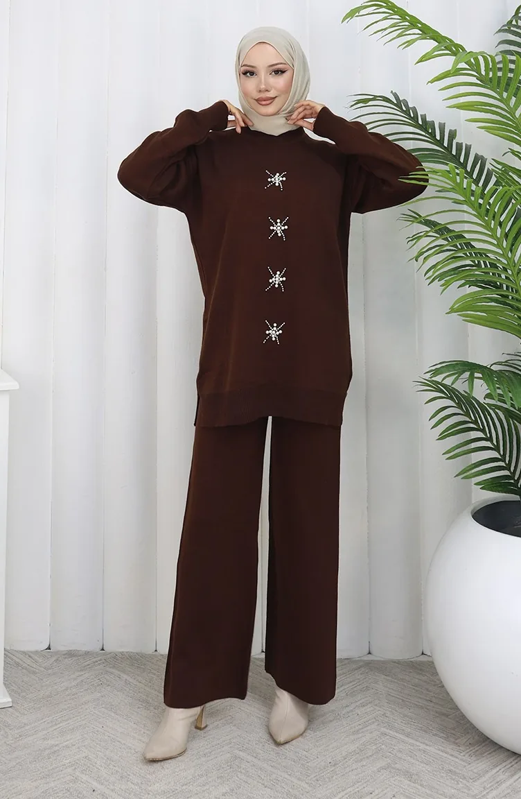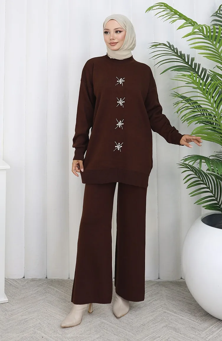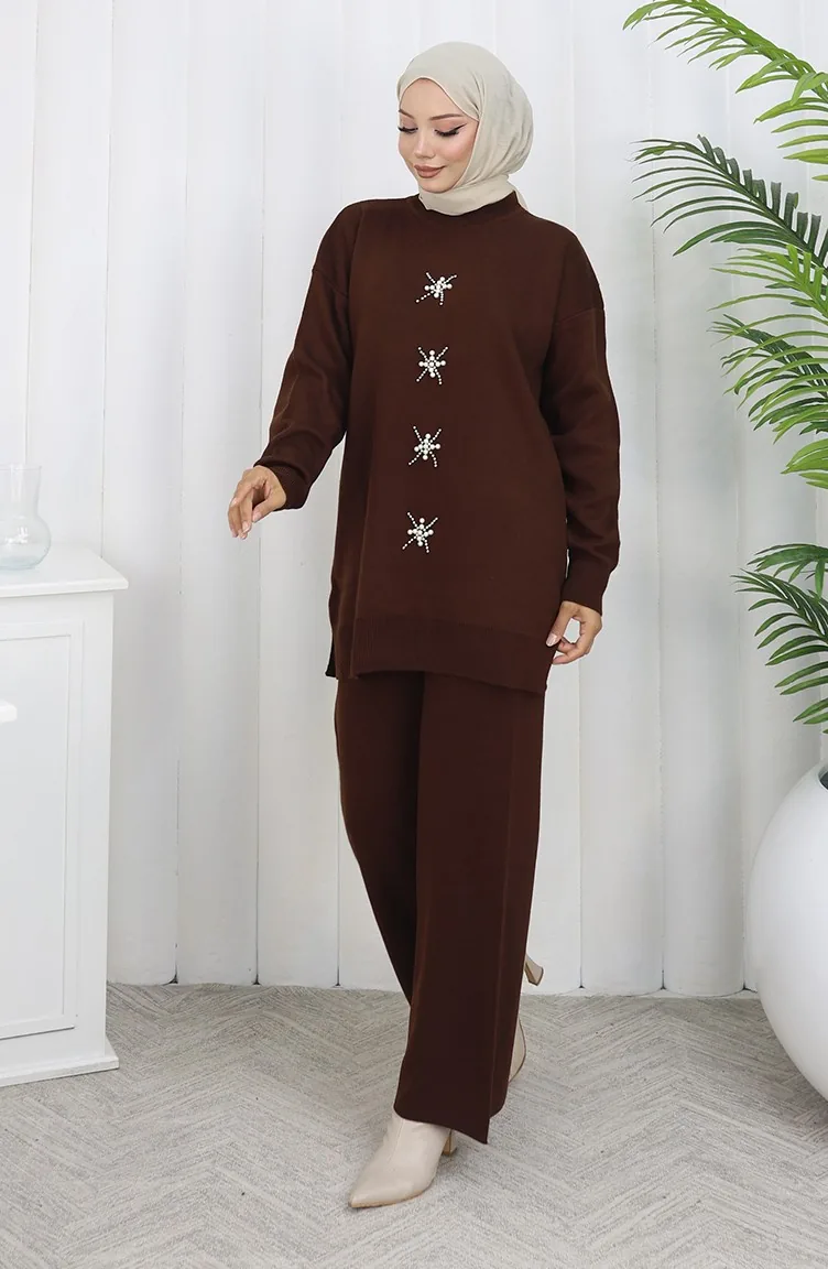 بدلة من قطعتين، بنطلون وتونيك مطرز باللؤلؤ، لون بني، 1068-07 1068-07