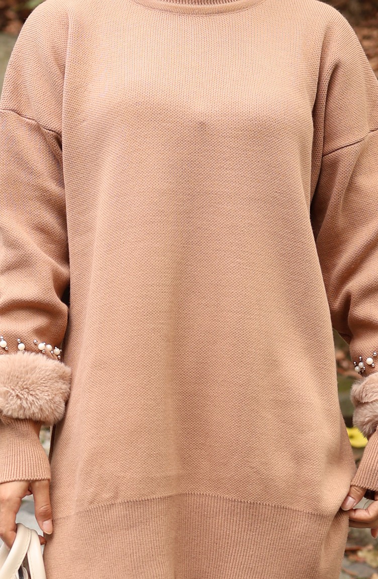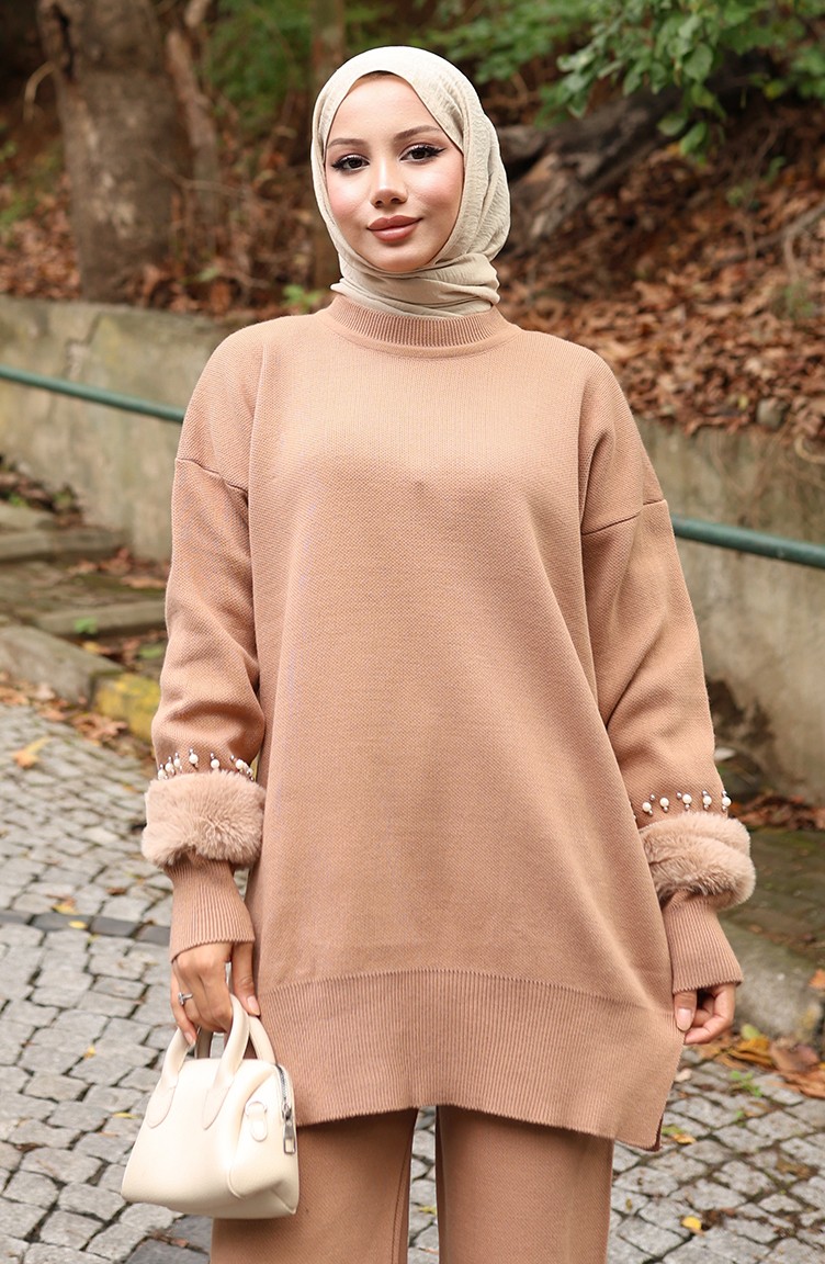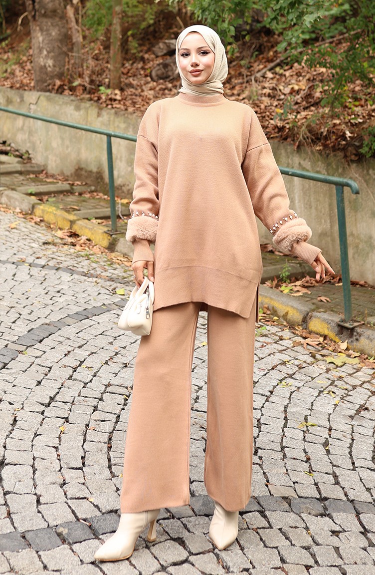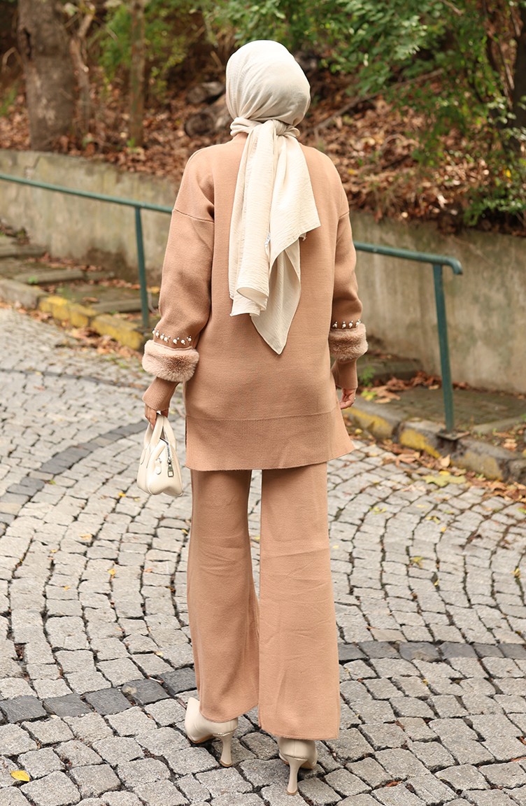 بدلة مزدوجة من بنطلون تونك بأكمام راجلان محبوكة 1054-04 لون قهوة حليبية 1054-04
