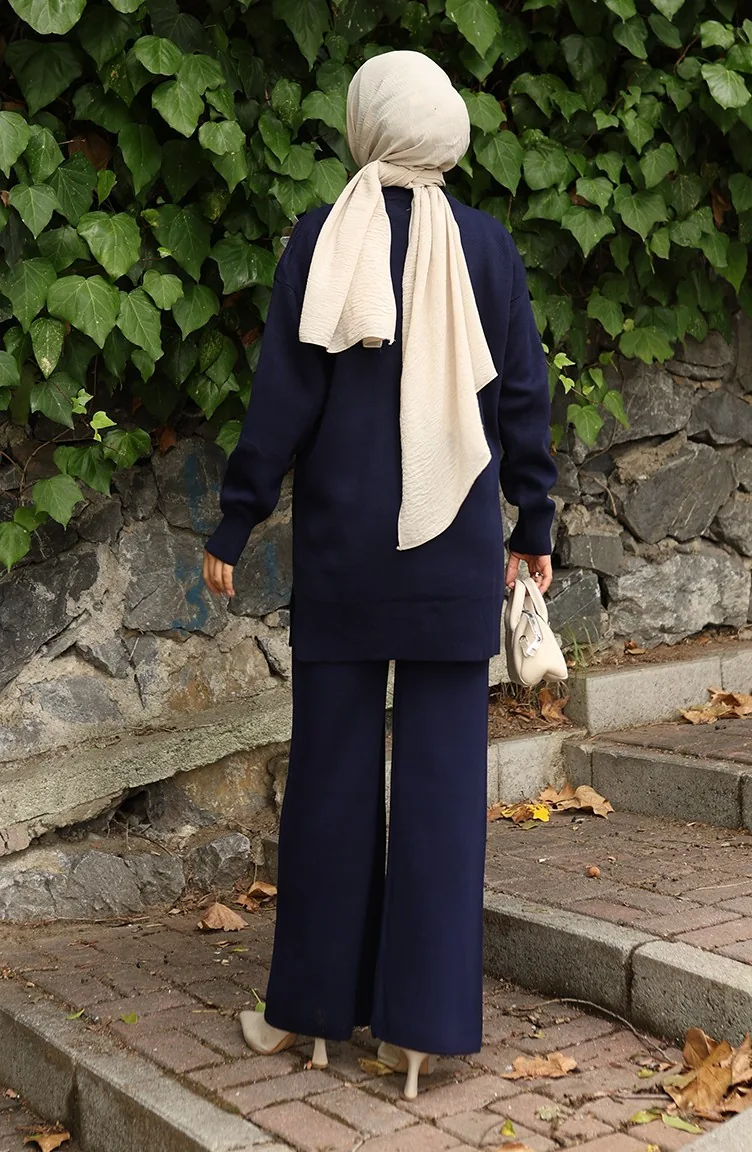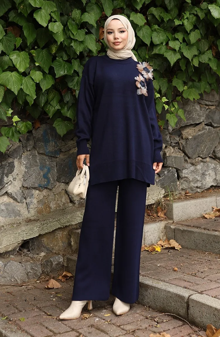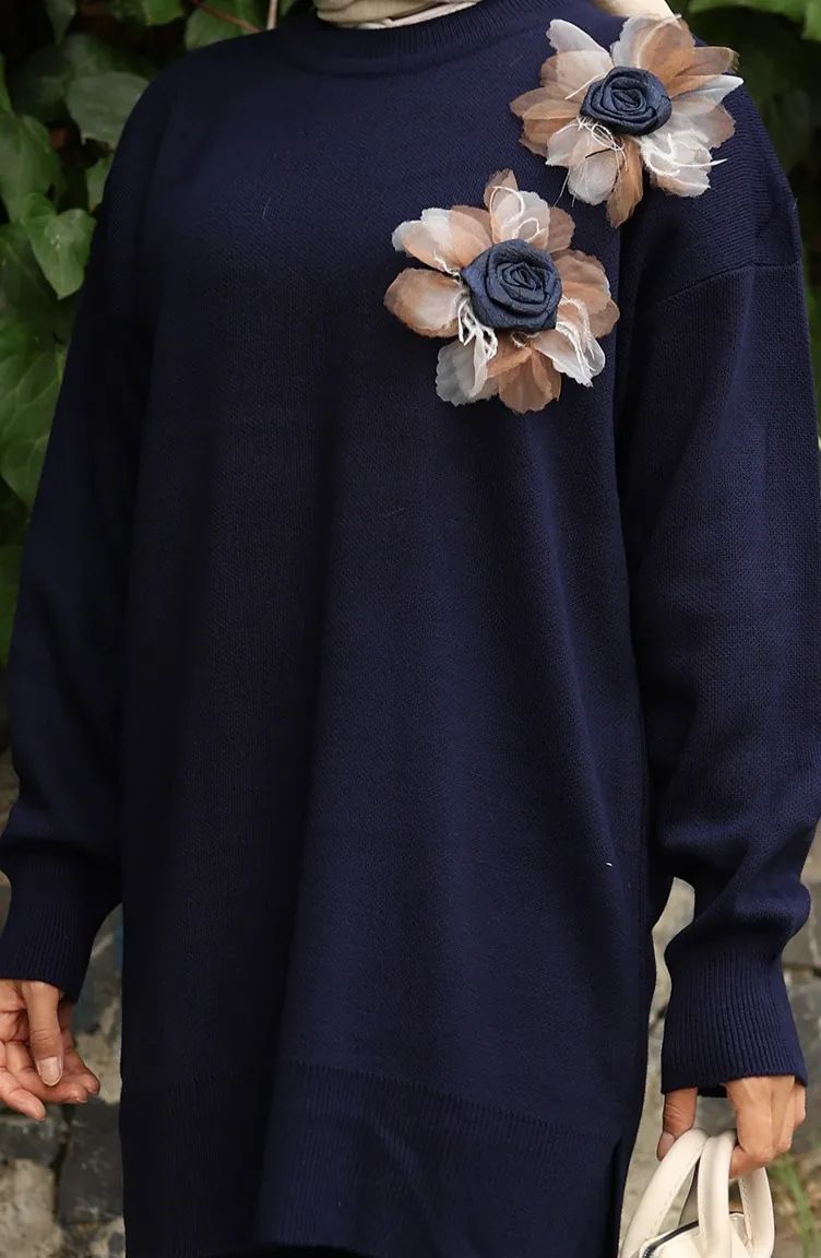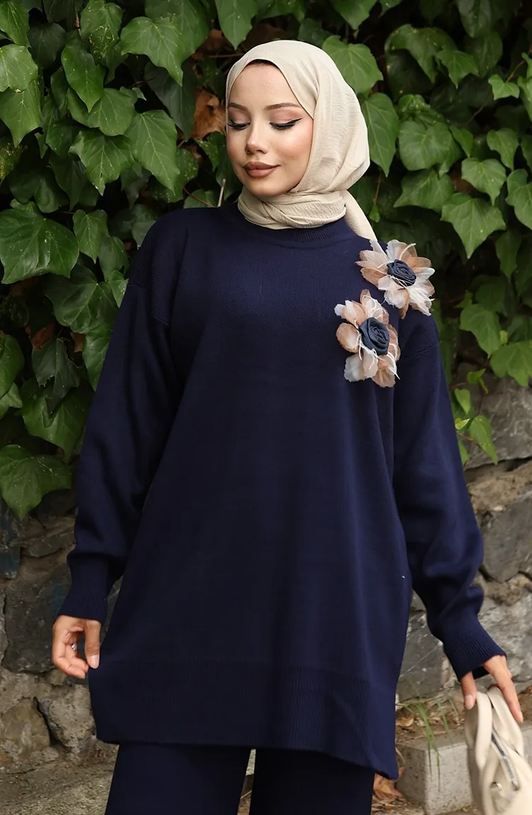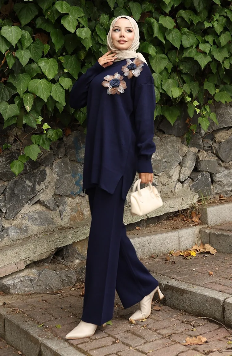 بدلة من قطعتين، بنطال وتونك مزخرف بالورود، لون أزرق داكن، رقم 1036-01 1036-01