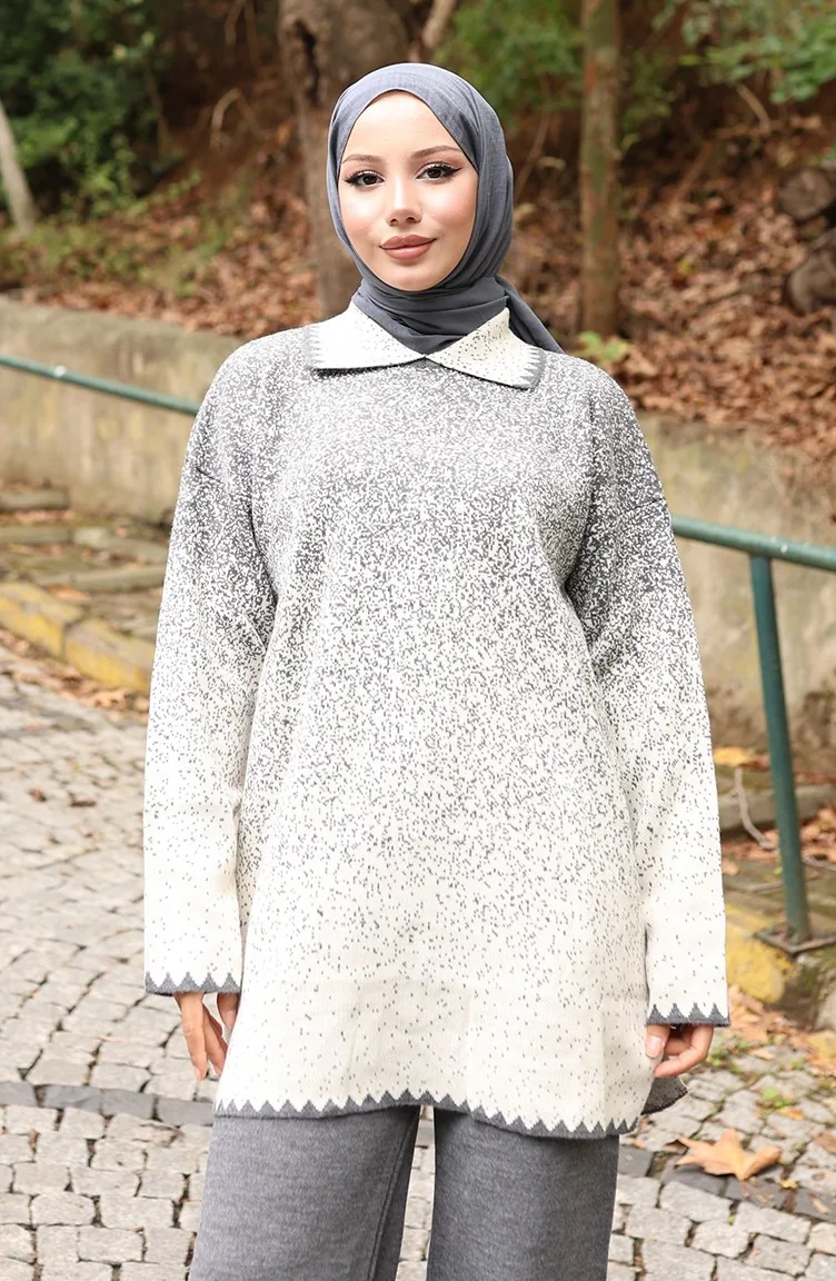 استعمل لون الرمادي. صممه النسيج الاكريليك. ذو مظهر سادة. التونيك عند لبسه مع قطعة اخرى تعطي تلاؤما جميلا. مصممة من القماش السميك. القياس التي في الصورة هي قياس العارضة.