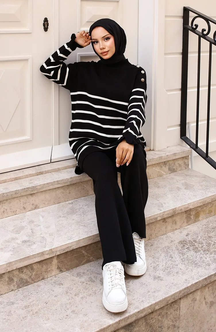 طقم تريكو مُخطط عند الكتف وأزرار 24019-03 لون أسود 24019-03
