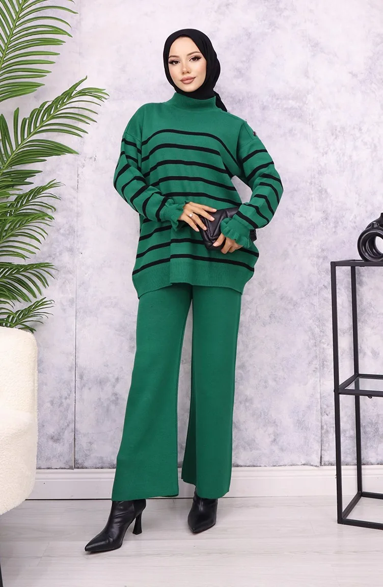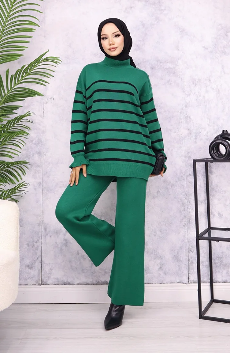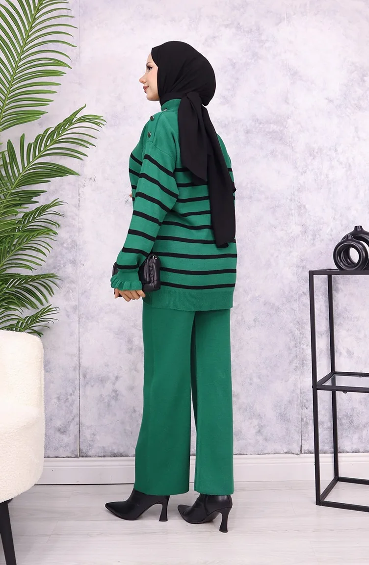 طقم تريكو مُخطط عند الكتف وأزرار 24019-02 لون أخضر زمردي 24019-02