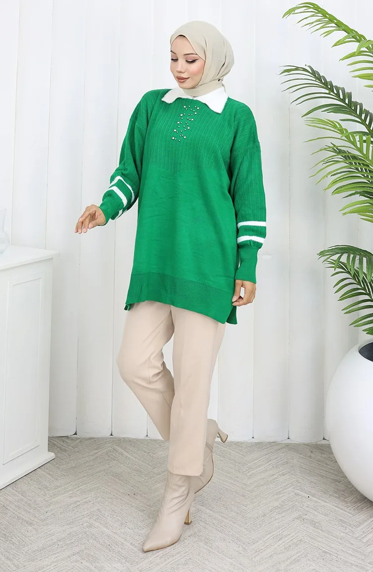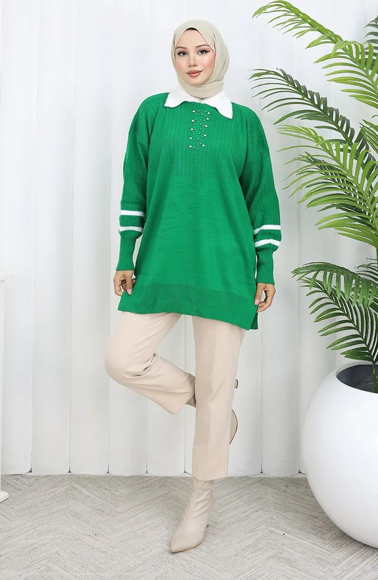 سترة محبوكة بأكمام منفوخة وياقة 3007-01 باللون الأخضر الزمردي 3007-01