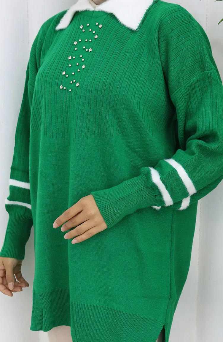 استخدم اللون الأخصر الزمردي. صممه النسيج الاكريليك. ذو مظهر سادة. التونيك عند لبسه مع قطعة اخرى تعطي تلاؤما جميلا. Balon Kol. مصممة من القماش السميك. القياس التي في الصورة هي قياس العارضة.