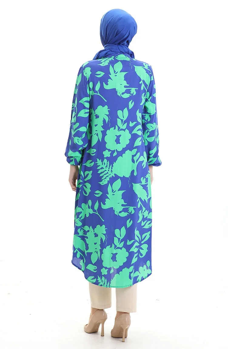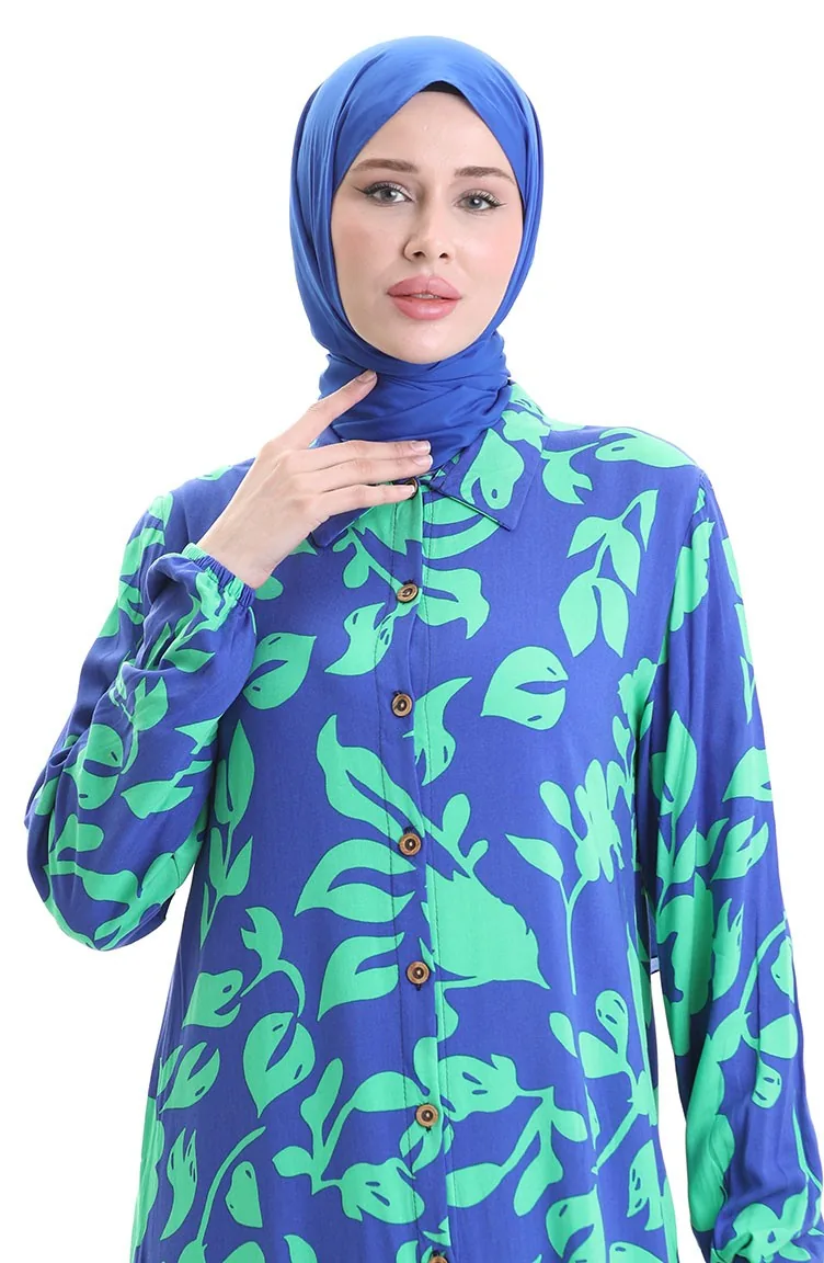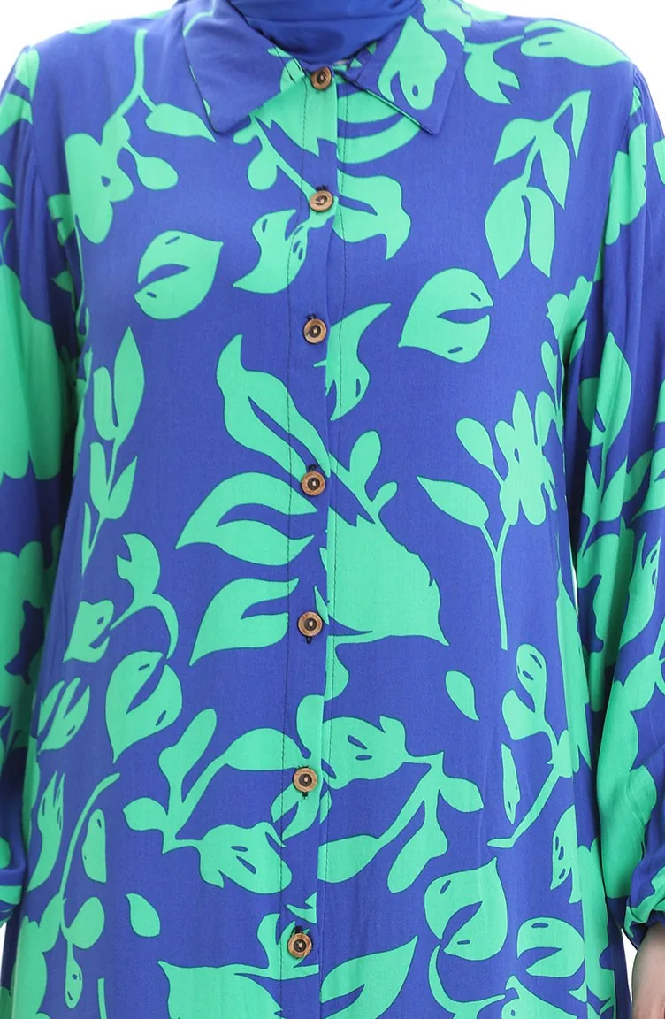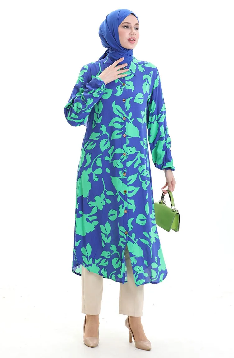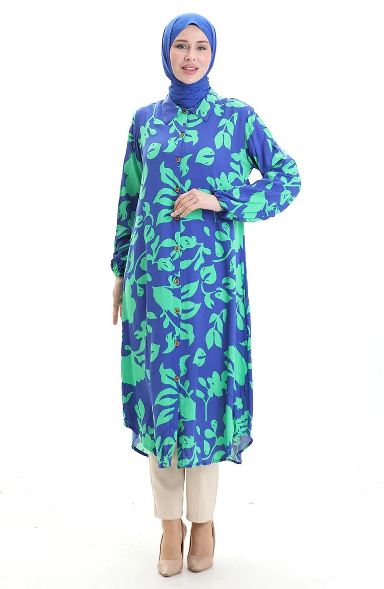 استخدم فيه اللون الأزرق الملكي. فسكوزي نوع من النسيج الصناعي ومريحة للاستخدام. صمم مع القماش المزخرف. استعملت الأزرار ليجعل المنتج سهولة الارتداء. استخدم الكم البيلاستيك. ياقة القميص تفضل في كثير من الكومبينات. مناسب لجميع المواسم. هناك مقاسات كبيرة.