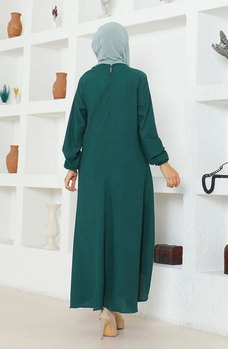 استخدم اللون الأخصر الزمردي. صممه النسيج الشاش. ذو مظهر سادة. استخدم الكم البيلاستيك. من الممكن استعمال المنتج بدون ياقة مع كل ملابس. مناسب لجميع المواسم. هناك مقاسات كبيرة.