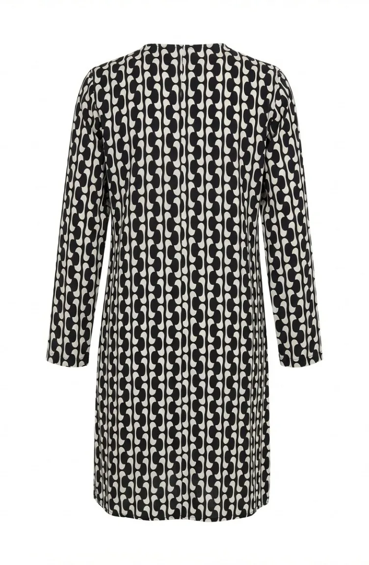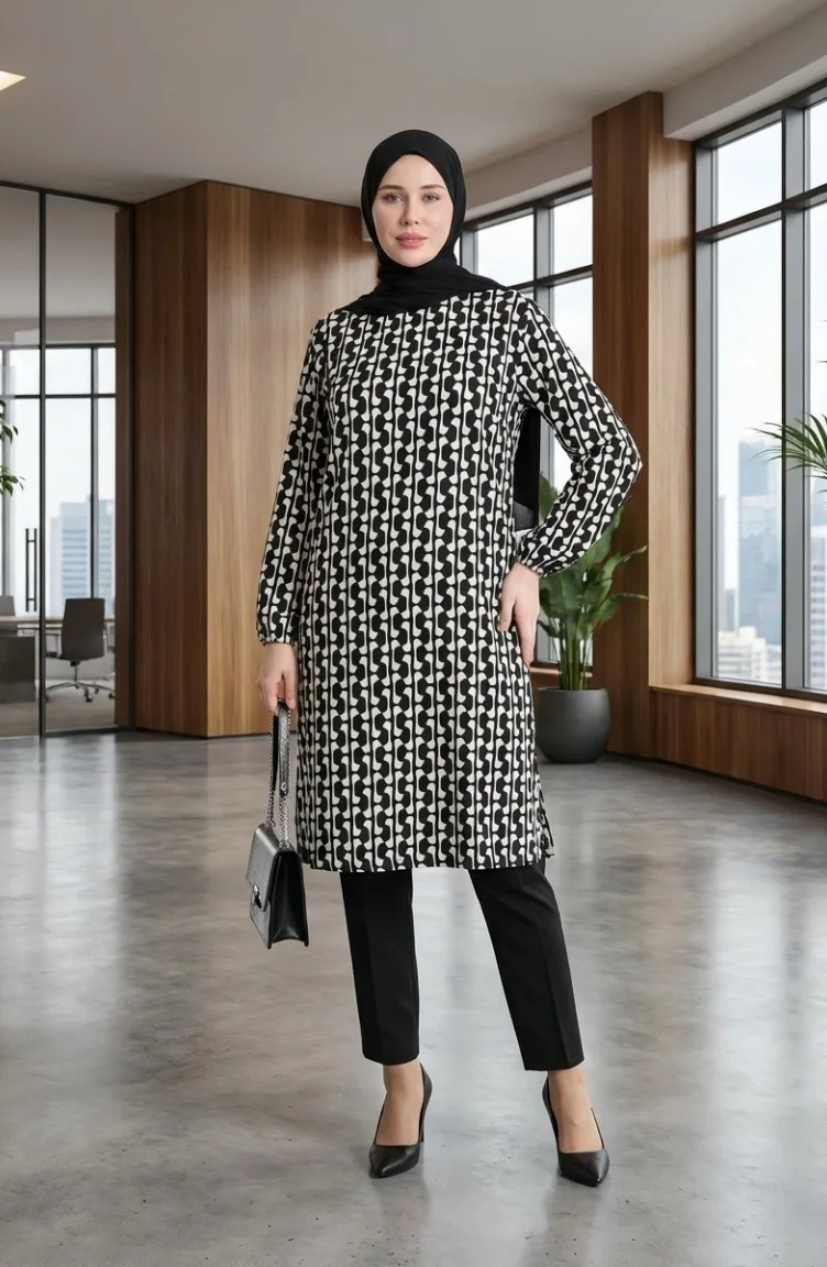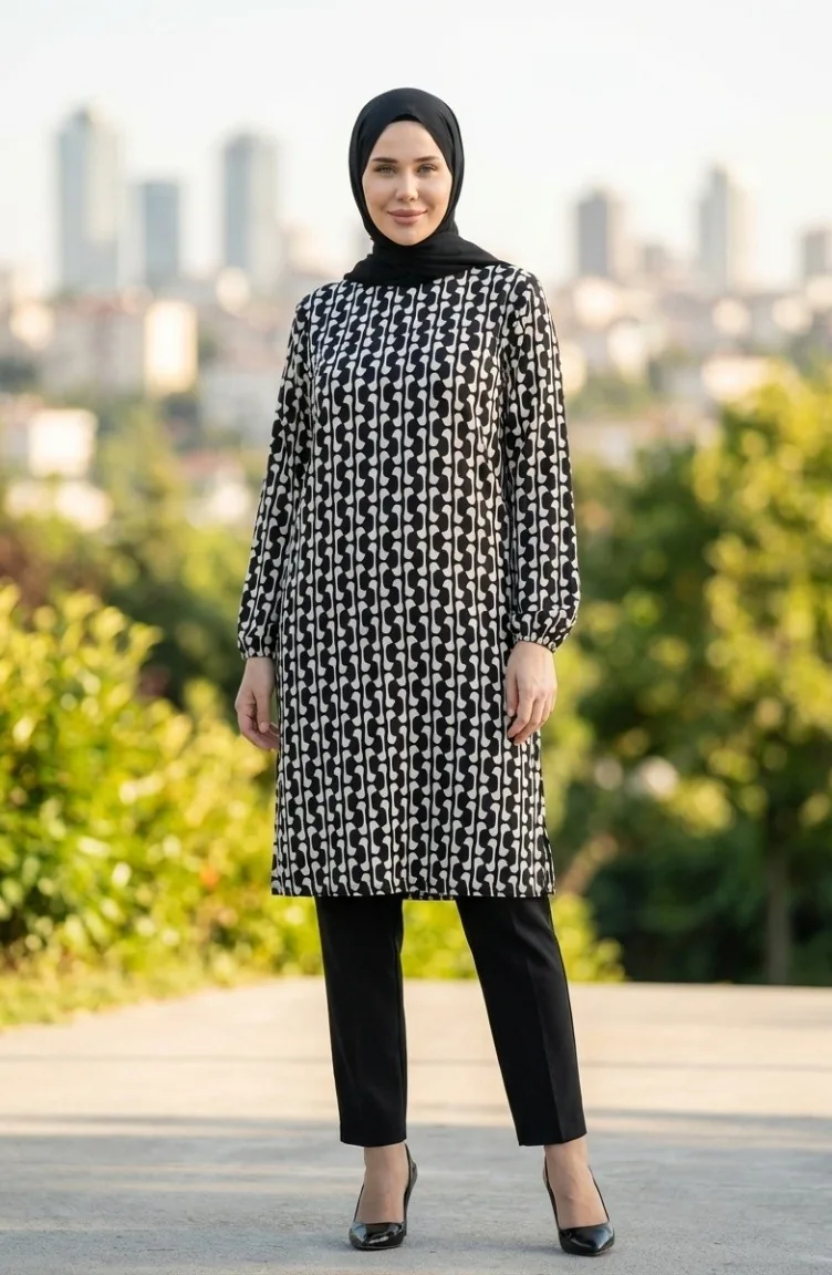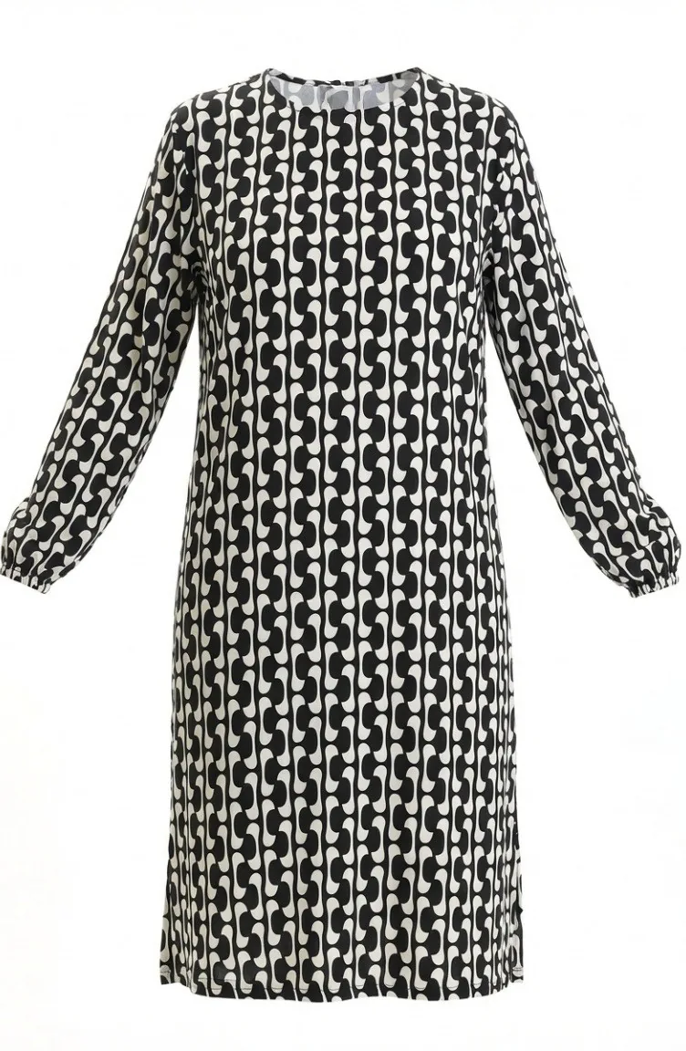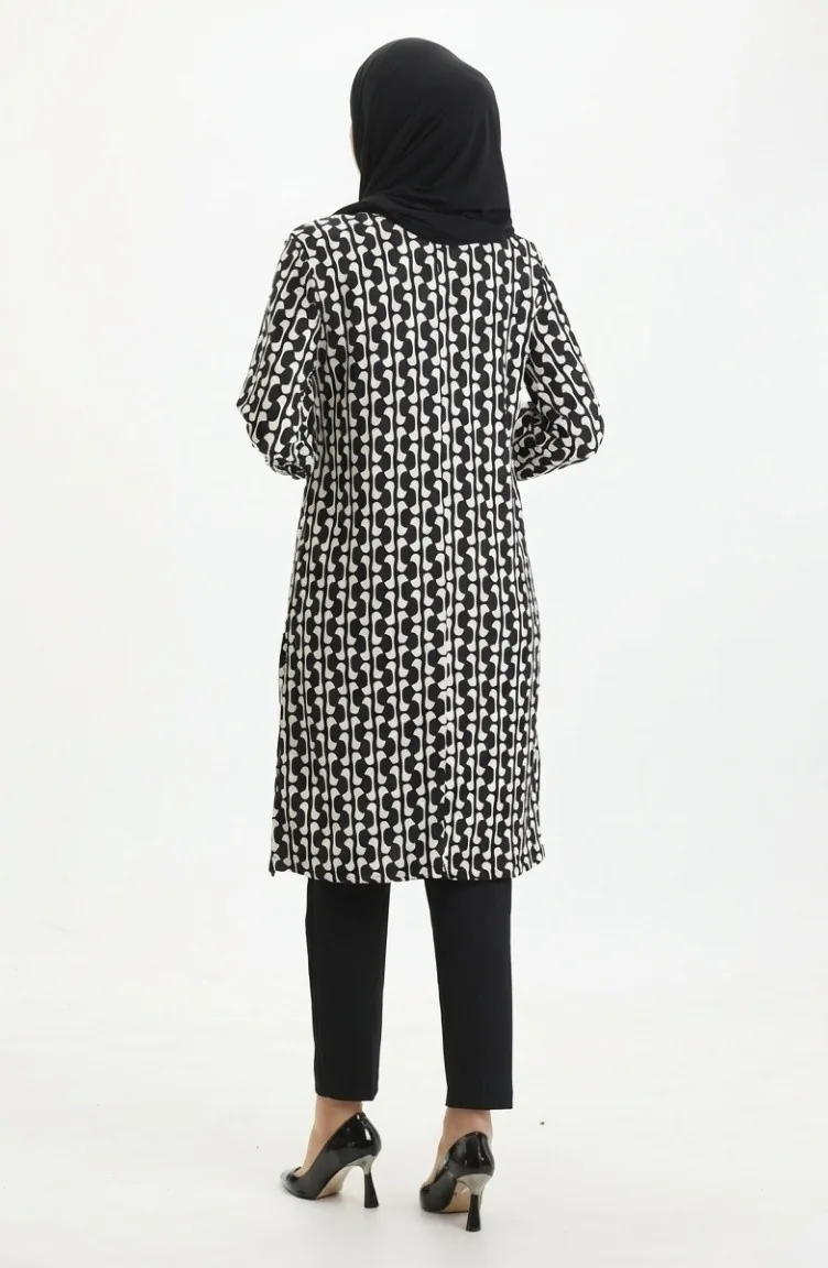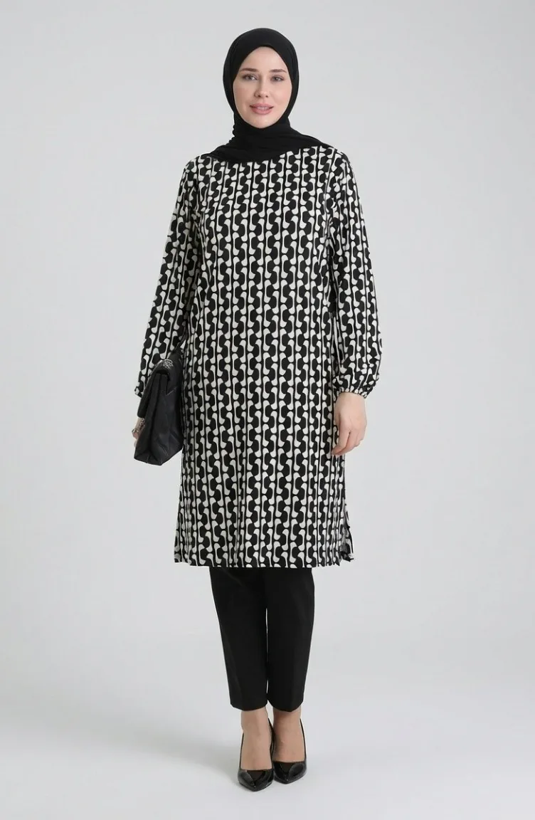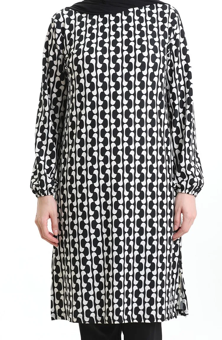 تونيك بتفاصيل شق مطبوعة رقميًا 1005A-01 باللونين الأسود والأبيض 1005A-01