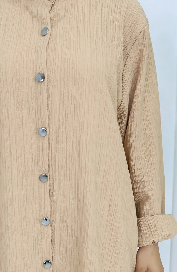 صممه النسيج الشاش. ذو مظهر سادة. استعملت الأزرار ليجعل المنتج سهولة الارتداء. استخدم الكم البيلاستيك. استعمل فيها الياقة الدائرية. مناسب لجميع المواسم. هناك مقاسات كبيرة.