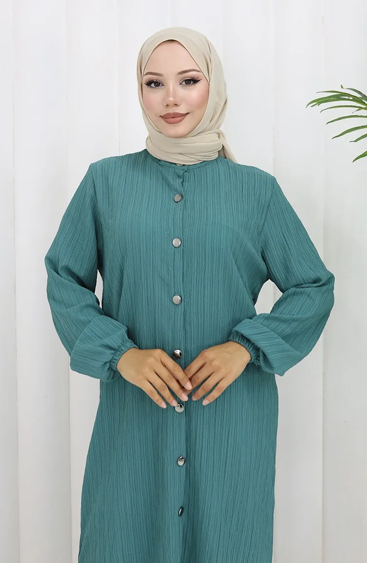 النفط اللون الأزرق استخدامها. صممه النسيج الشاش. ذو مظهر سادة. استعملت الأزرار ليجعل المنتج سهولة الارتداء. استخدم الكم البيلاستيك. استعمل فيها الياقة الدائرية. مناسب لجميع المواسم. هناك مقاسات كبيرة.