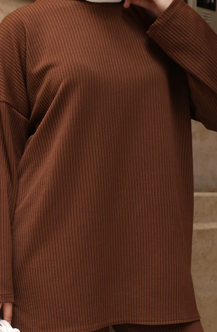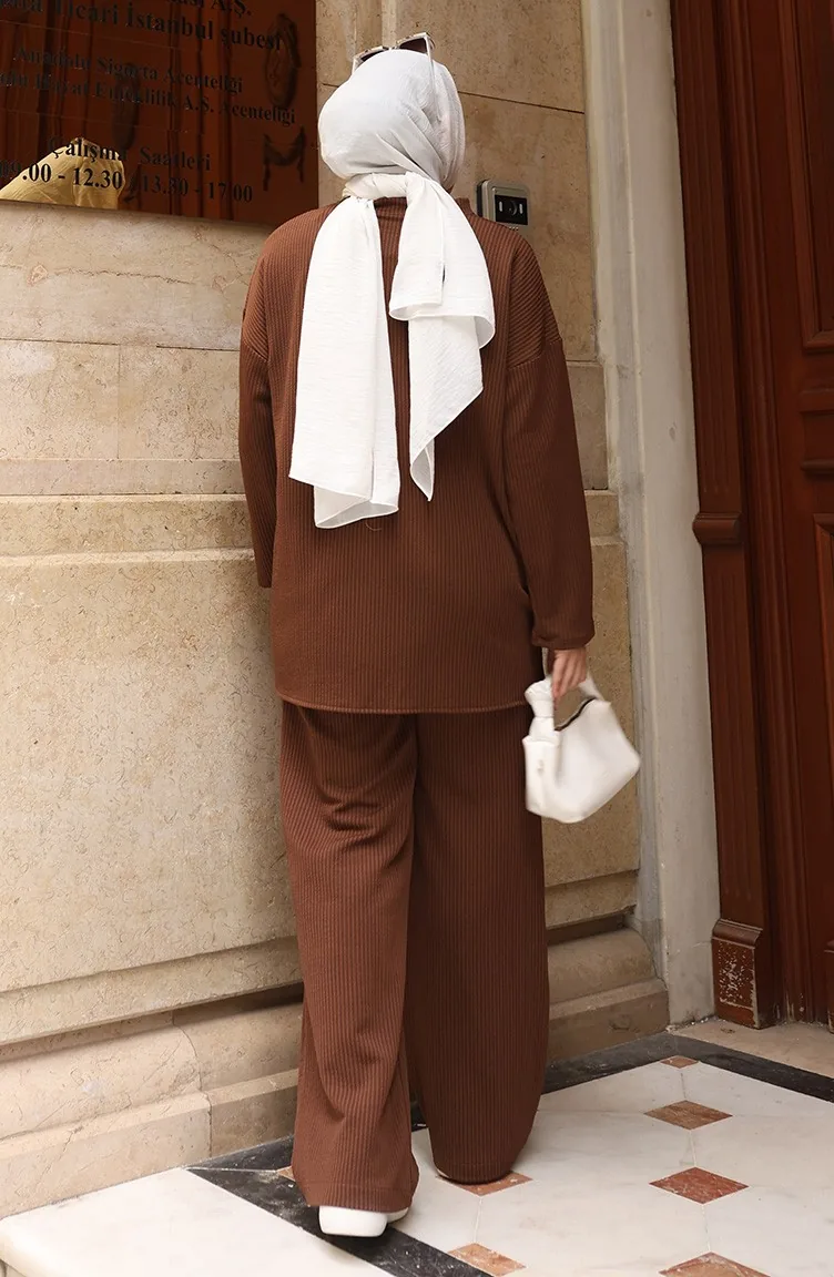 طقم بنطلون حجاب مضلع برباط 2172-01 بني 2172-01