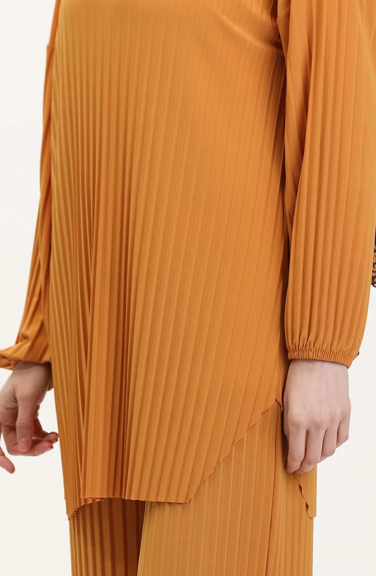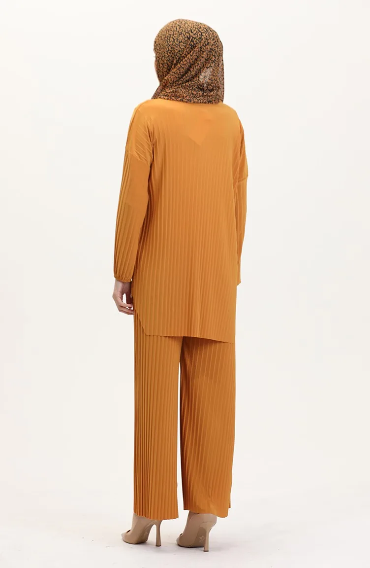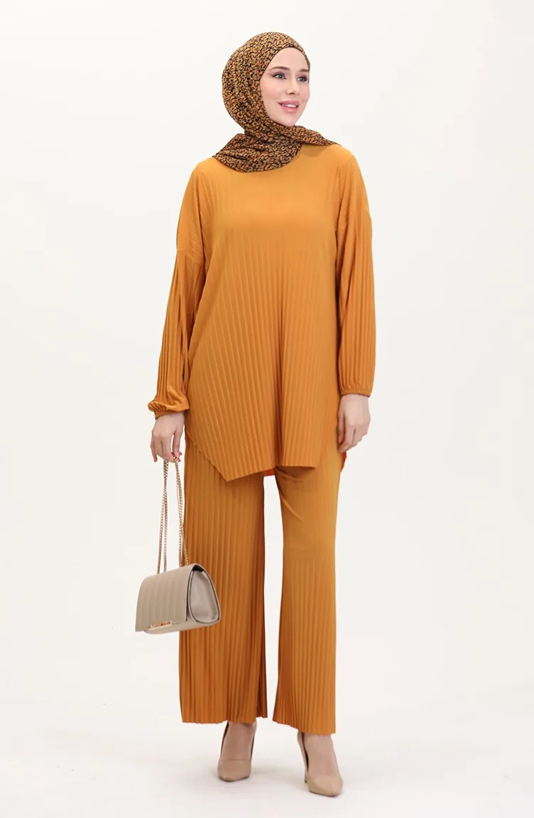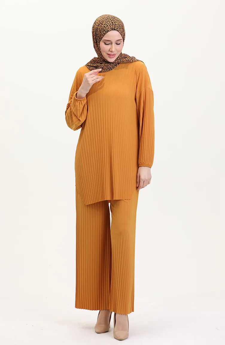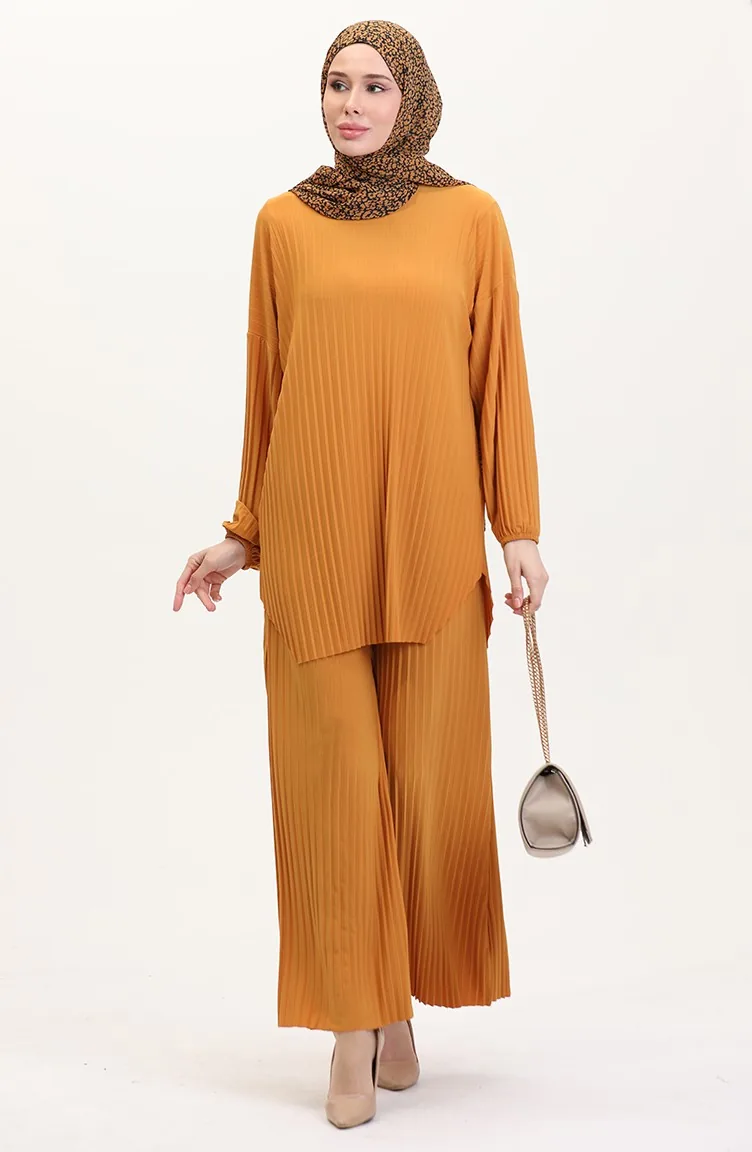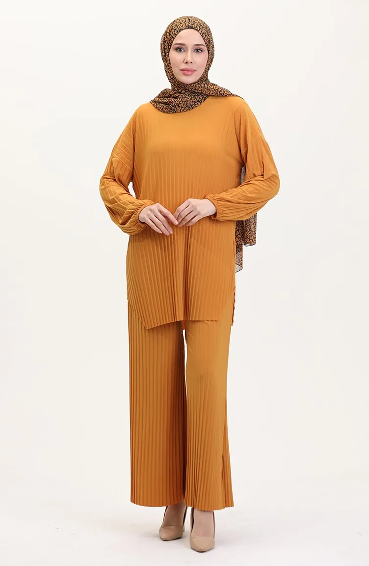 طقم تونيك وبنطلون من قماش ساندي مطوي من قطعتين 0004-02 لون خردلي 0004-02