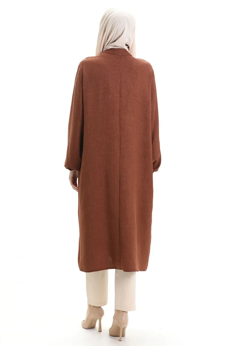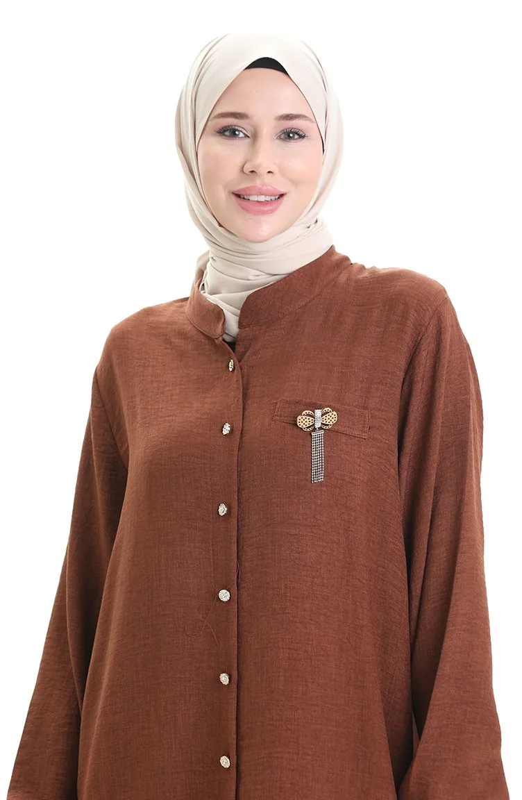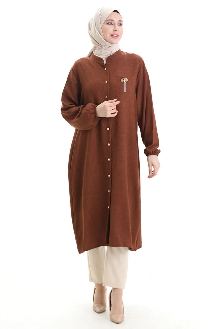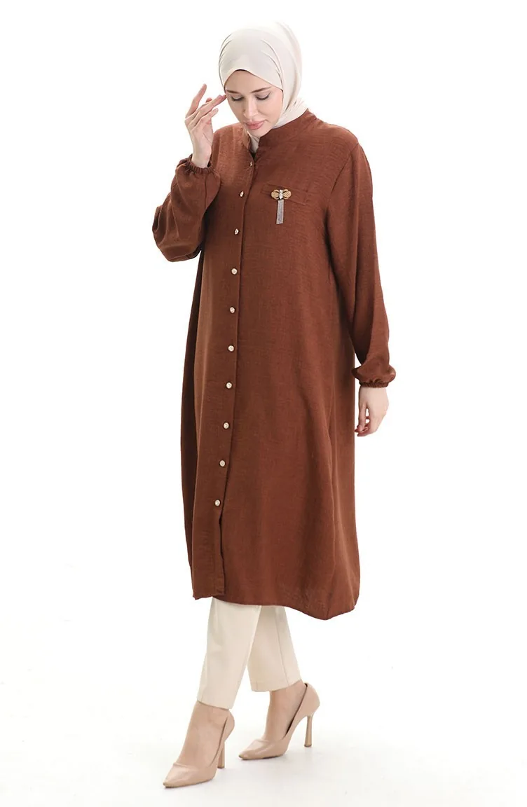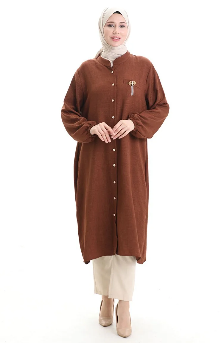 استعمل لون البني. يستعمل قماش الكتان في كل الفصول بسهولة. ذو مظهر سادة. المنتج طويلة الأكمام. من الممكن استعمال المنتج بدون ياقة مع كل ملابس. قماشه مناسب لجميع المواسم. نساء. هناك مقاسات كبيرة.