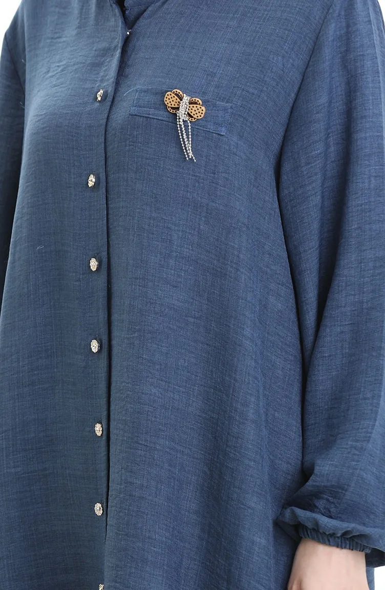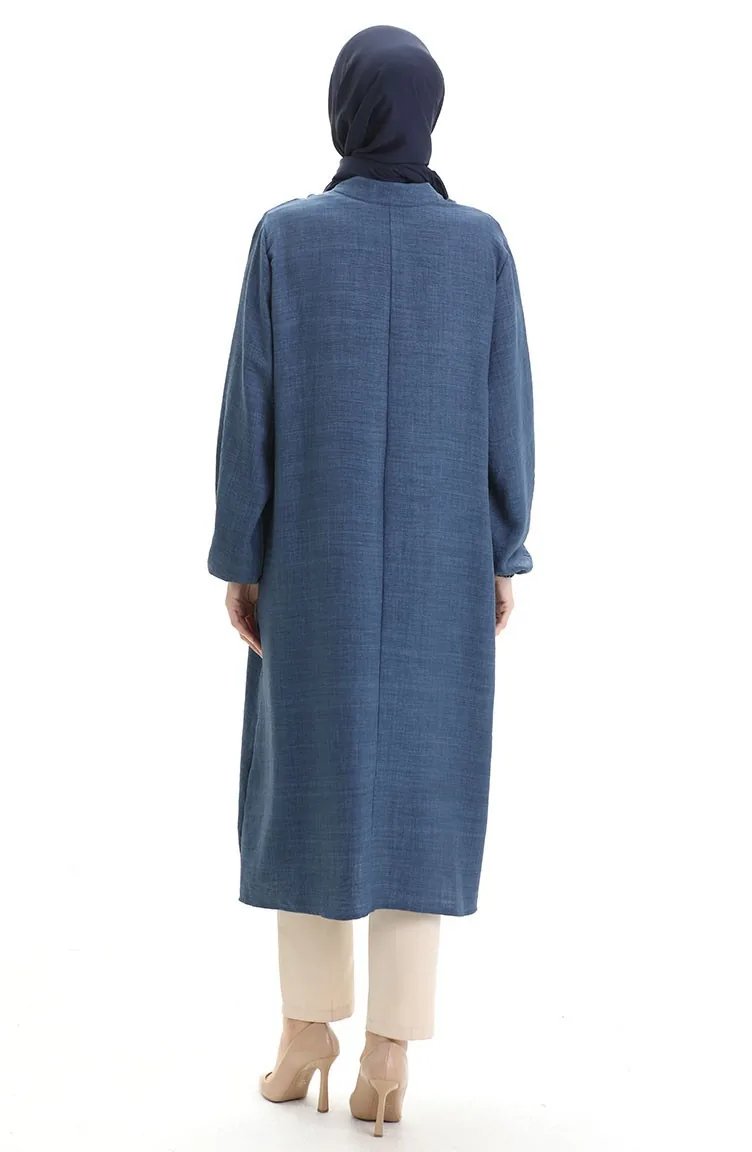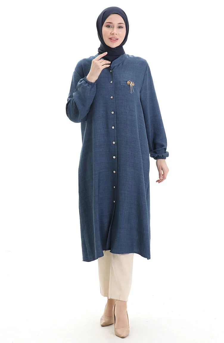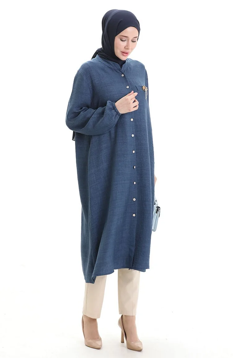 نيلي اللون استخدامها. يستعمل قماش الكتان في كل الفصول بسهولة. ذو مظهر سادة. المنتج طويلة الأكمام. من الممكن استعمال المنتج بدون ياقة مع كل ملابس. قماشه مناسب لجميع المواسم. نساء. هناك مقاسات كبيرة.