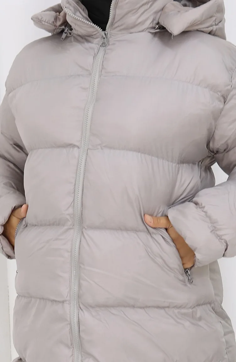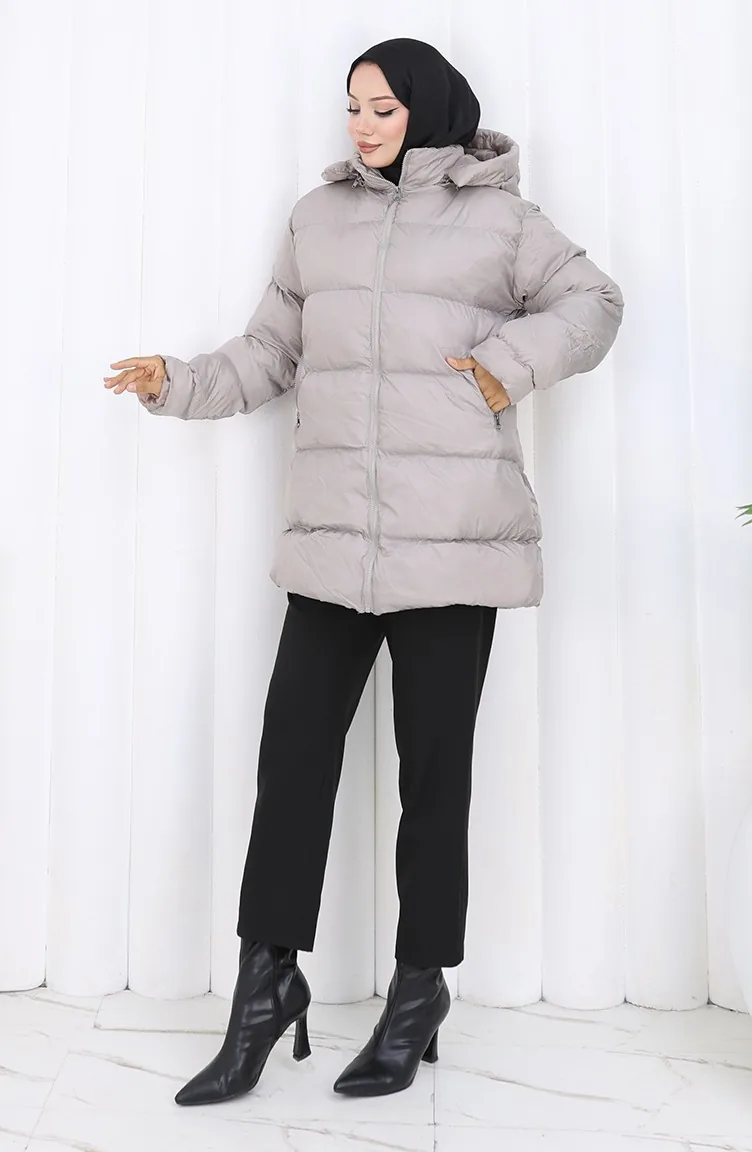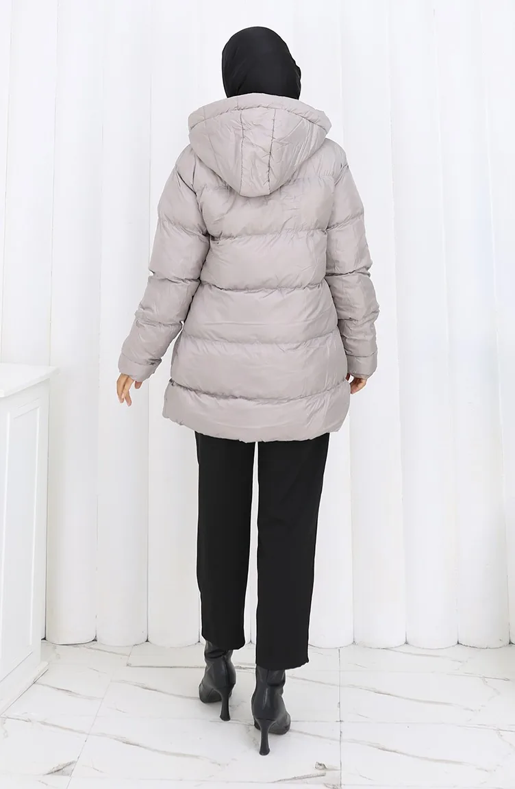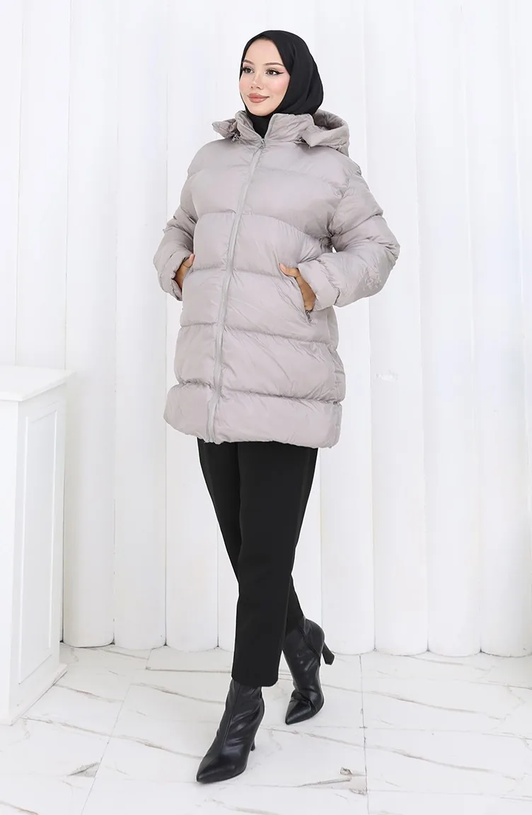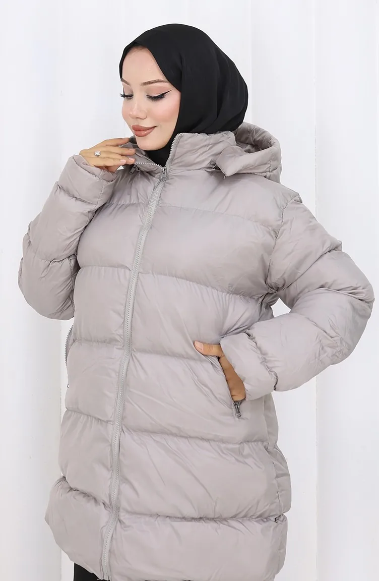 معطف قصير منتفخ بغطاء رأس وسحاب 0176-02 رمادي 0176-02
