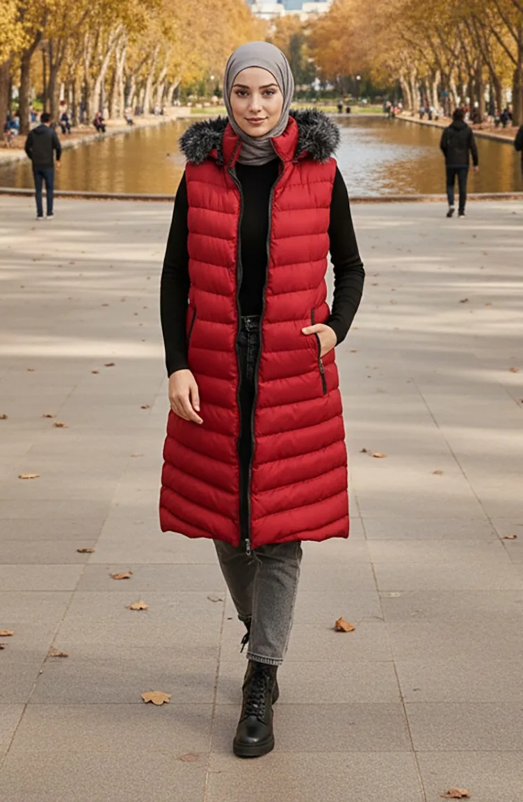 سترة منتفخة بغطاء رأس وسحاب 70030-01 أحمر كلاريت 70030-01