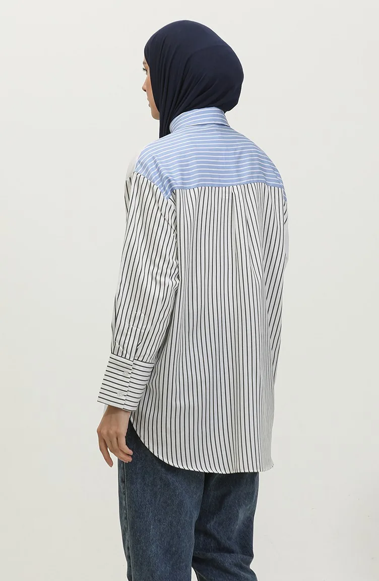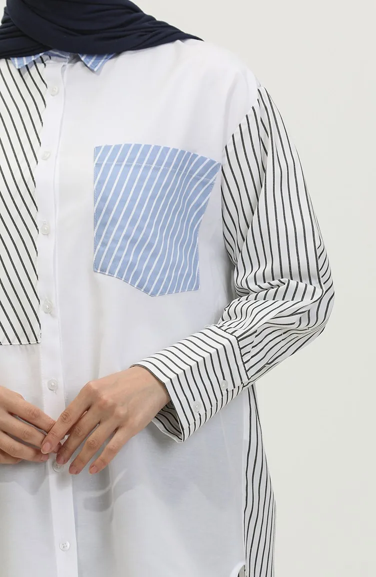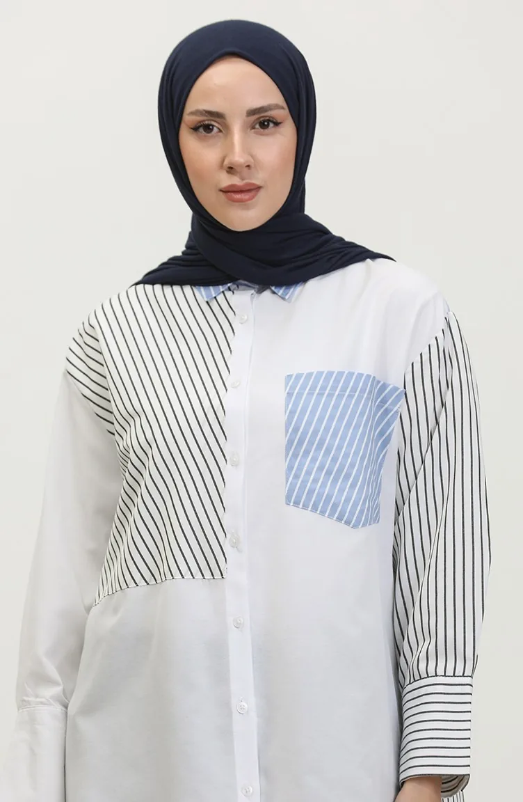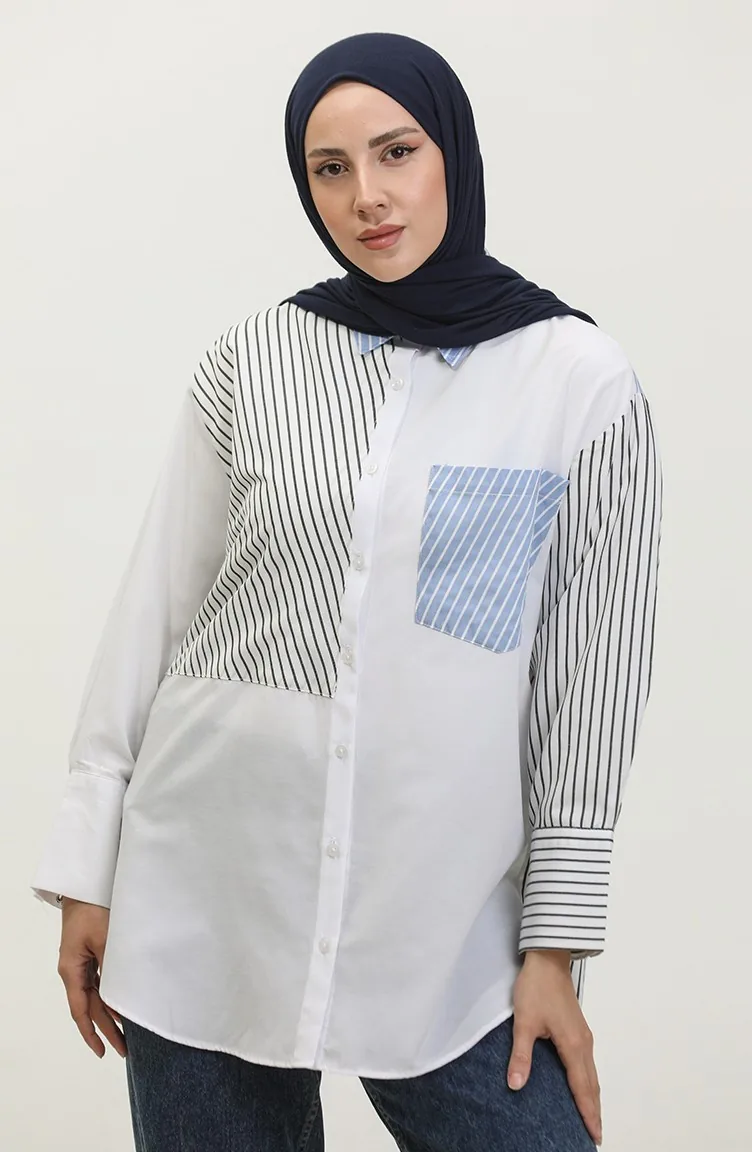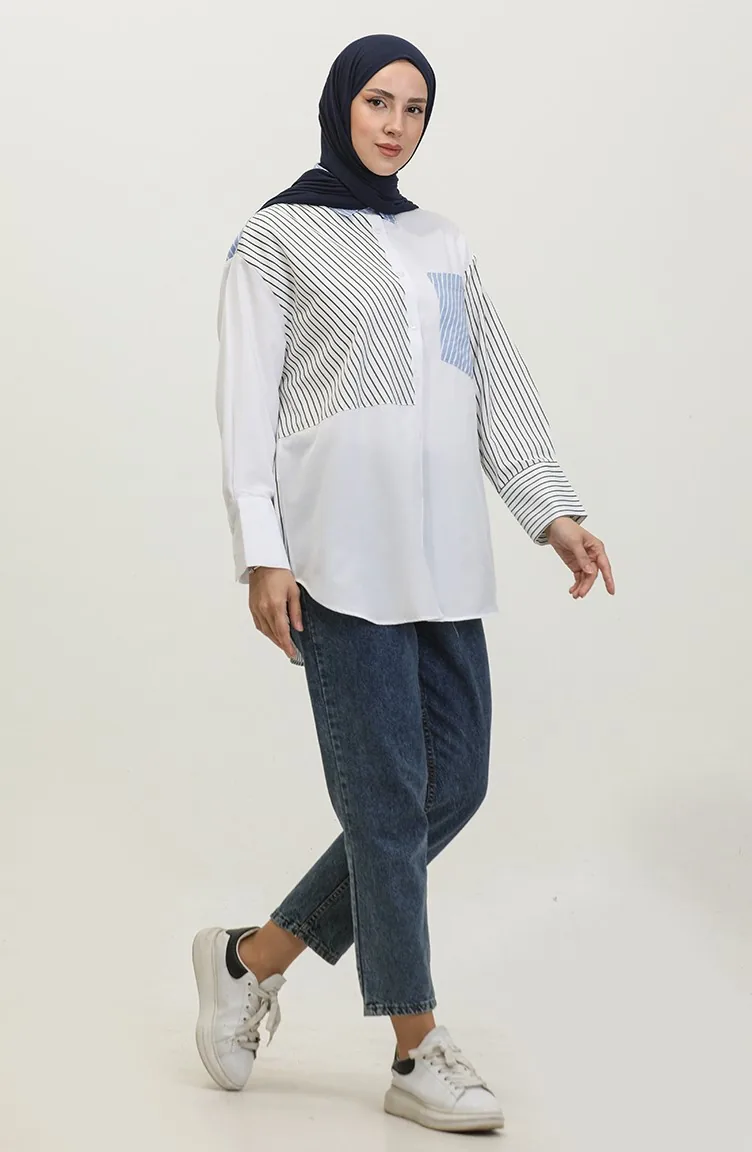 استعمل لون الأبيض. نسيج القطن لديه نسيج ماص. صمم من القماش المخطط. المنتج ذو الاستخدام بدون تبطين. المنتج طويلة الأكمام. ياقة القميص تفضل في كثير من الكومبينات. مناسب لجميع المواسم. هناك مقاسات كبيرة.
