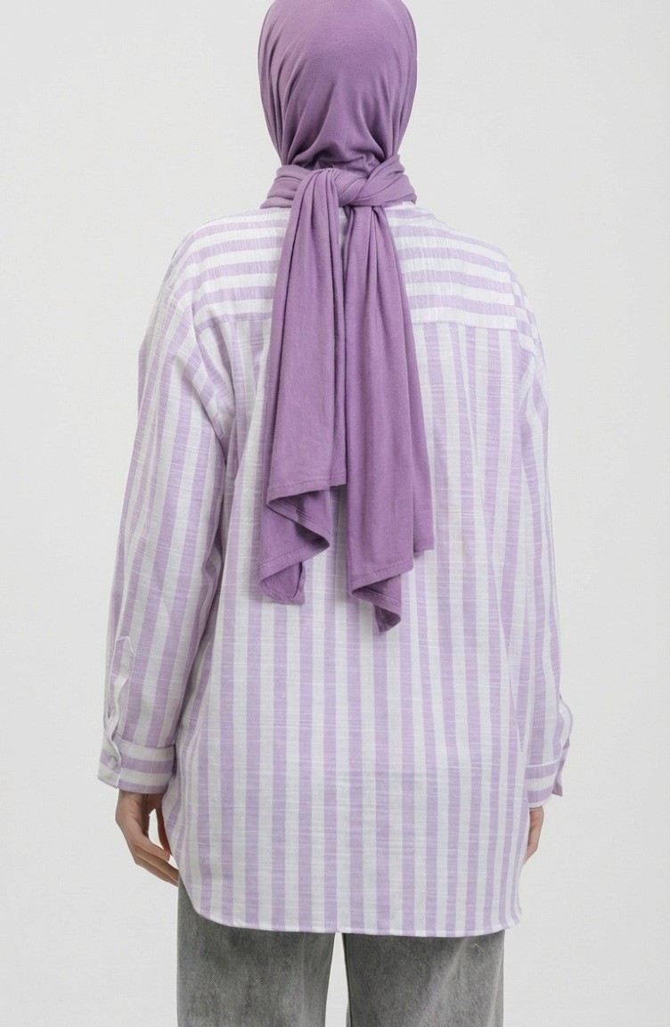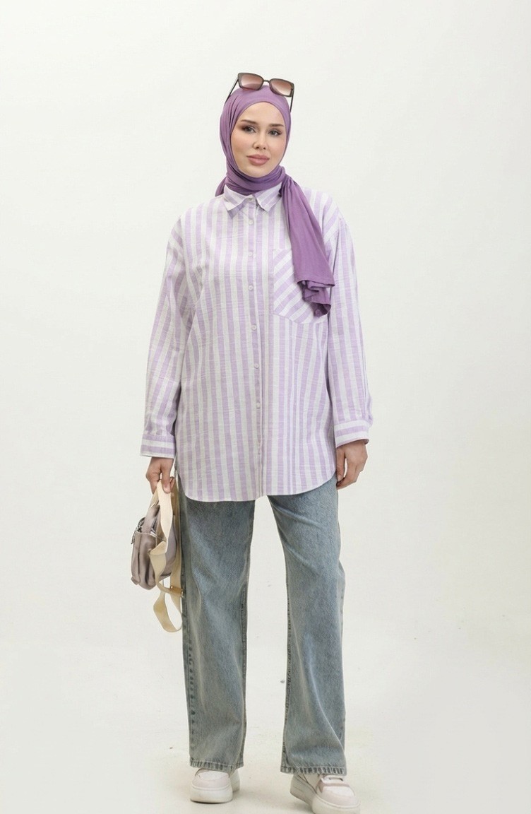 اللون: ليلكي. نسيج القطن لديه نسيج ماص. صمم من القماش المخطط. المنتج ذو الاستخدام بدون تبطين. المنتج طويلة الأكمام. ياقة القميص تفضل في كثير من الكومبينات. مناسب لجميع المواسم. هناك مقاسات كبيرة.