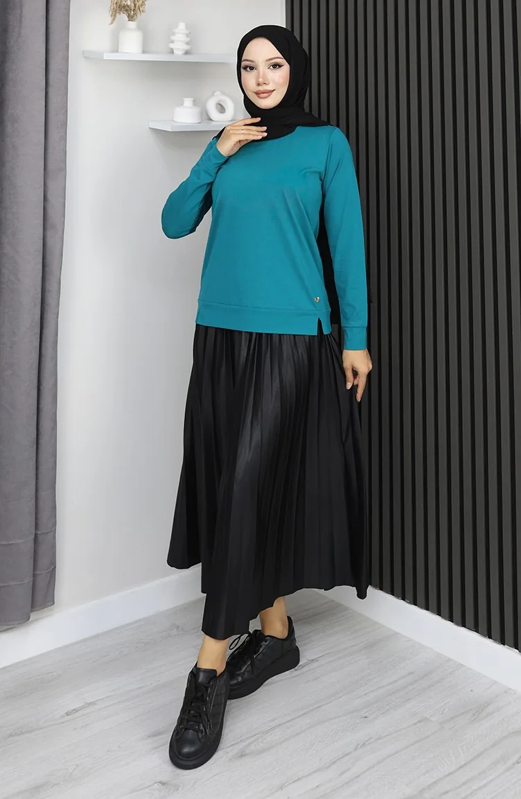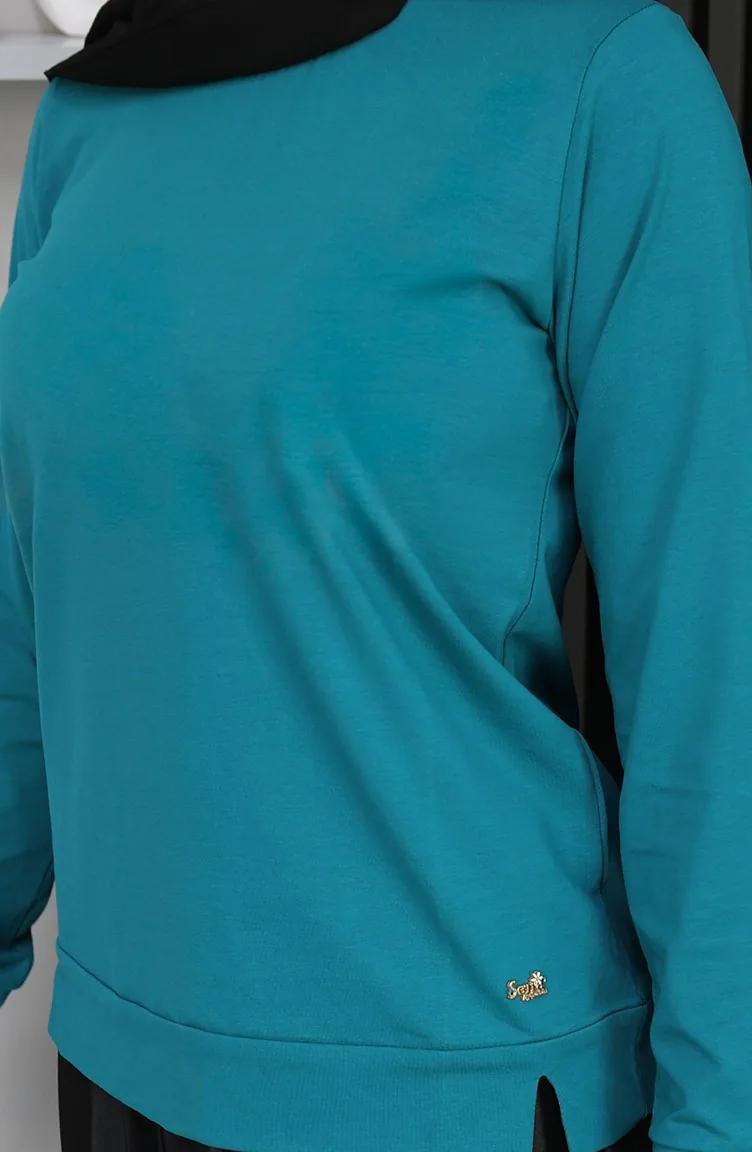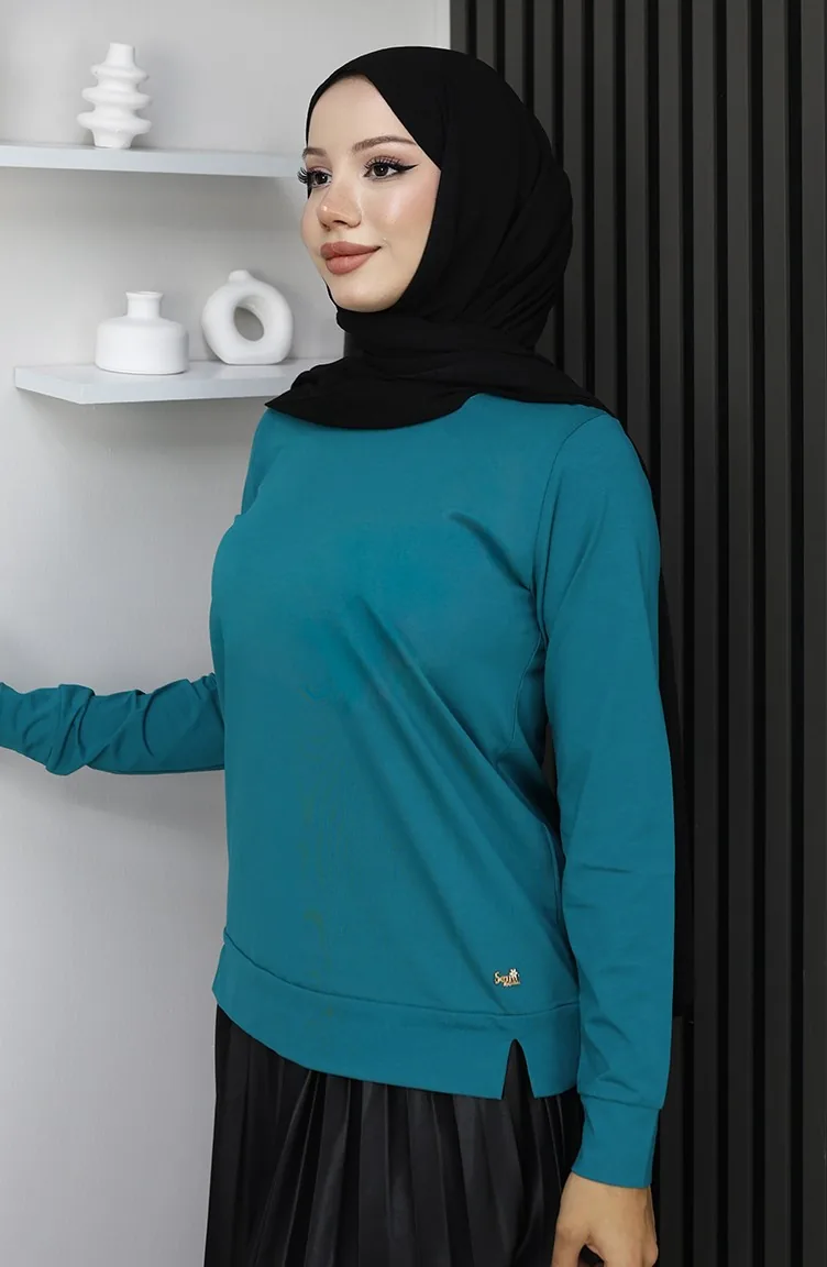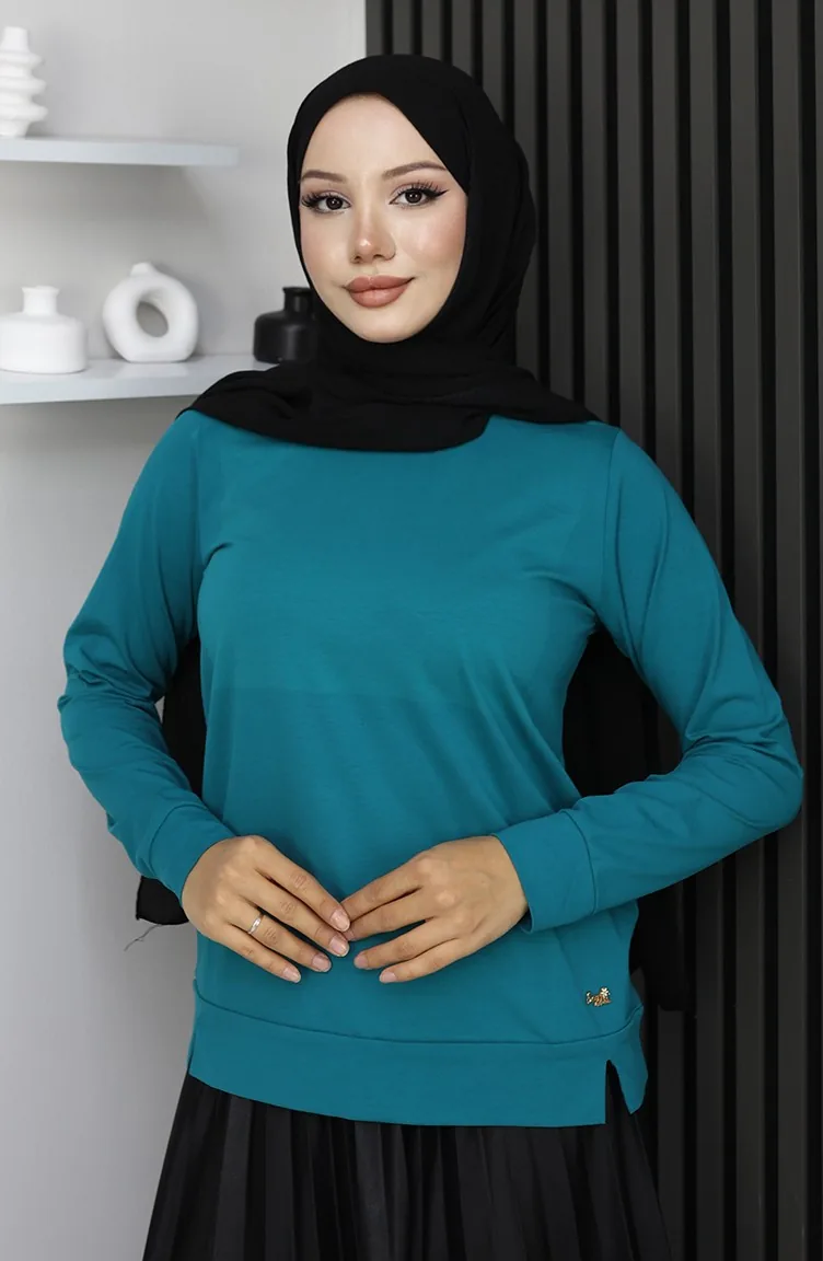 بلوزة قطنية ممشطة بتفاصيل مشقوقة 1064-02 بترولي 1064-02
