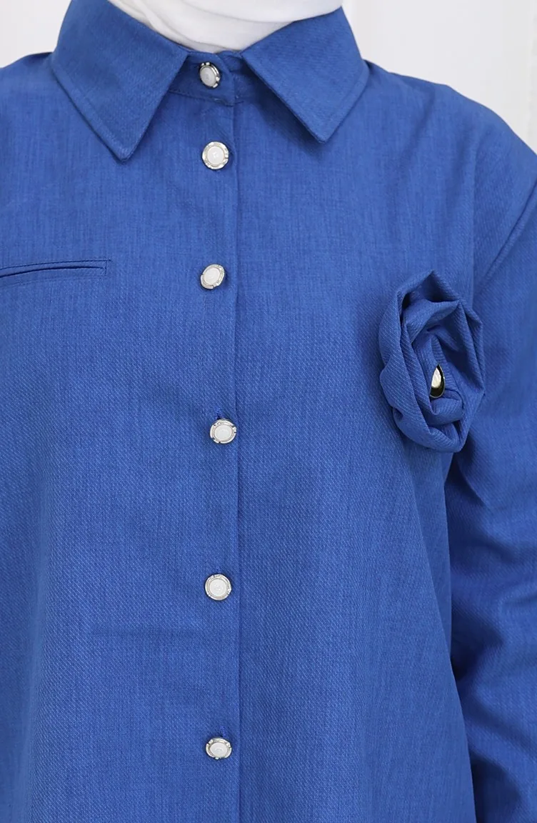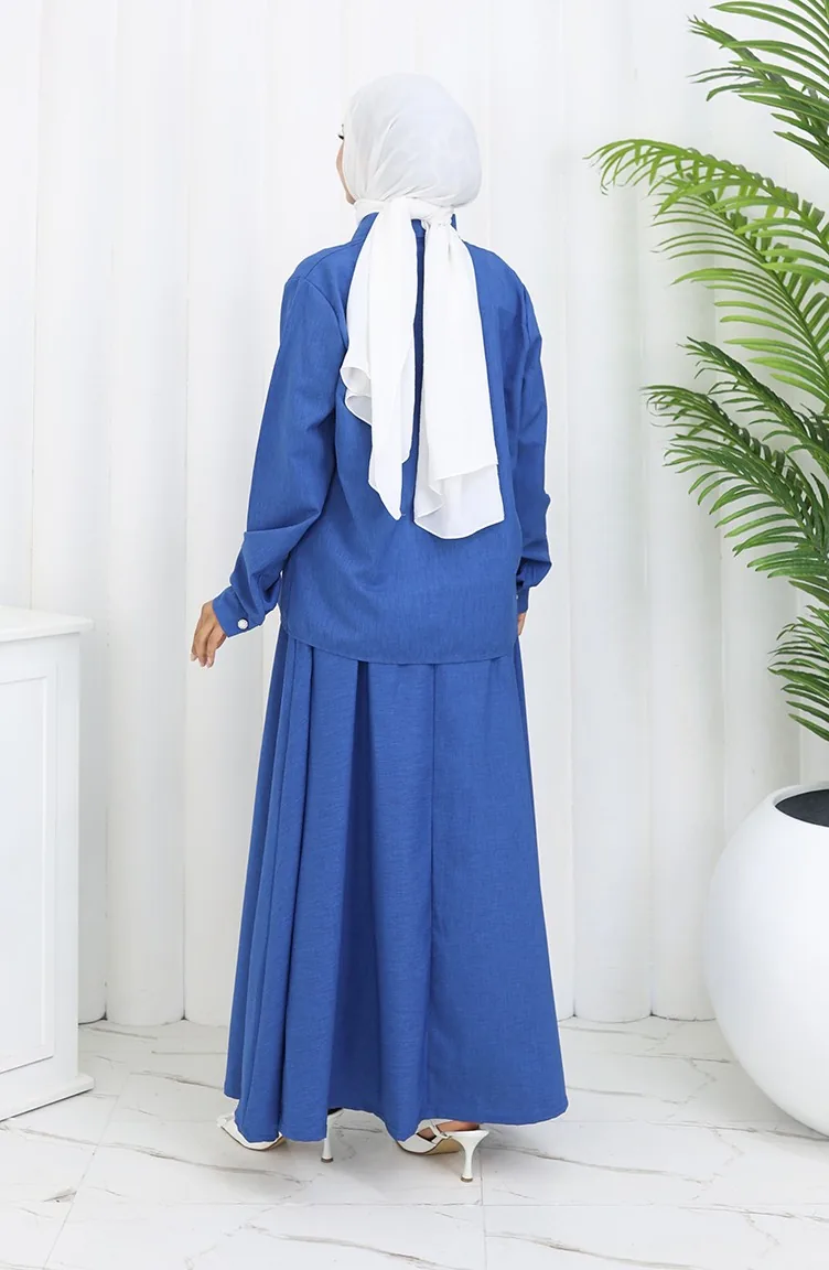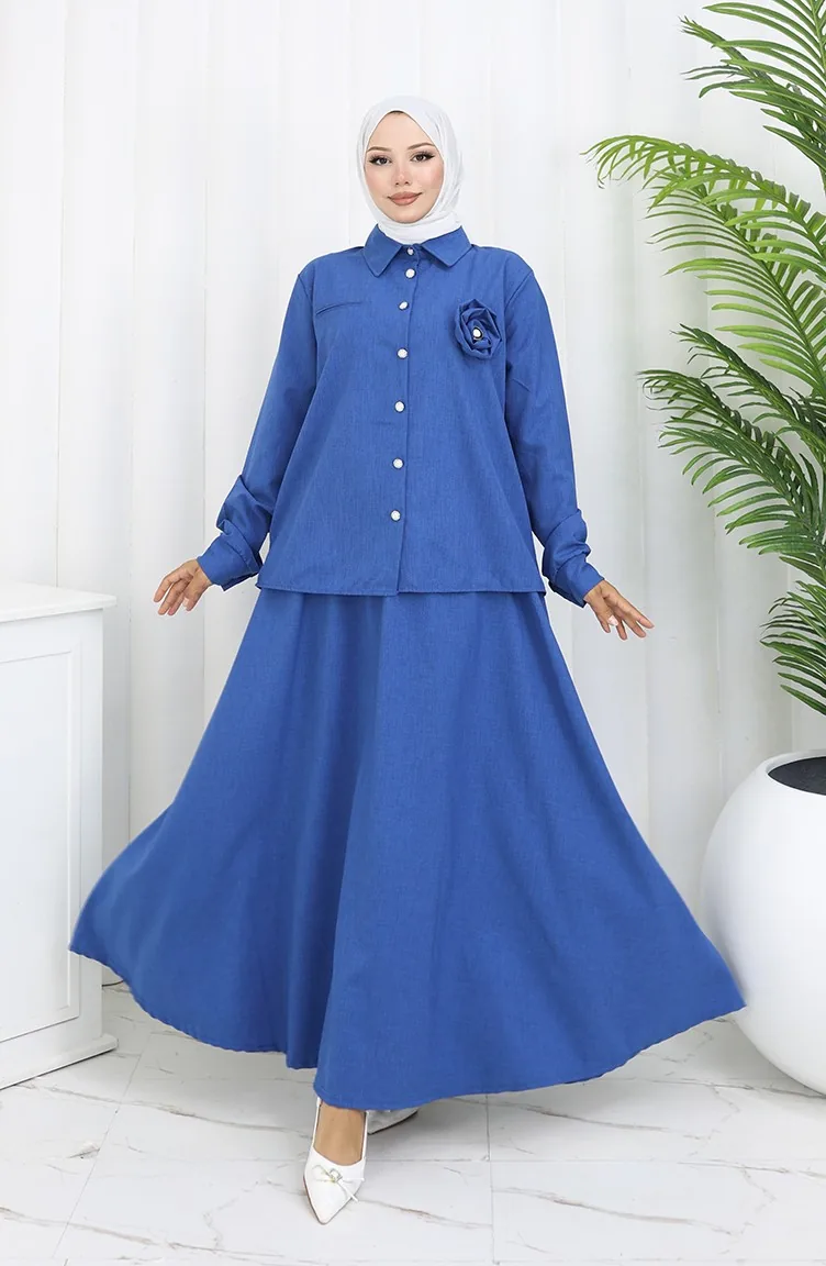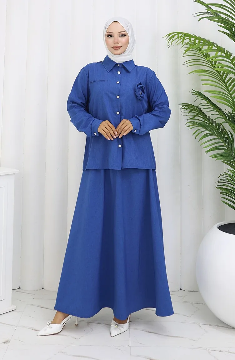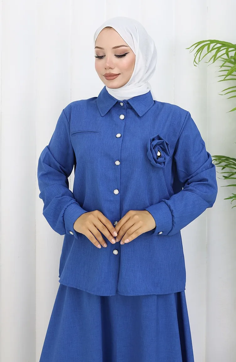 بدلة من قطعتين، قميص وتنورة بتفاصيل وردية، 2088-05، أزرق داكن 2088-05