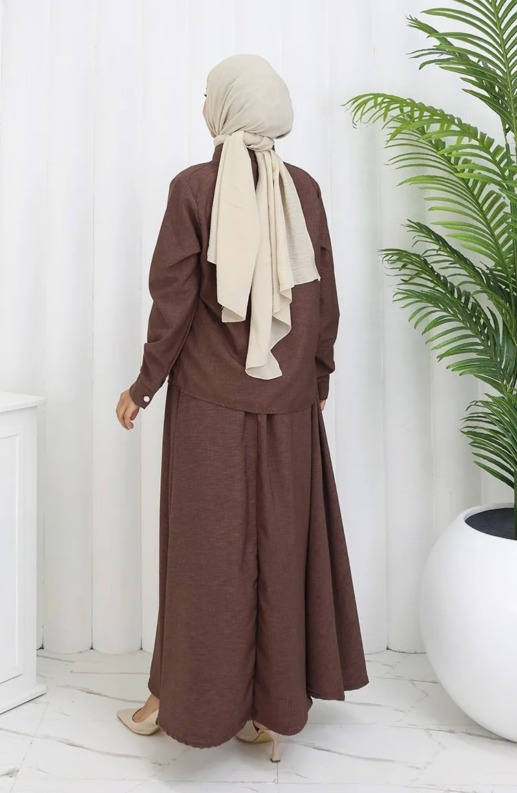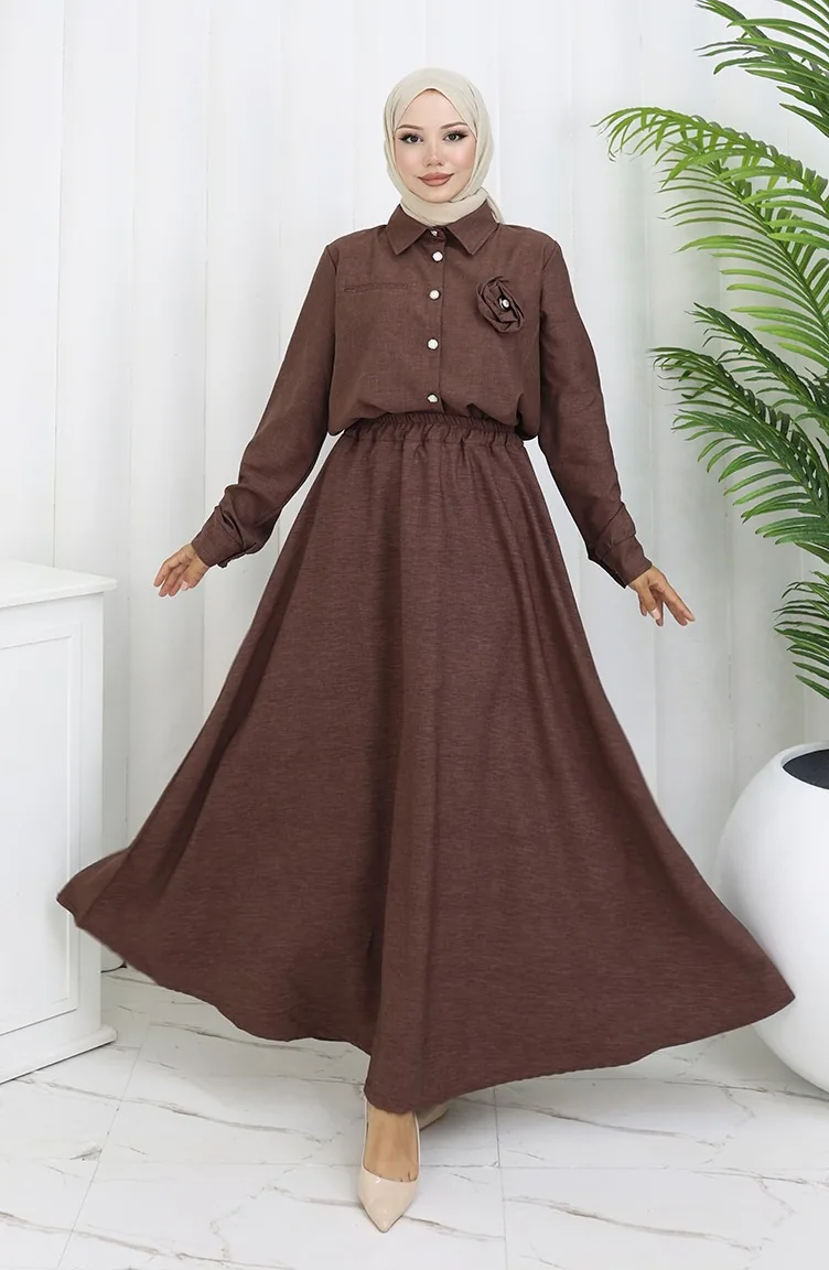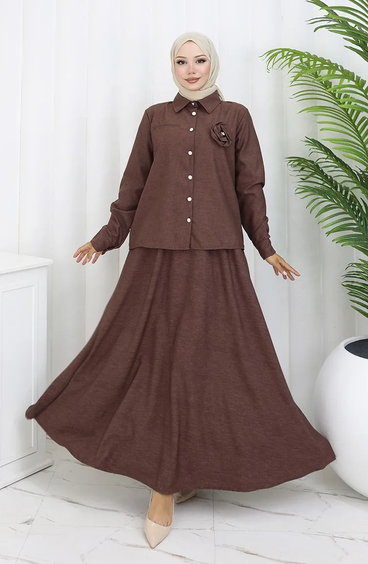 بدلة من قطعتين، قميص وتنورة بتفاصيل وردية، 2088-07، بني 2088-07