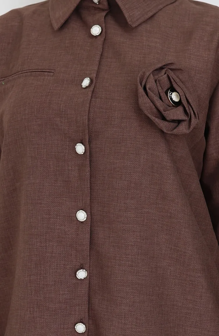 استعمل لون البني. نسيج القطن لديه نسيج ماص. ذو مظهر سادة. استعملت الأزرار ليجعل المنتج سهولة الارتداء. ياقة القميص تفضل في كثير من الكومبينات. مناسب لجميع المواسم. هناك مقاسات كبيرة.