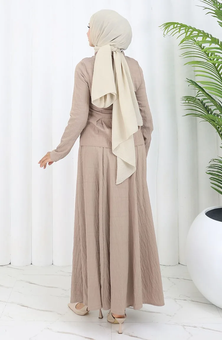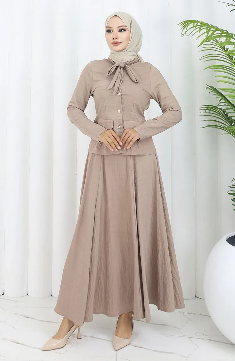 استخدم فيه اللون الشوكو. قماش البوليستر لا يحتاج كثيرا إلى الكوي. ذو مظهر سادة. استعملت الأزرار ليجعل المنتج سهولة الارتداء. مناسب لجميع المواسم. هناك مقاسات كبيرة.