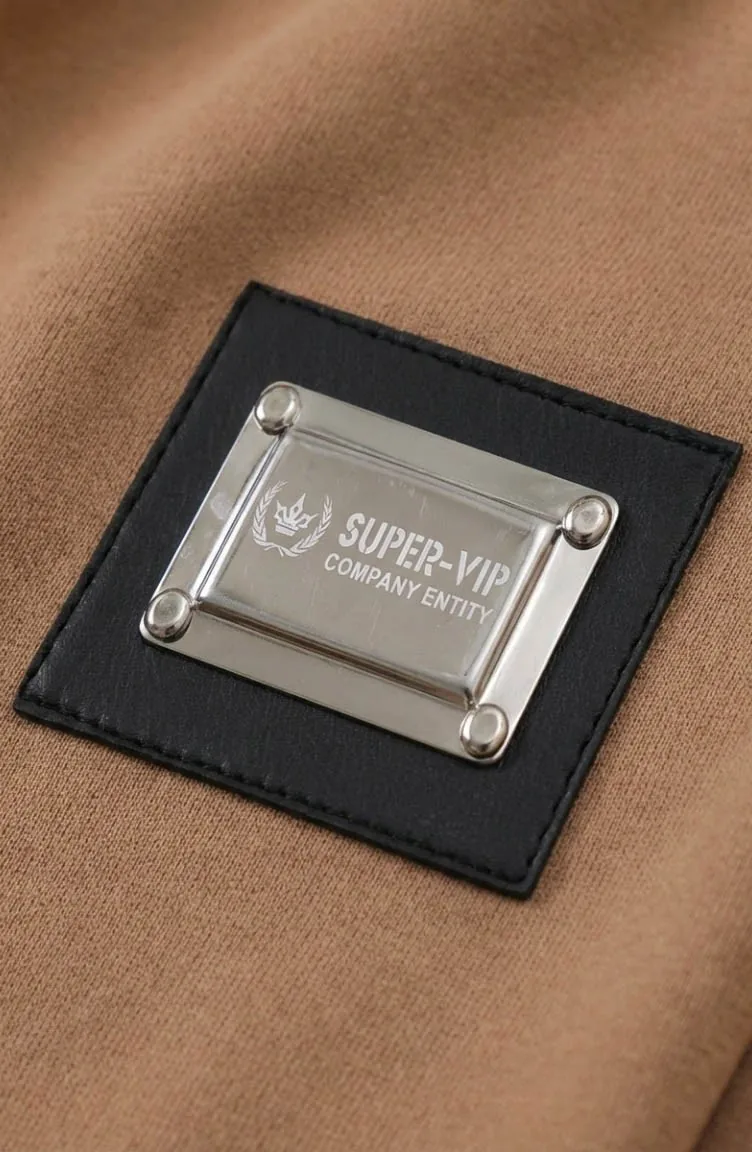 طقم مكون من قطعتين، سترة وبنطال، مزين بشعار، رقم الموديل 0228-01، لون قهوة بالحليب 0228-01