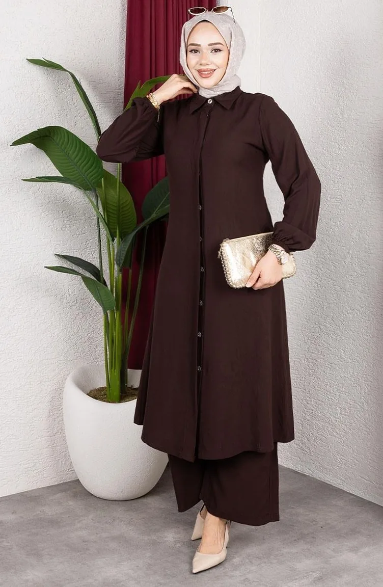 استعمل لون البني. فسكوزي نوع من النسيج الصناعي ومريحة للاستخدام. ذو مظهر سادة. استعملت الأزرار ليجعل المنتج سهولة الارتداء. استخدم الكم البيلاستيك. ياقة القميص تفضل في كثير من الكومبينات. مناسب لجميع المواسم. هناك مقاسات كبيرة.