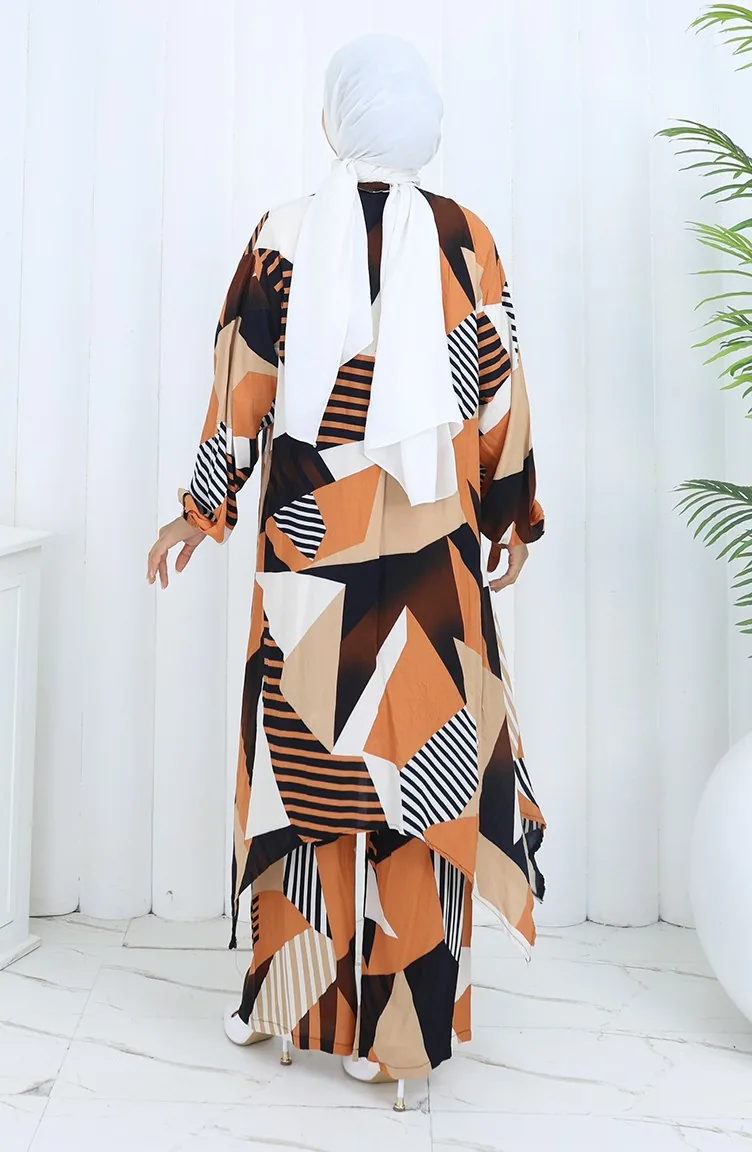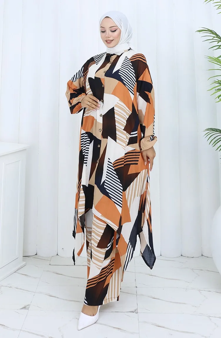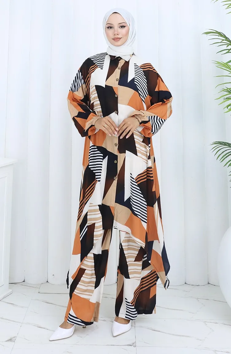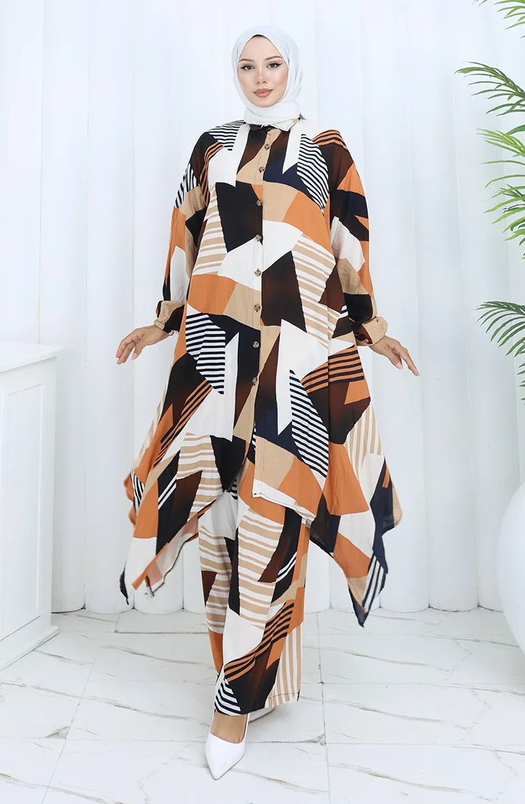بدلة تونيك وبنطلون من قماش فيسكوز مكونة من قطعتين 2140-02 بني 2140-02