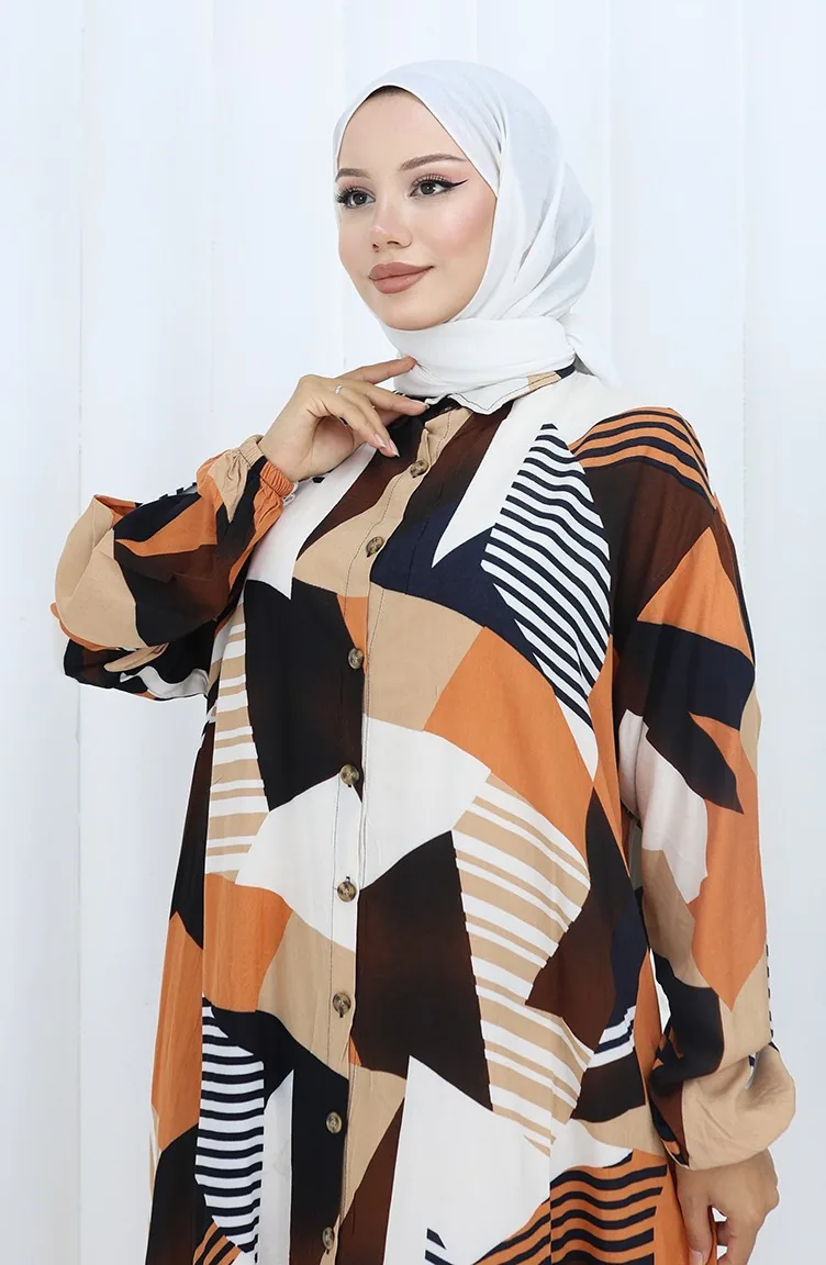 استعمل لون البني. فسكوزي نوع من النسيج الصناعي ومريحة للاستخدام. صمم مع القماش المزخرف. استعملت الأزرار ليجعل المنتج سهولة الارتداء. استخدم الكم البيلاستيك. ياقة القميص تفضل في كثير من الكومبينات. مناسب لجميع المواسم. هناك مقاسات كبيرة.