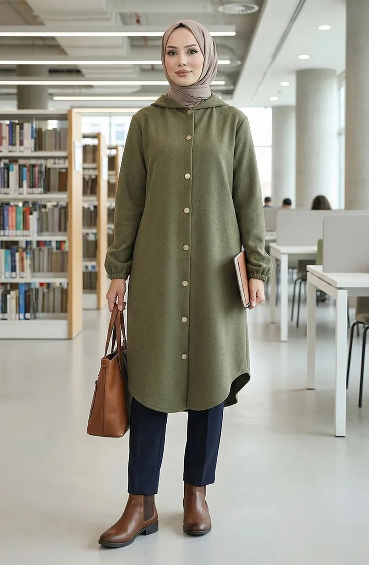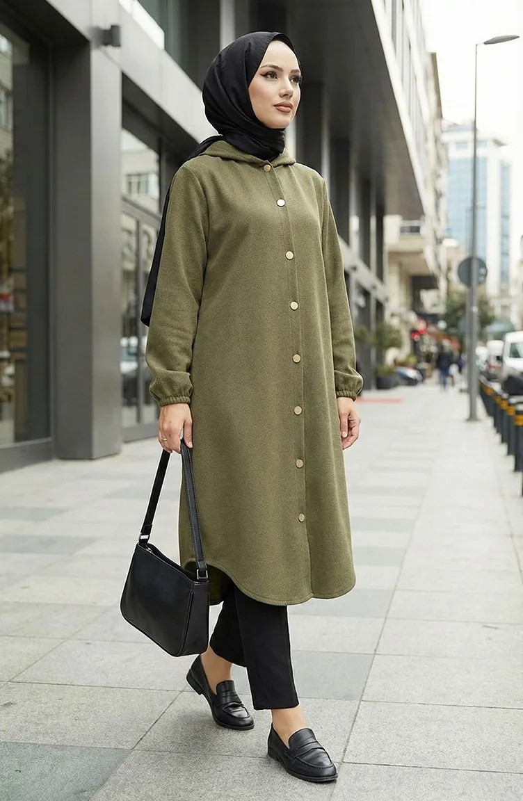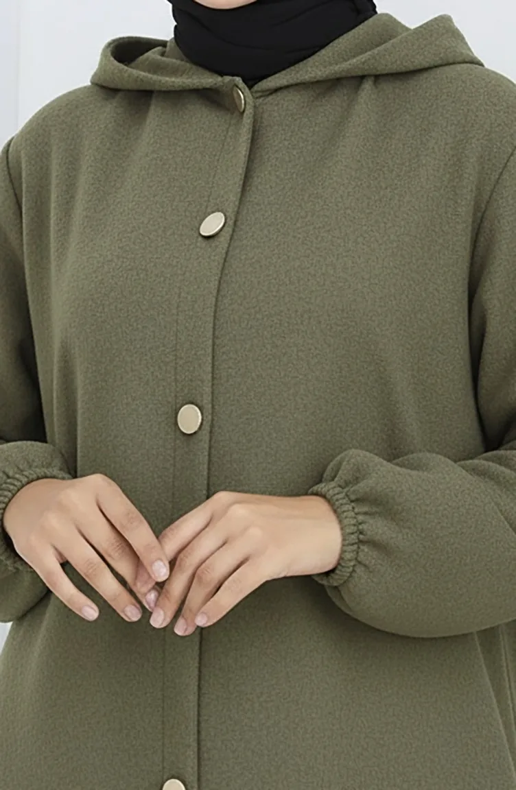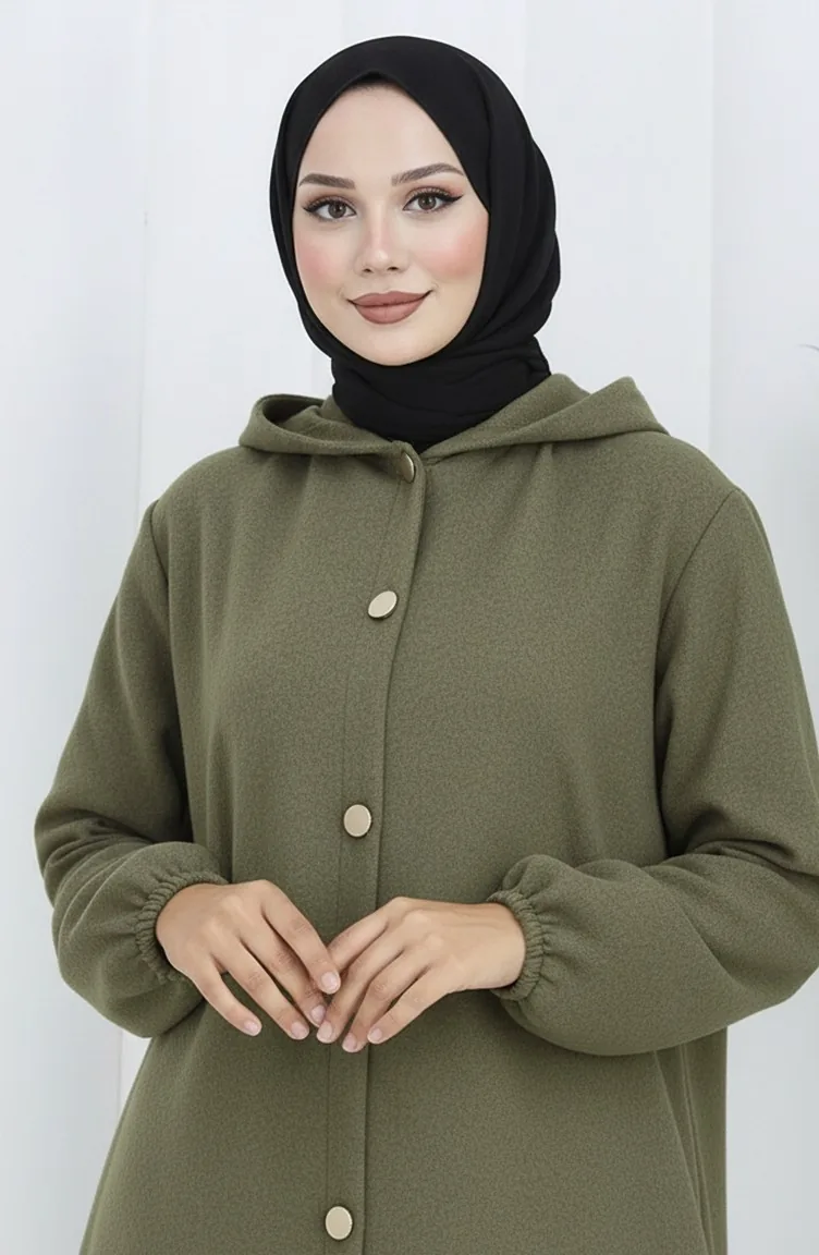 معطف كشمير بغطاء رأس وأزرار أمامية 0188-04 كاكي أخضر 0188-04