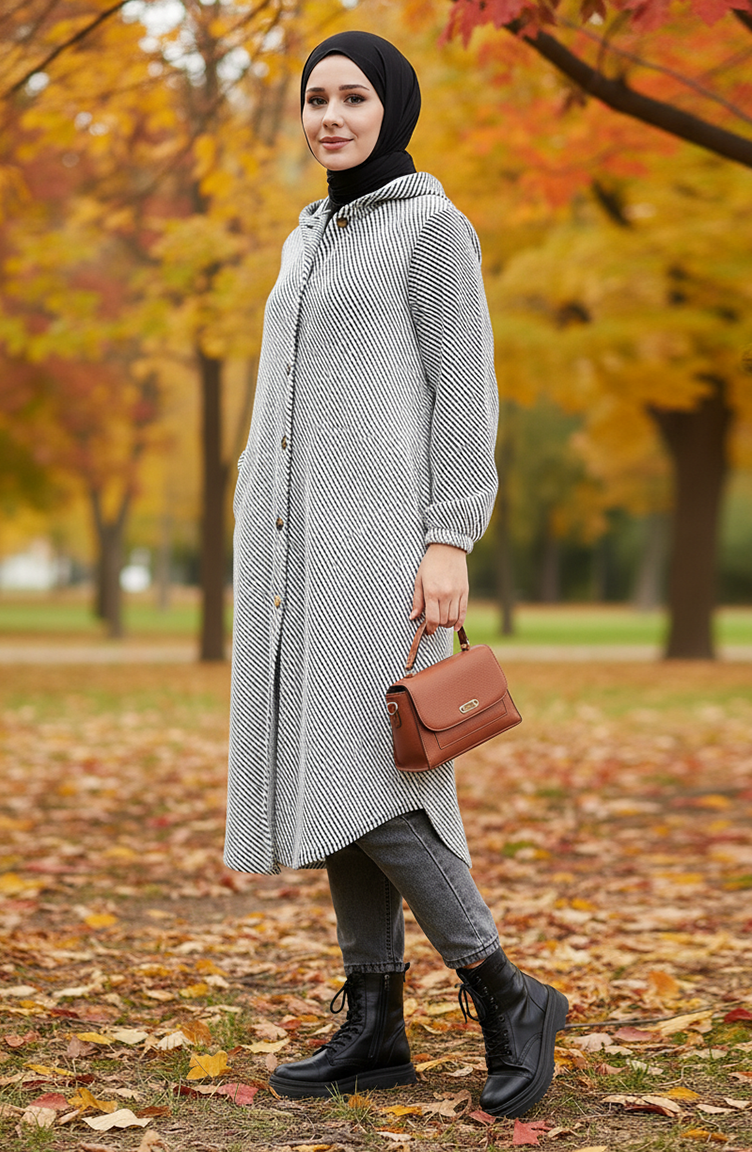 معطف كشمير بغطاء رأس وأزرار 0201-04 أبيض 0201-04