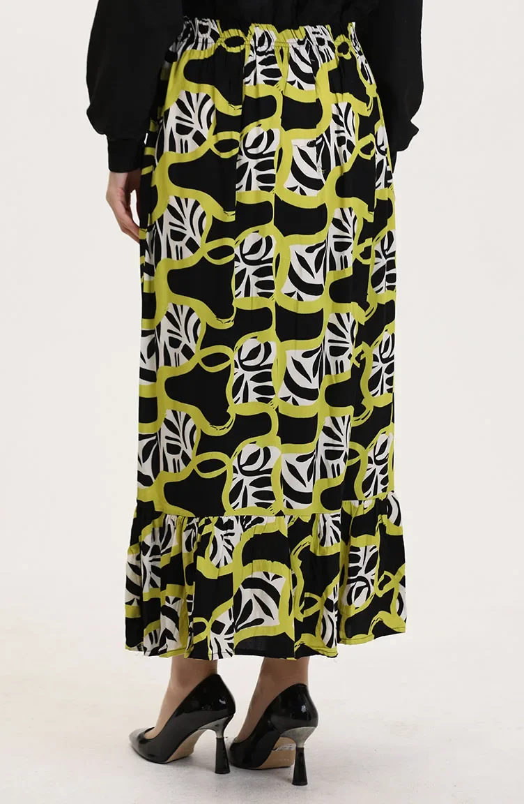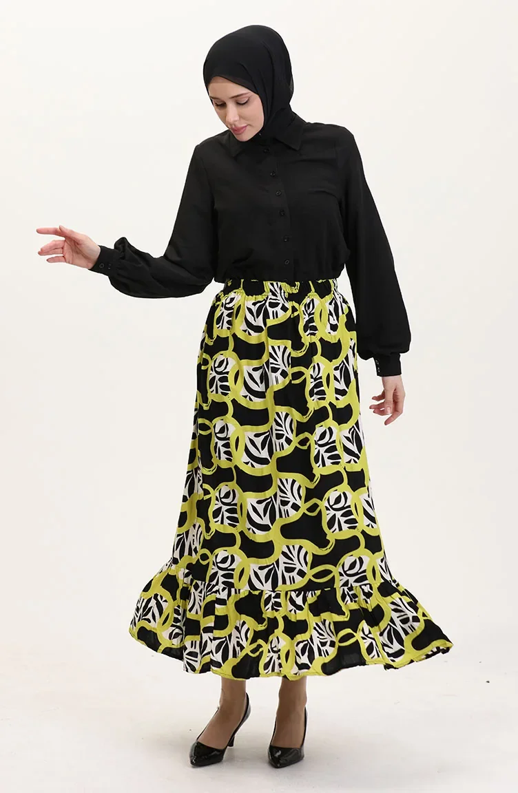 Viskon Kumaş Beli Lastikli Fırfırlı Etek 2012P-01 Siyah Yağ Yeşili